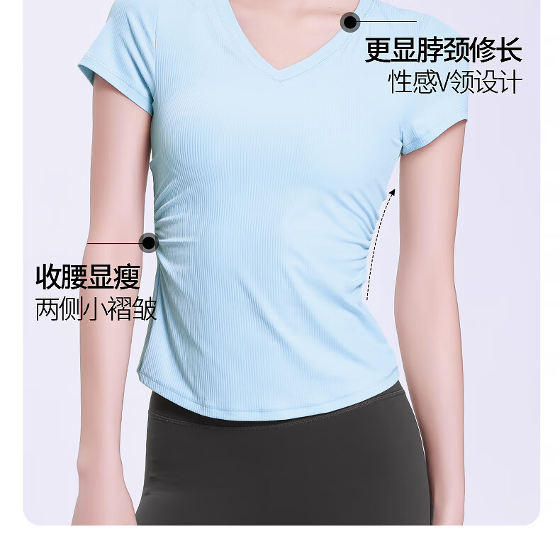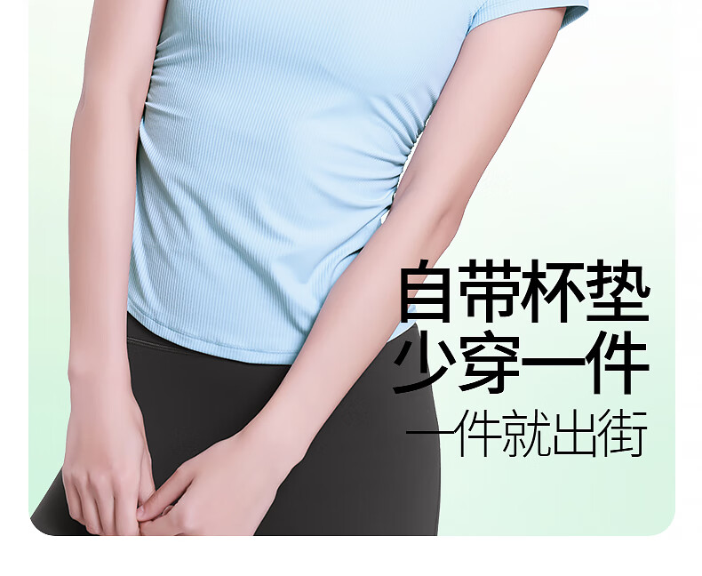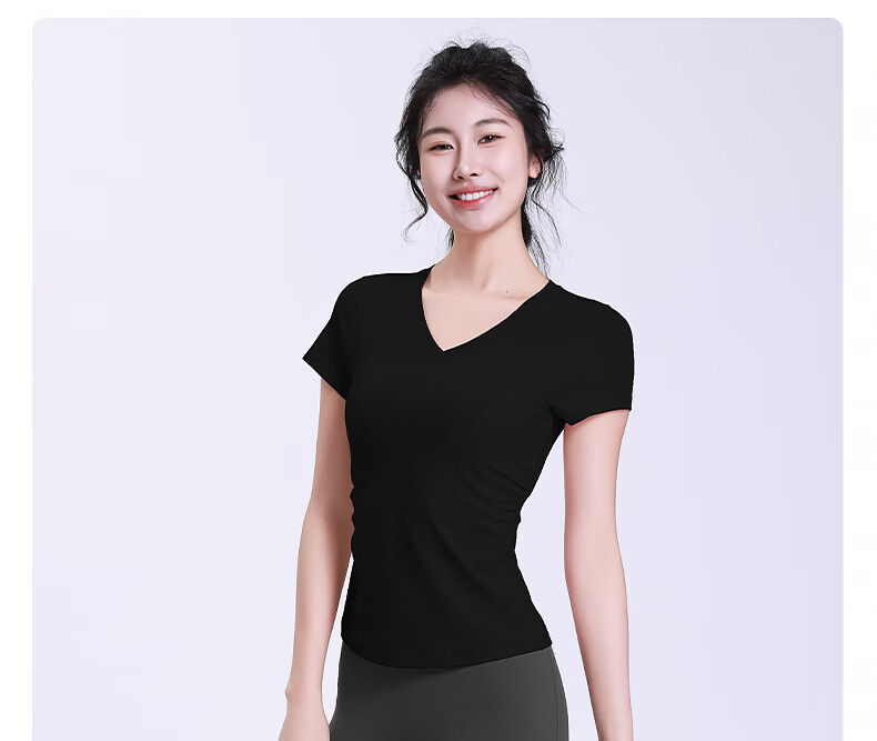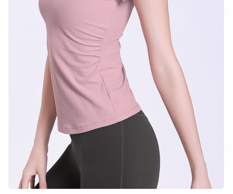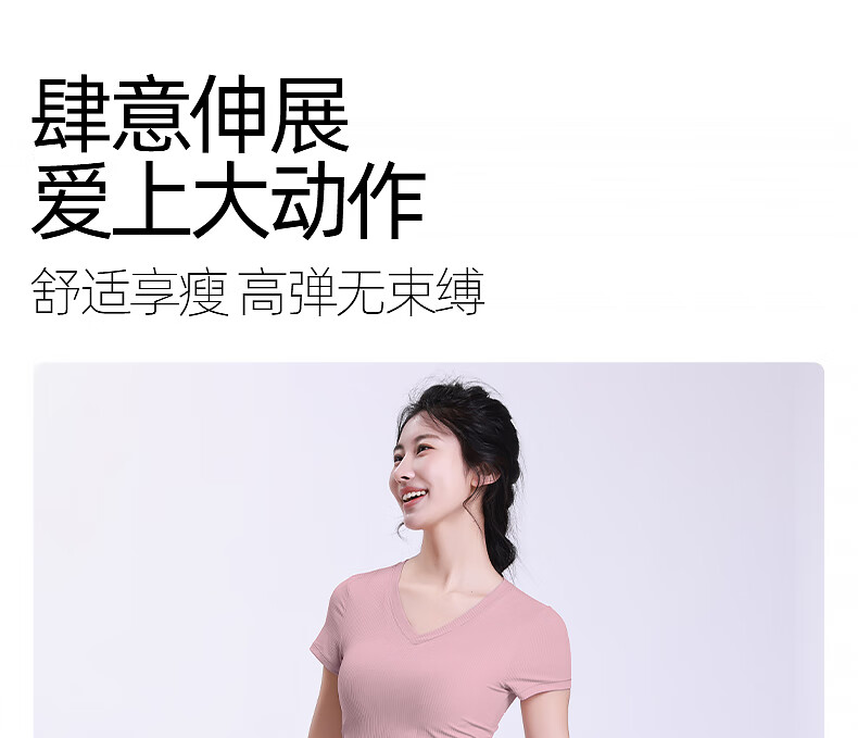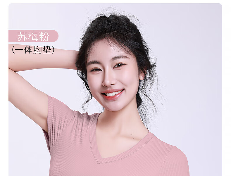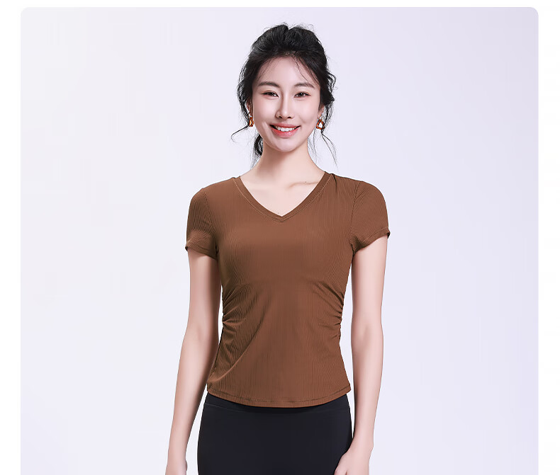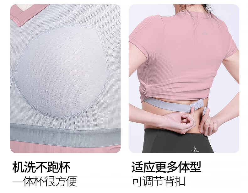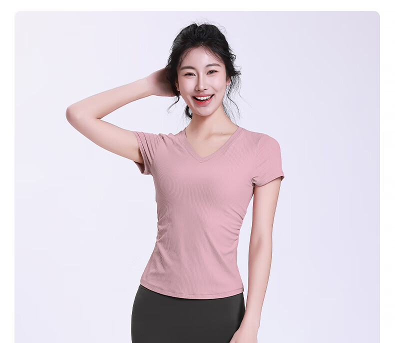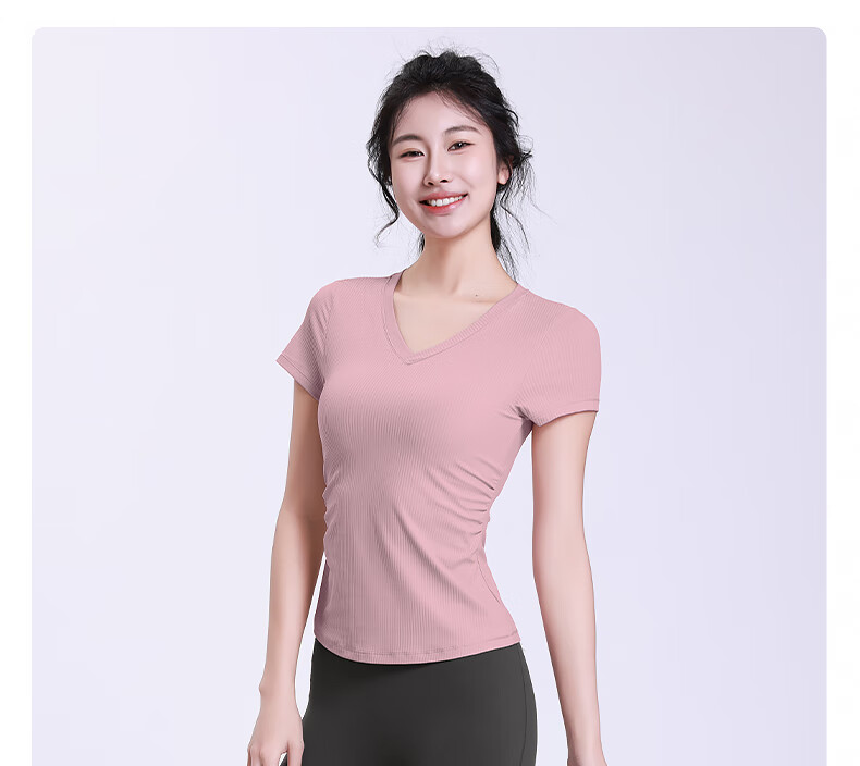 Fanmeiren yoga top with chest pad, one-piece cup, short-sleeved new T-shirt V-neck sports fitness Pilates training suit, Samui powder/one-piece chest pad XL XL