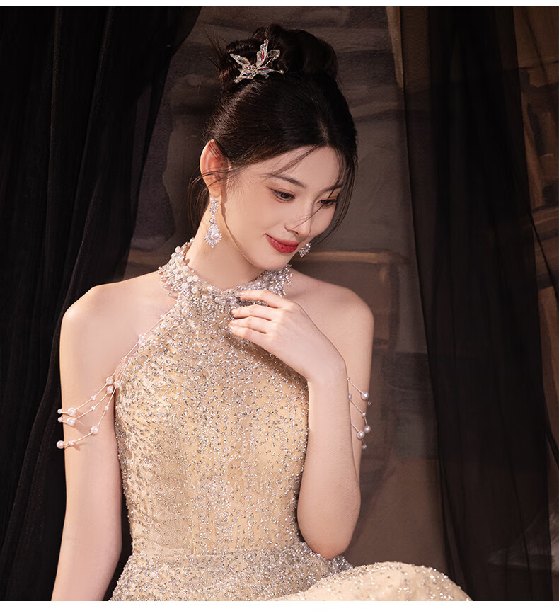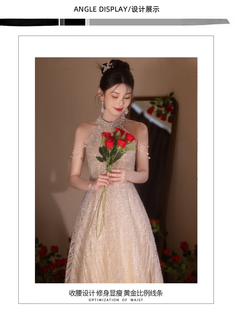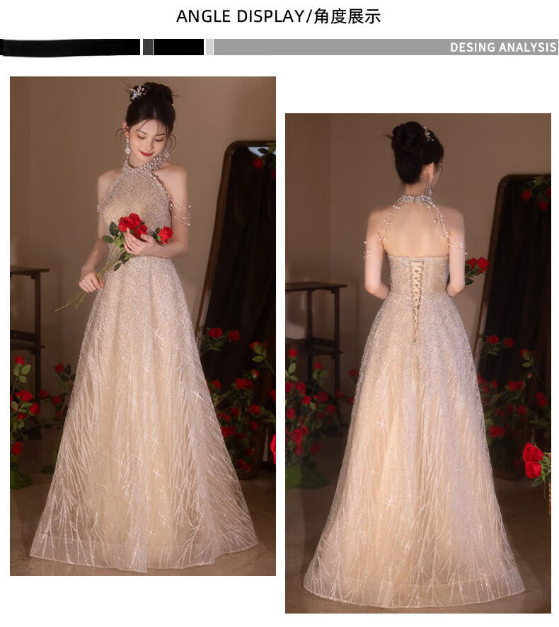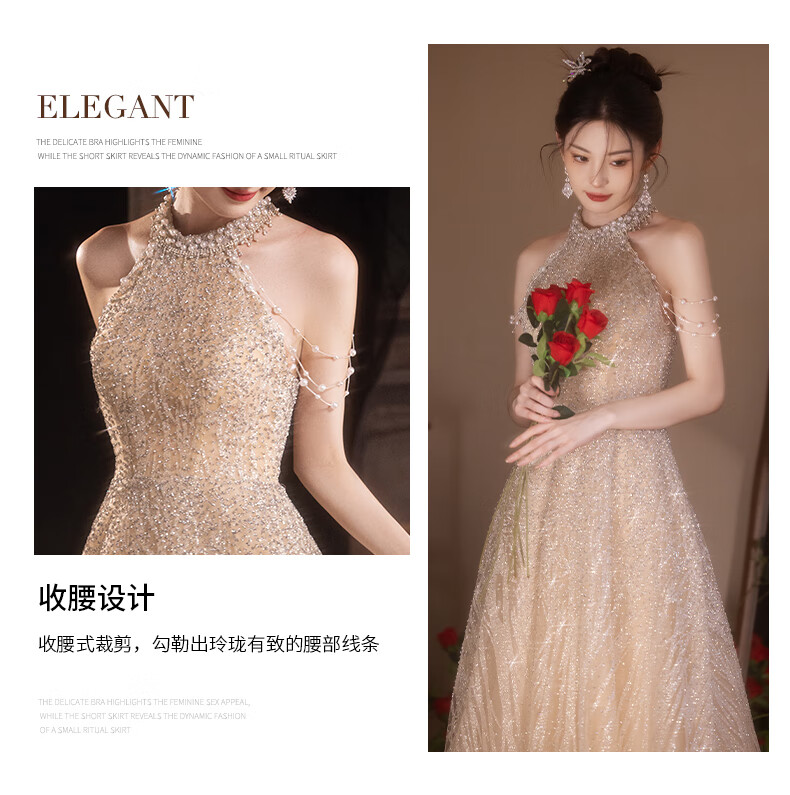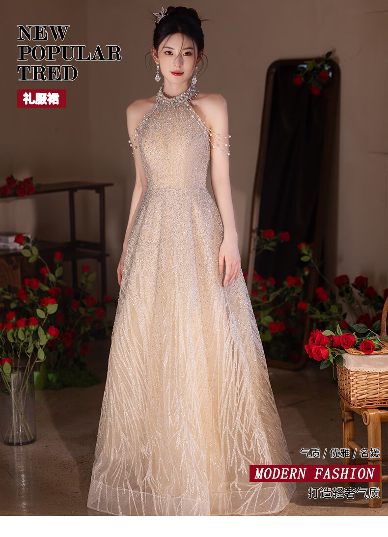Xiaohanlu halterneck evening dress annual meeting 2025 new light luxury niche temperament banquet host birthday dress champagne color M