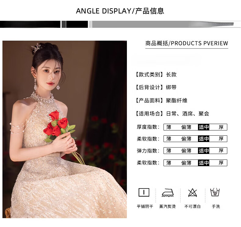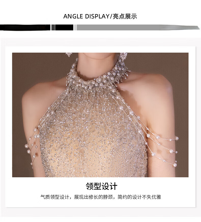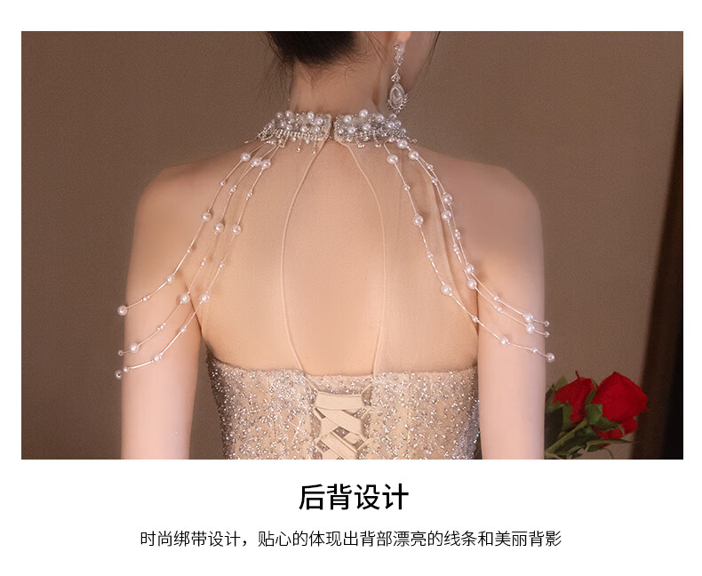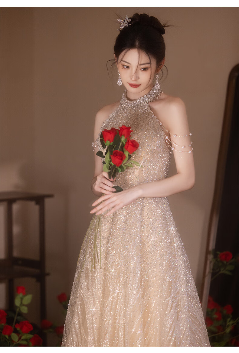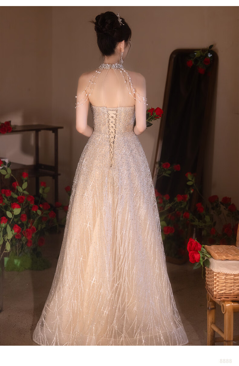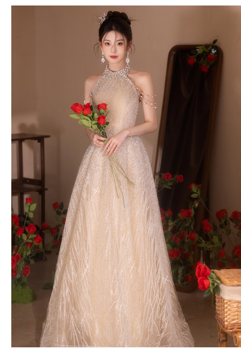 Xiaohanlu halterneck evening dress annual meeting 2025 new light luxury niche temperament banquet host birthday dress champagne color M