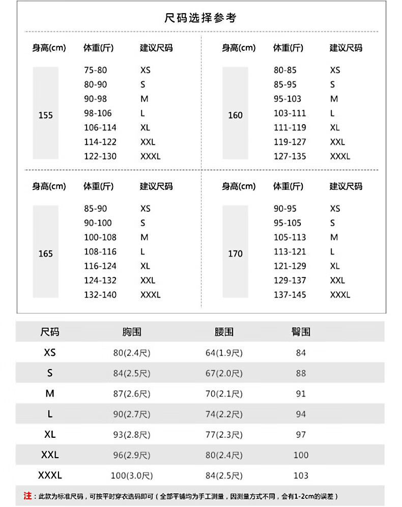 China (cm) 160-165/84-86 165-170 / 88-90 167-172 / 92-96 168-173 / 98-102 170-176 / 106-110