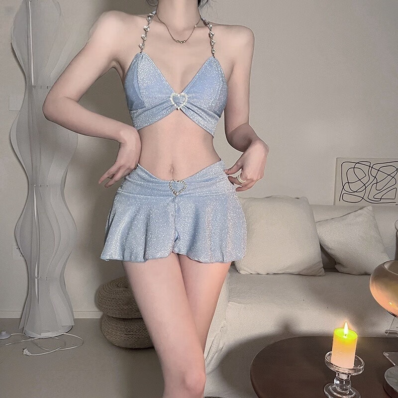 Yusi Yi Bikini Swimsuit Women's Sexy 2025 Internet Celebrity New Same Style Beach Hot Spring Wear Sunscreen Blue Broken Glitter L