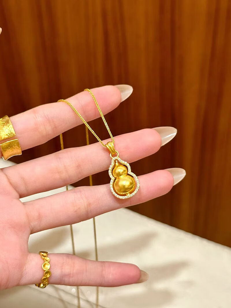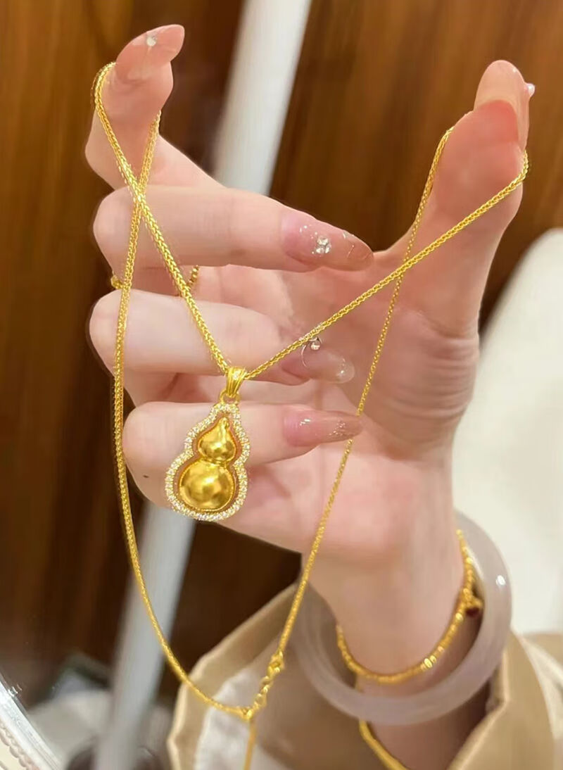 Chuxiao gold necklace 18K women's ancient gold Chopin chain 3D hard gold double-sided Fulu turning point diamond gourd pendant 2024 hot style gourd + bead chain