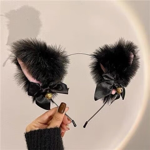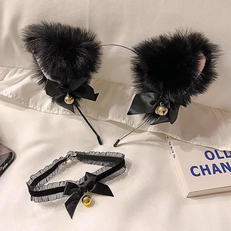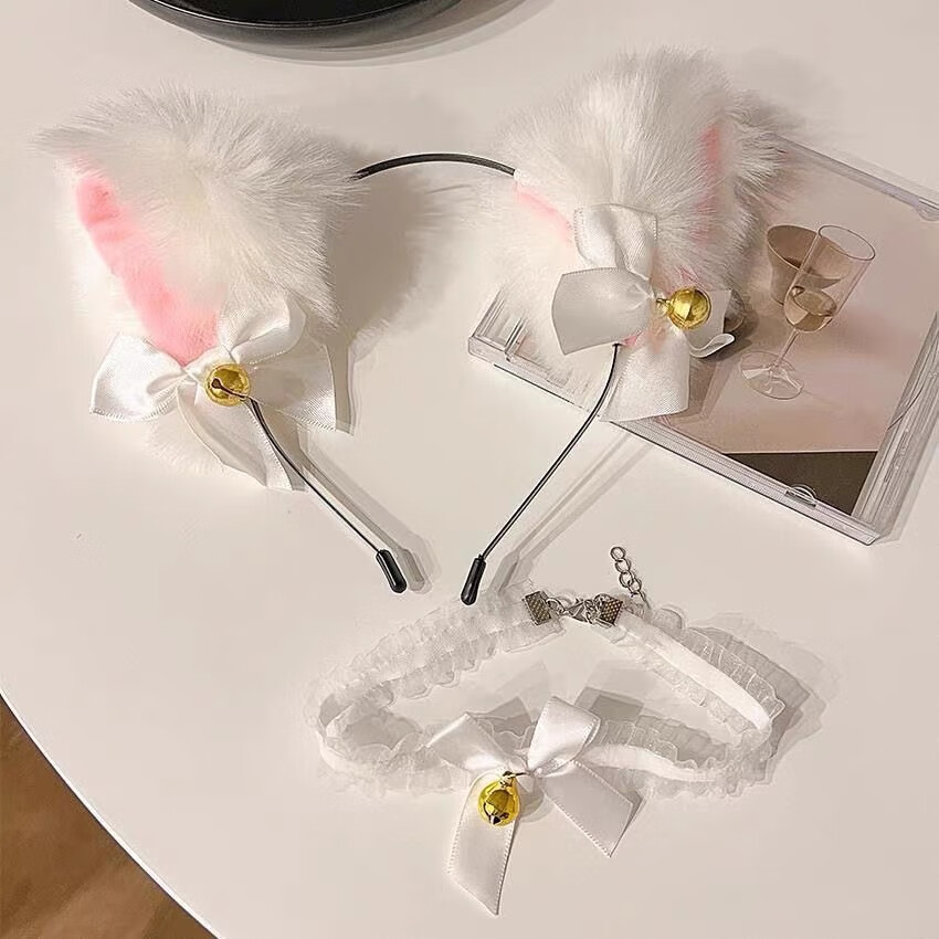 MOYAN (headband + collar) cat ear bell hairpin female wild cat rabbit hairpin headband New Year head accessories off-white (FG XL) B05-204+203
