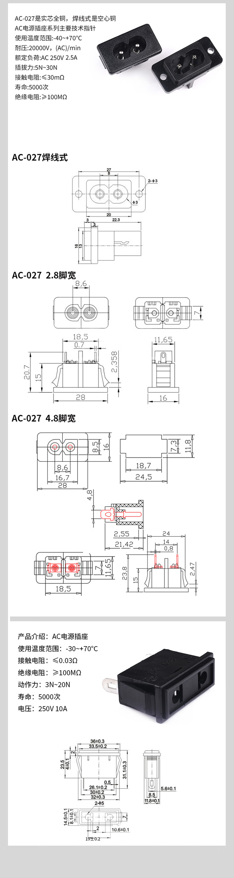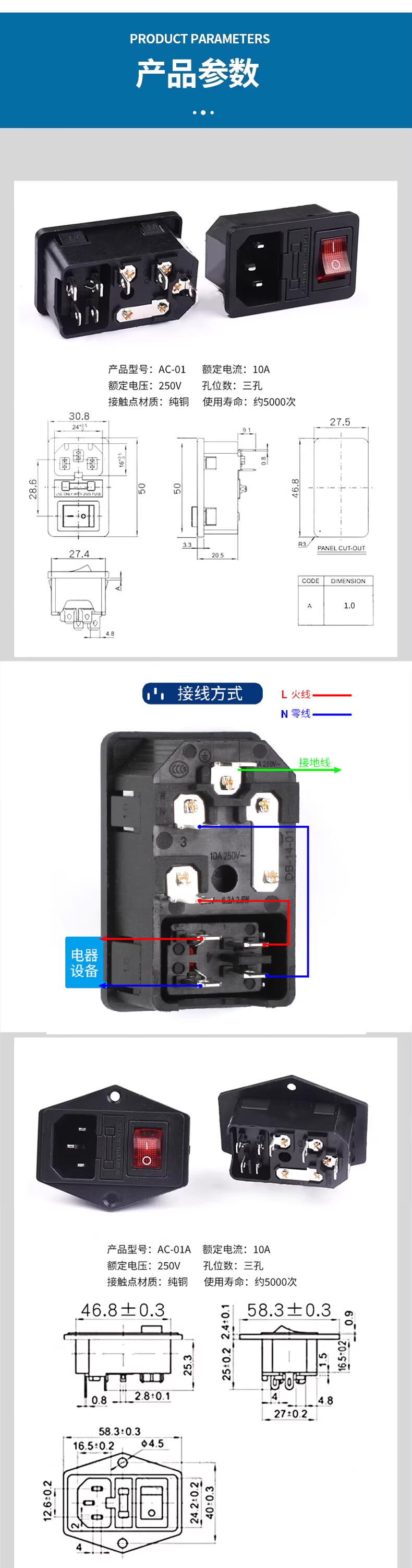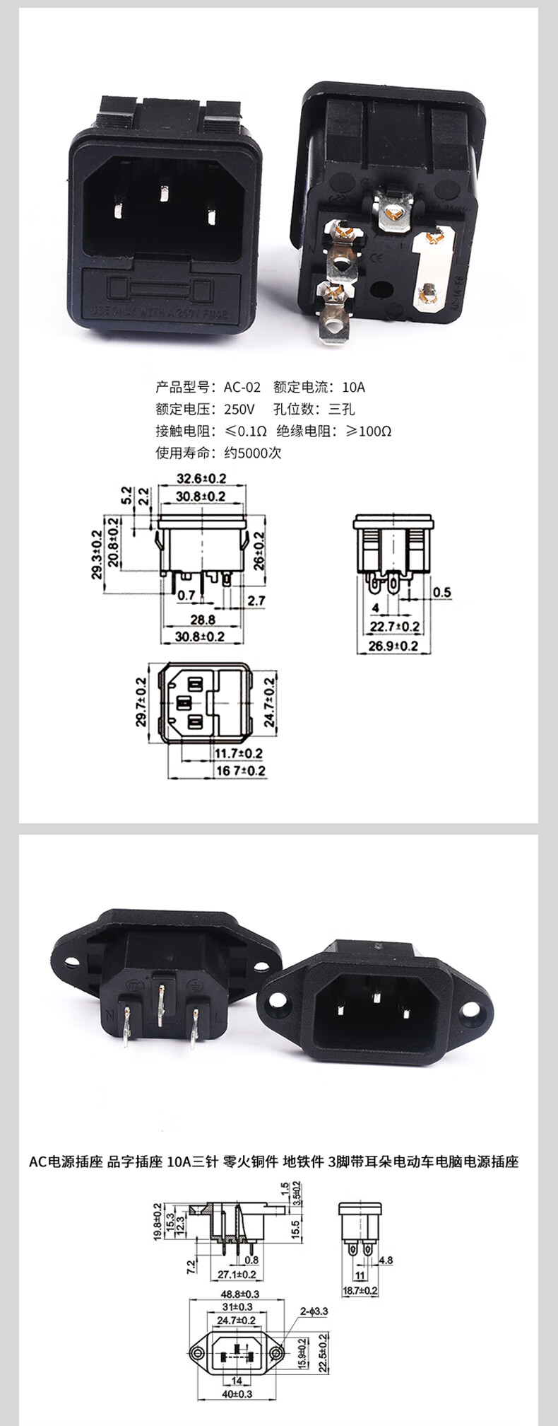 DZQJAC-01 02 03-pin socket plug male and female electric vehicle charging port AC three-pin hole power socket with light AC-05 pin-pin socket with hole copper feet (2 pcs) No Specifications