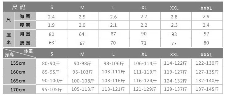 China (cm) 160-165/84-86 165-170 / 88-90 167-172 / 92-96 168-173 / 98-102 170-176 / 106-110