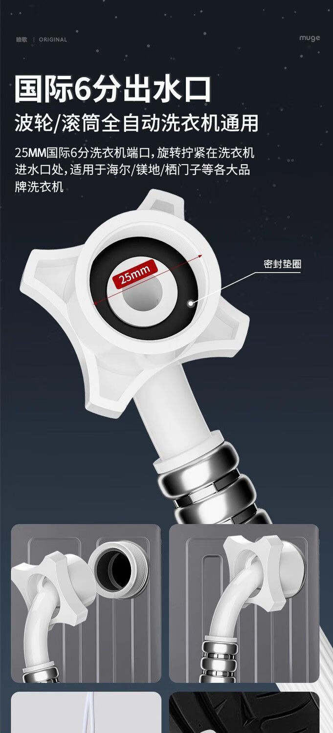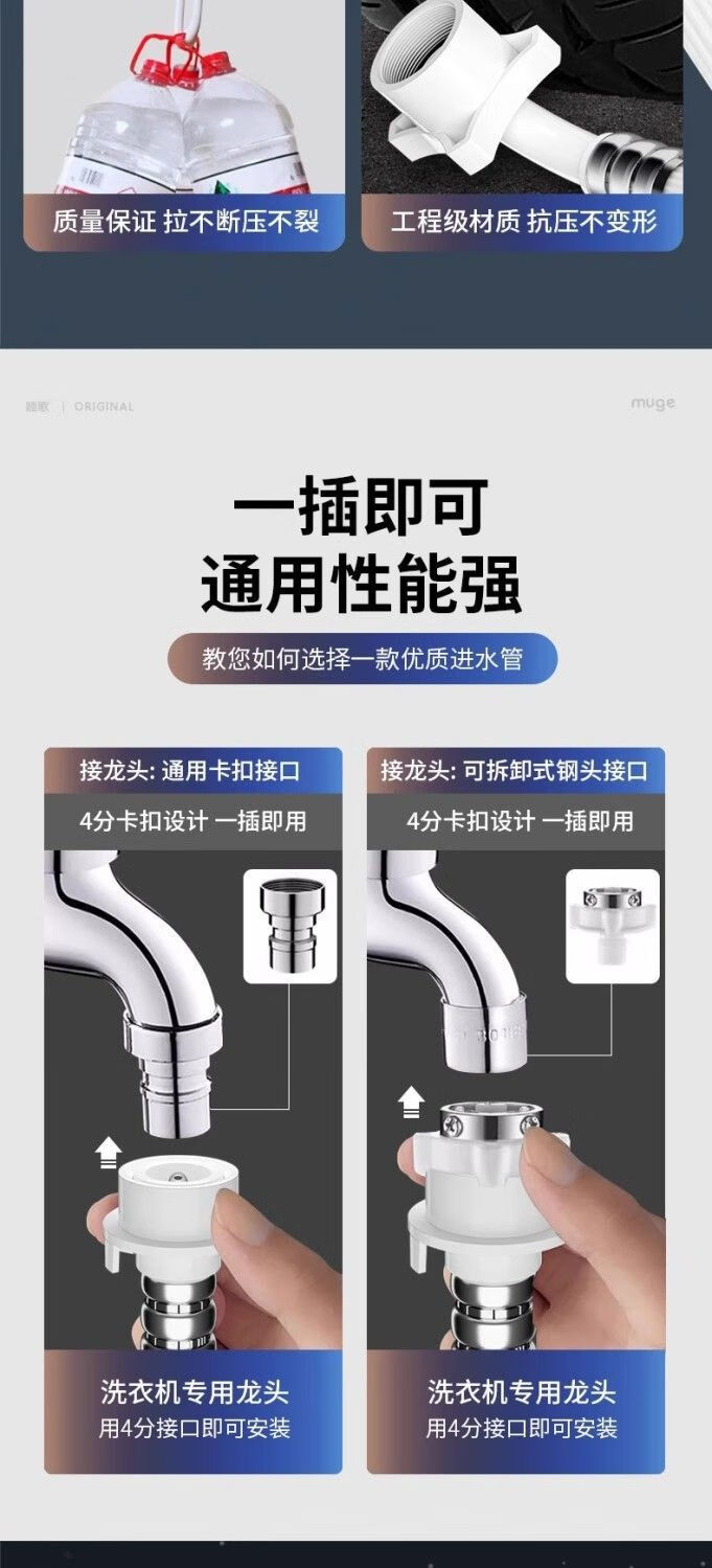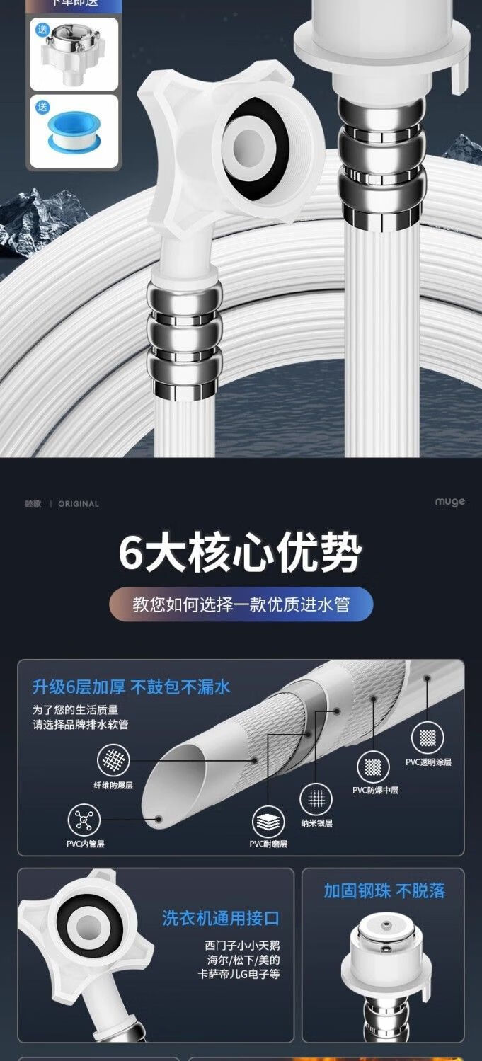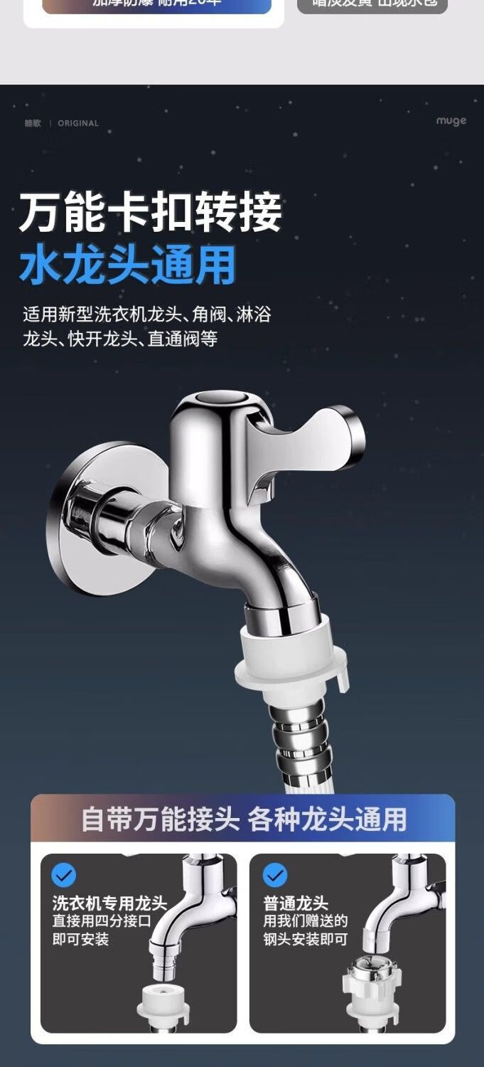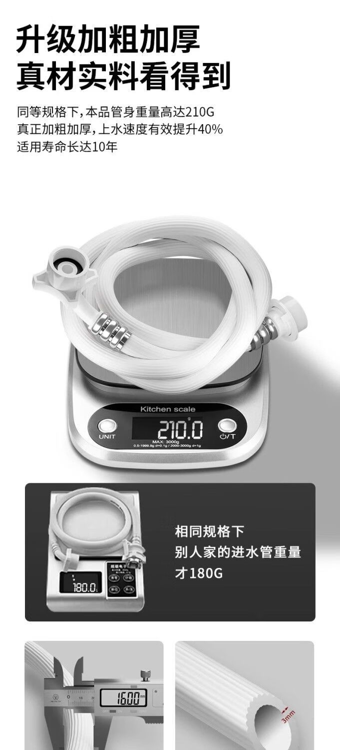 Universally used for fully automatic washing machines to connect the water inlet pipe, drum pulsator extension pipe, hose water injection pipe, thickened four-layer explosion-proof upper water pipe extension pipe interface with steel head accessories, 2-meter thickened four-layer water inlet pipe, free universal adapter + raw material belt