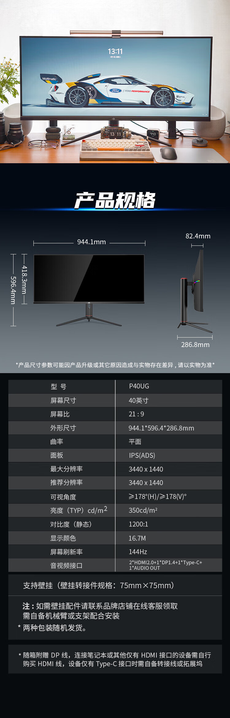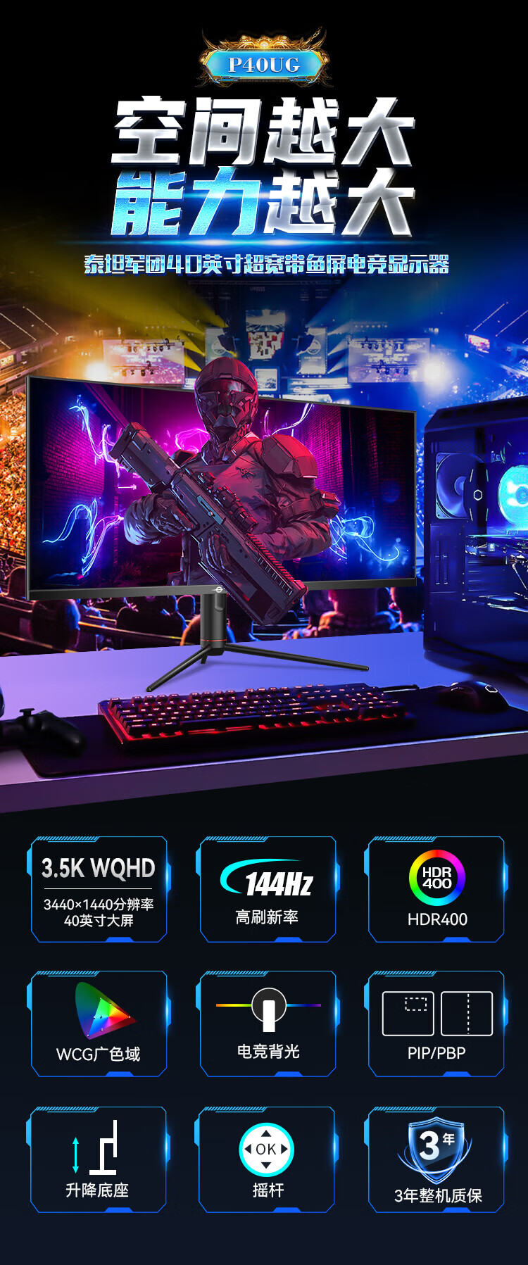 Titan Legion 40-inch hairtail screen WQHD quasi-4K 144Hz IPS HDR400 wide color gamut built-in speakers rotating lift smart split-screen gaming computer monitor P40UG original DP cable 15% national subsidy
