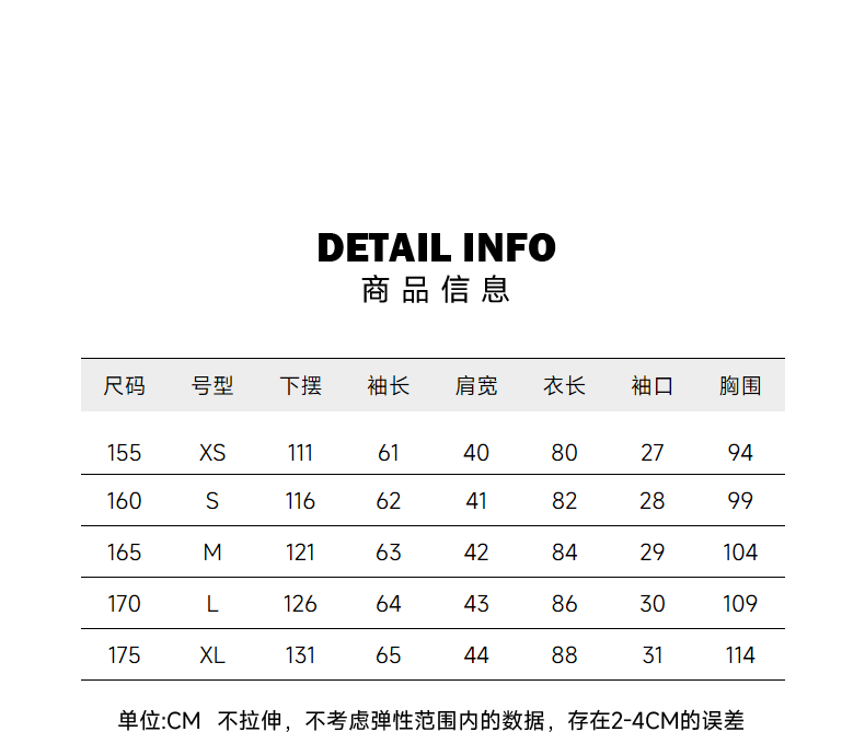 China (cm) 160-165/84-86 165-170 / 88-90 167-172 / 92-96 168-173 / 98-102 170-176 / 106-110