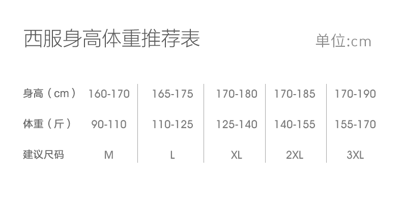 China (cm) 160-165/84-86 165-170 / 88-90 167-172 / 92-96 168-173 / 98-102 170-176 / 106-110
