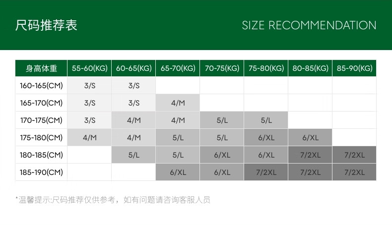 China (cm) 165 / 88-90 170 / 96-98 175 / 108-110 180 / 118-122 185 / 126-130