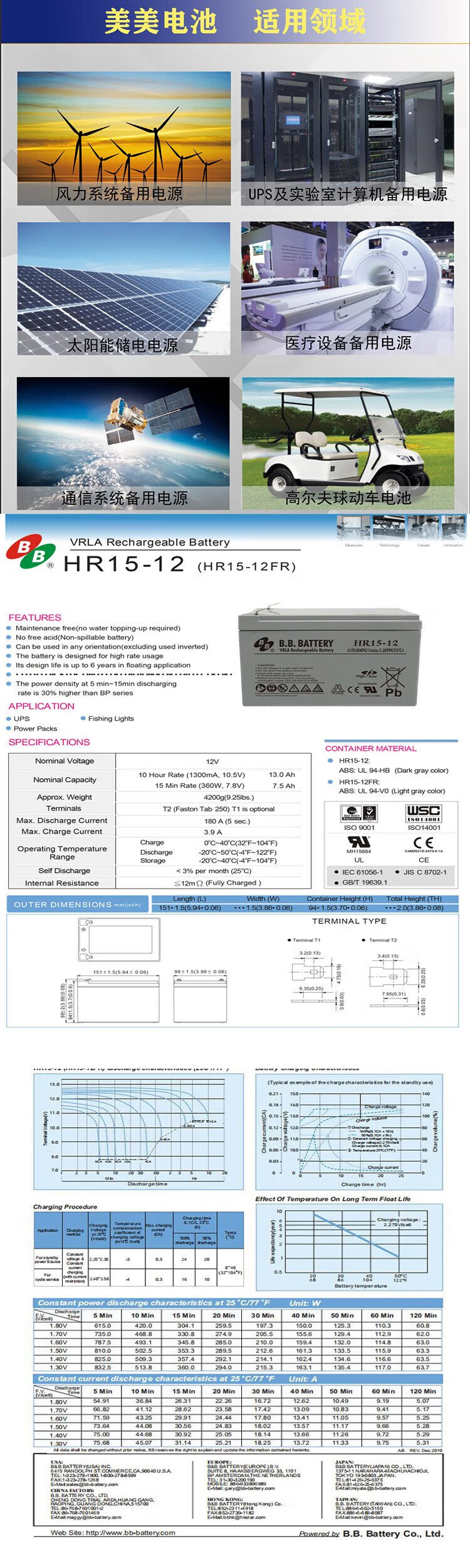 B.B.BATTERY Meimei battery HR15-12FR backup battery HB flame retardant gray 12V13Ah