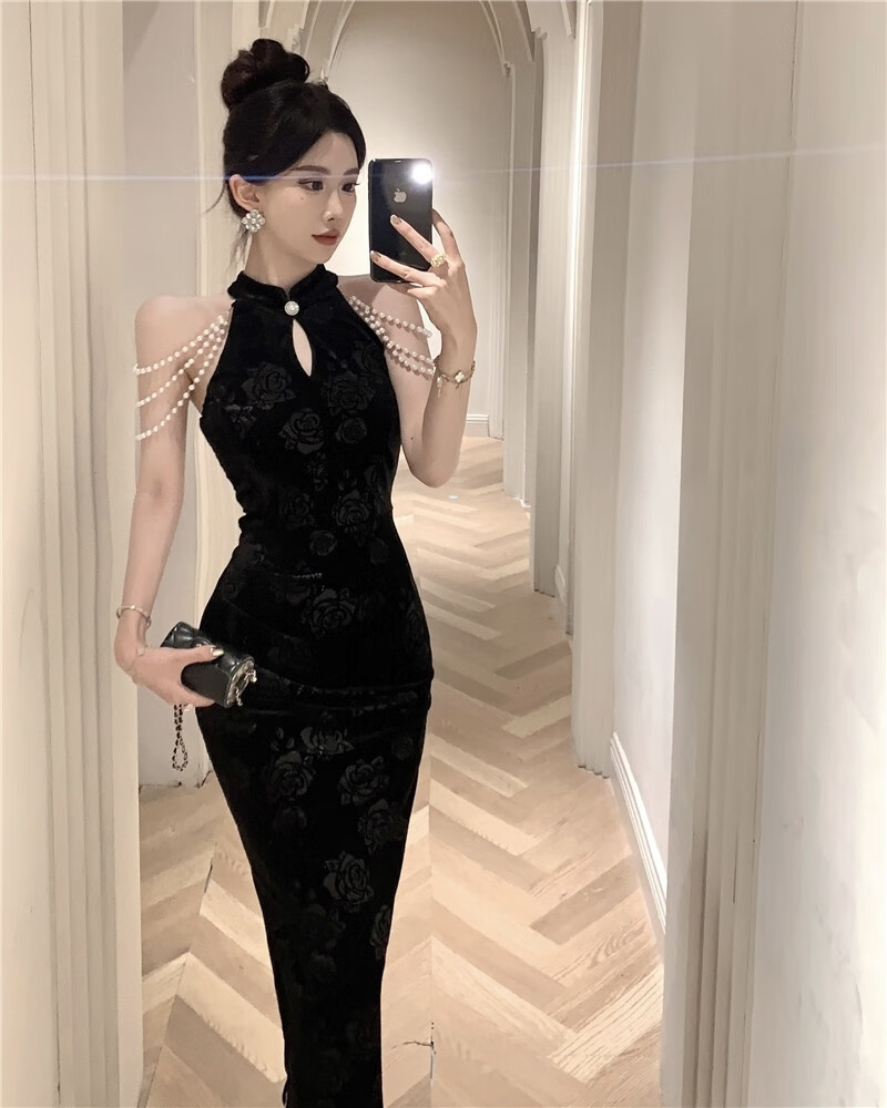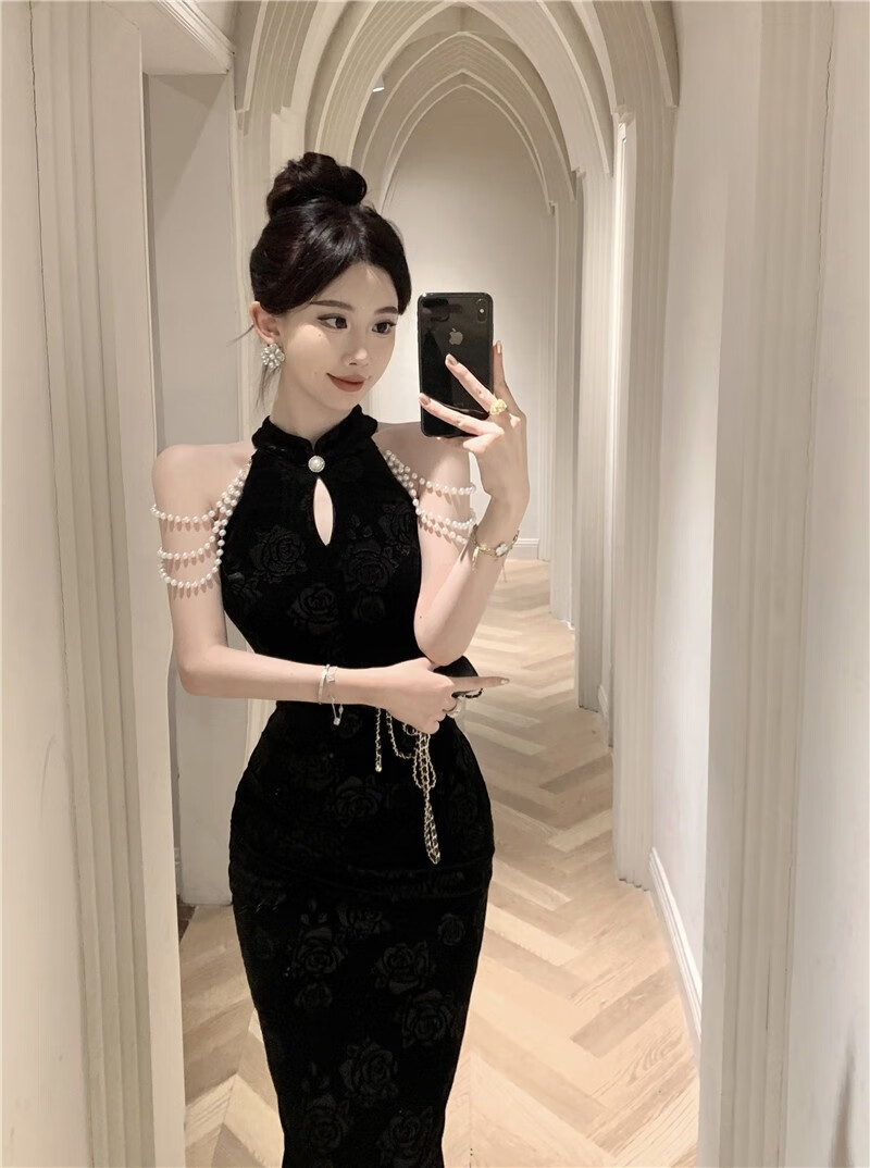 Yujiyu black skirt small evening dress banquet dress slim fishtail cheongsam dress black S recommended 80-93Jin Jin equals 0.5 kg