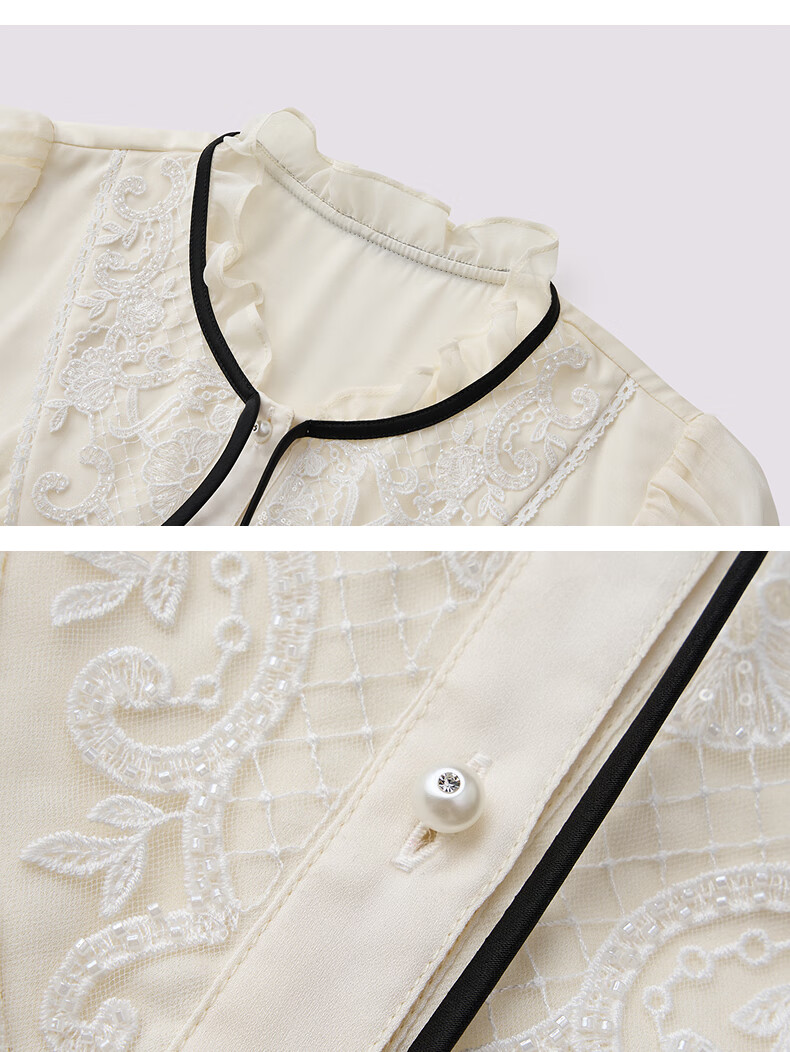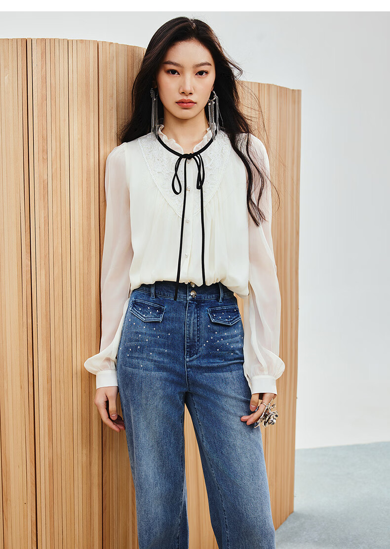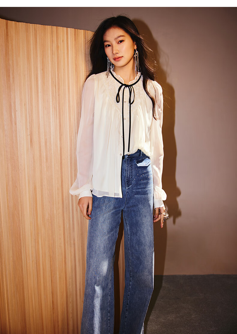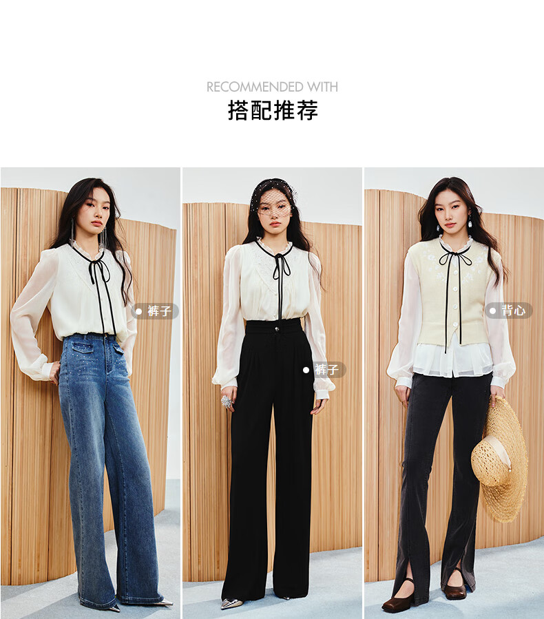 MAXRIENY French embroidered collar bow tie shirt slim fit top for women in white M
