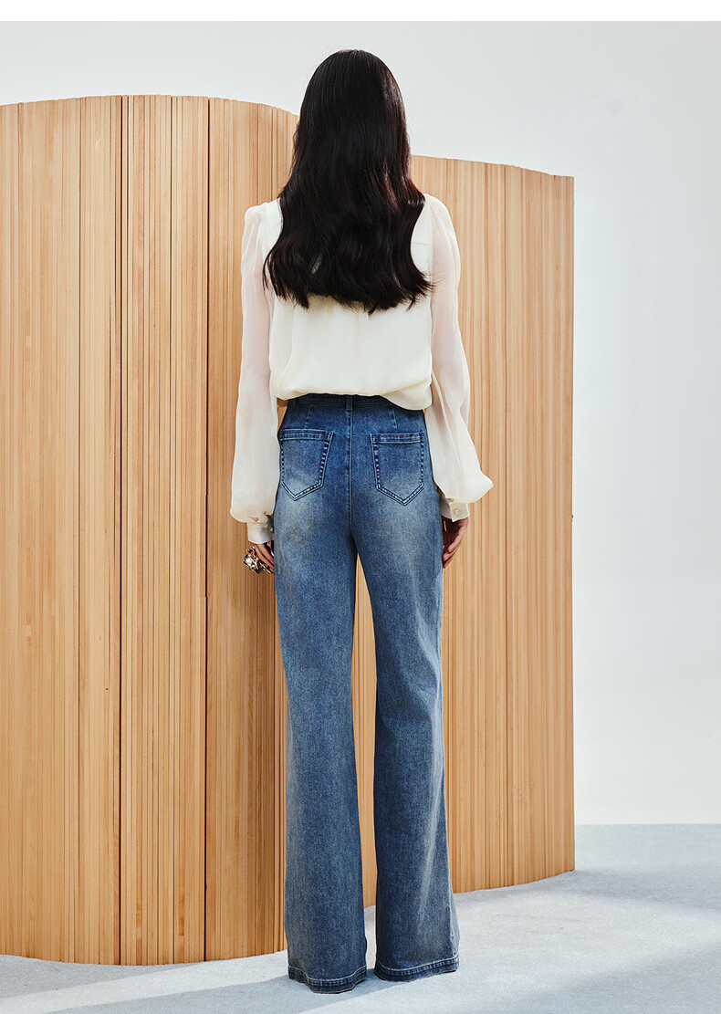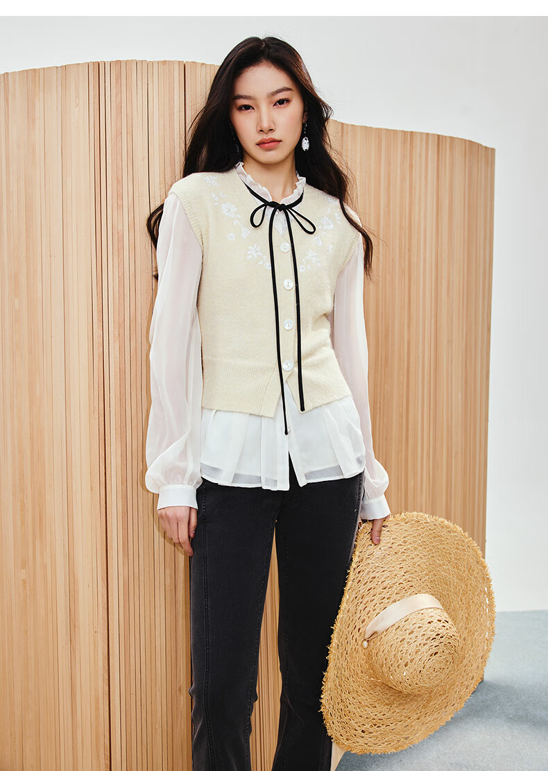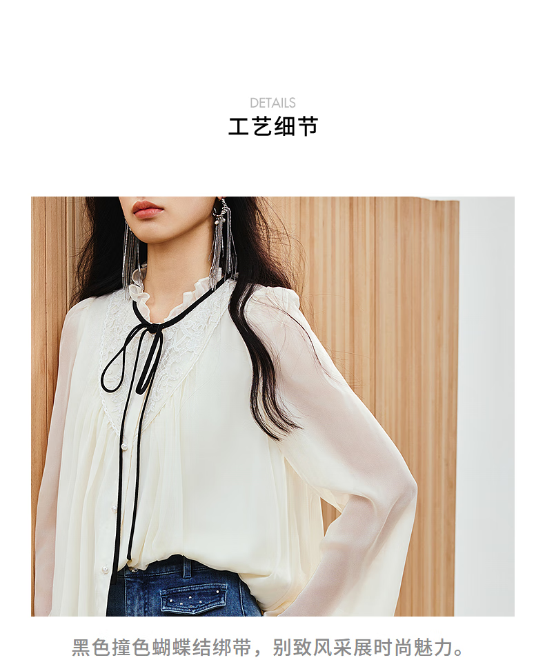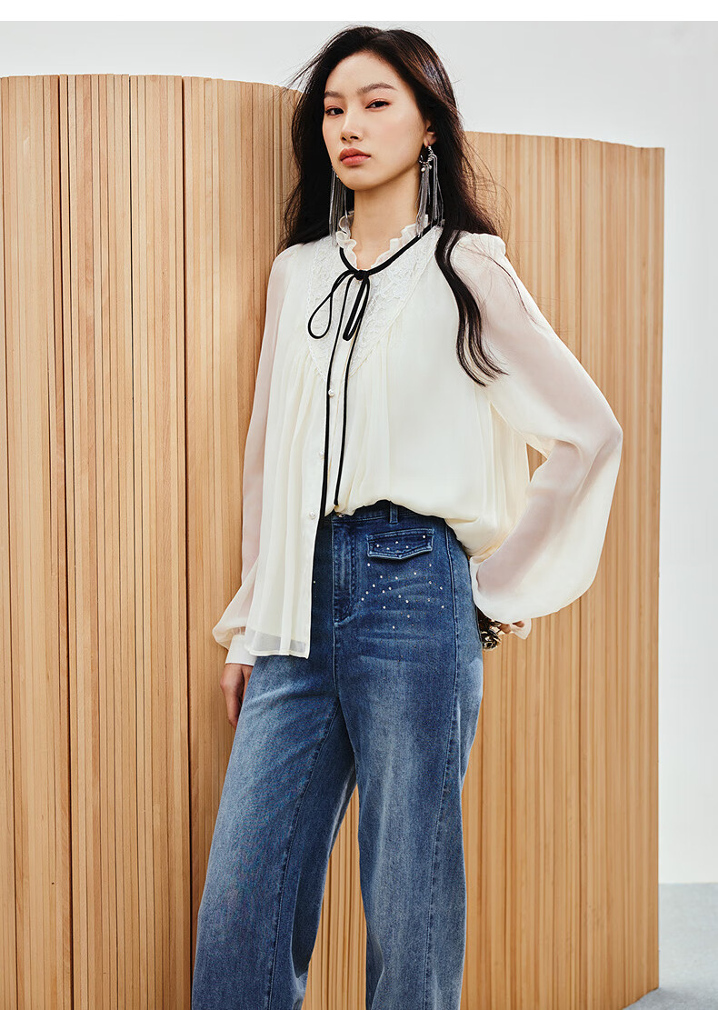 MAXRIENY French embroidered collar bow tie shirt slim fit top for women in white M