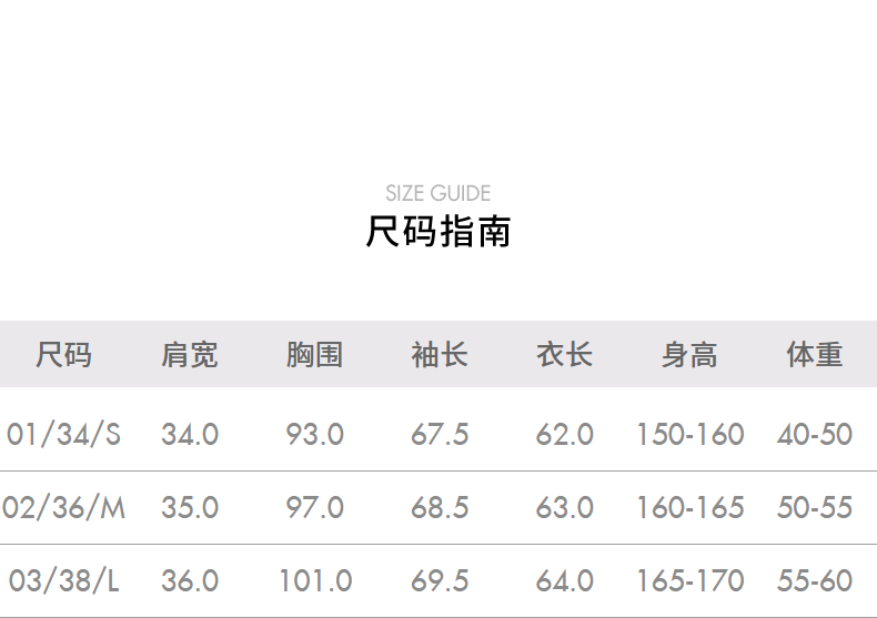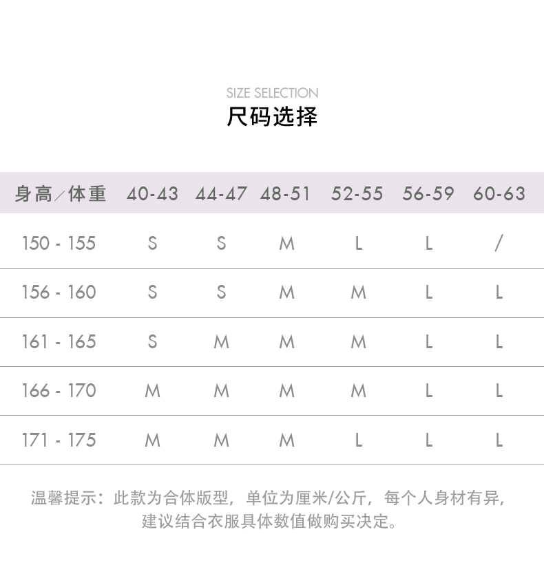 China (cm) 160-165/84-86 165-170 / 88-90 167-172 / 92-96 168-173 / 98-102 170-176 / 106-110