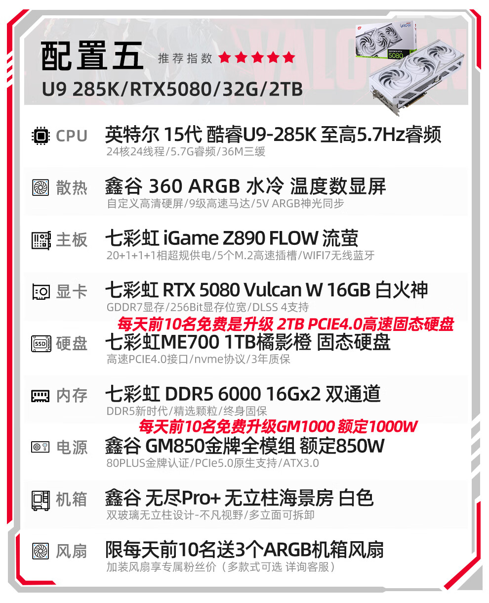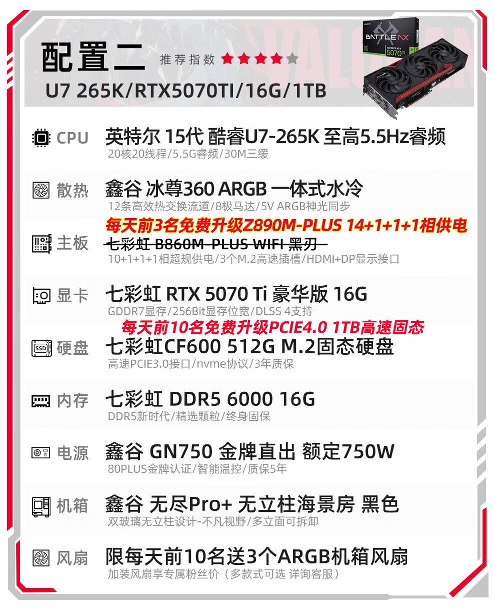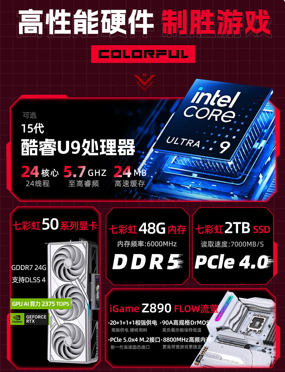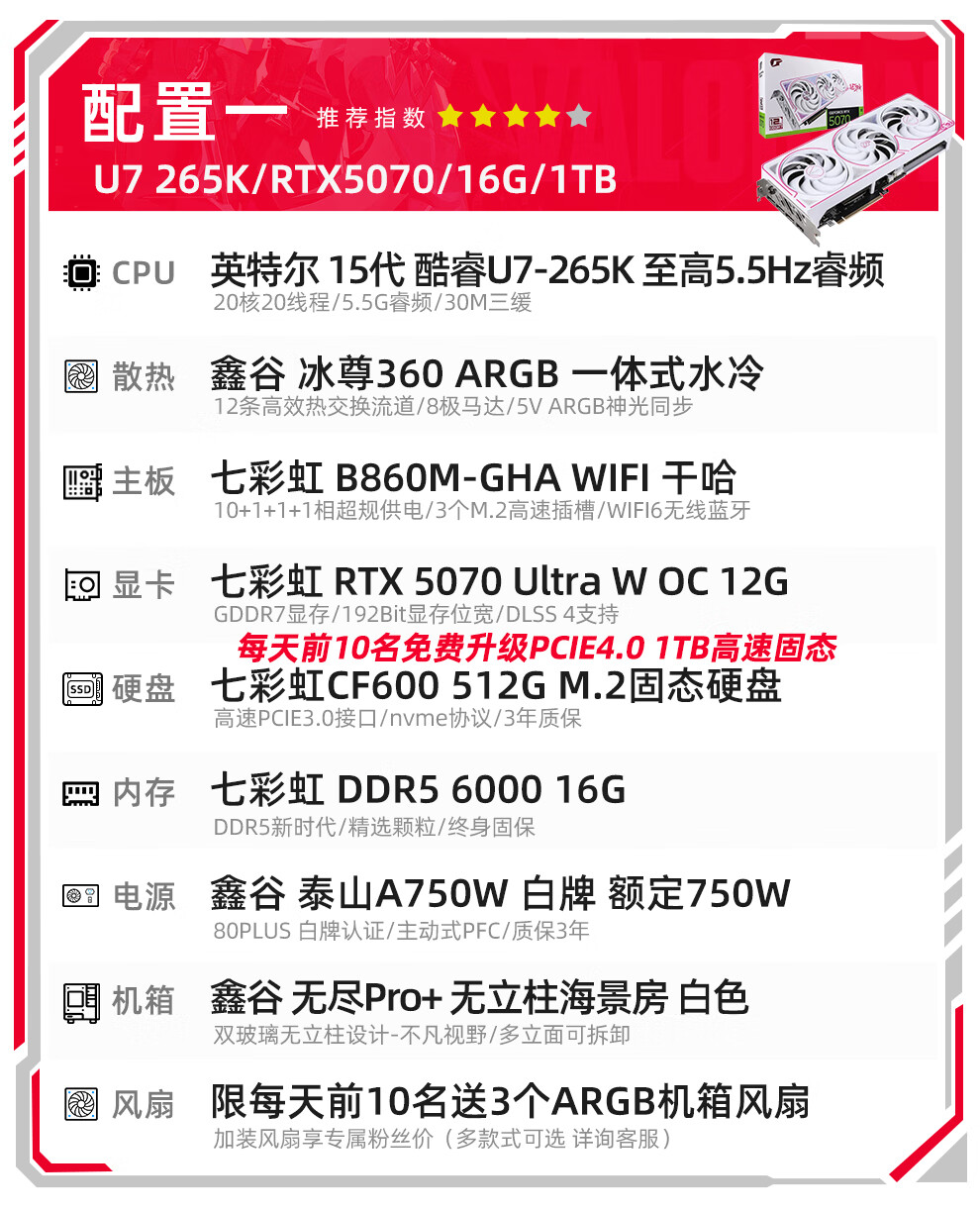 Colorful Core 15th generation U7 265K RTX5060TI/5070TI/5080 5090D graphics card E-sports game Black Myth Wukong AI designed desktop computer assembly machine with three U7 265K丨1TB丨5080 Official new guarantee