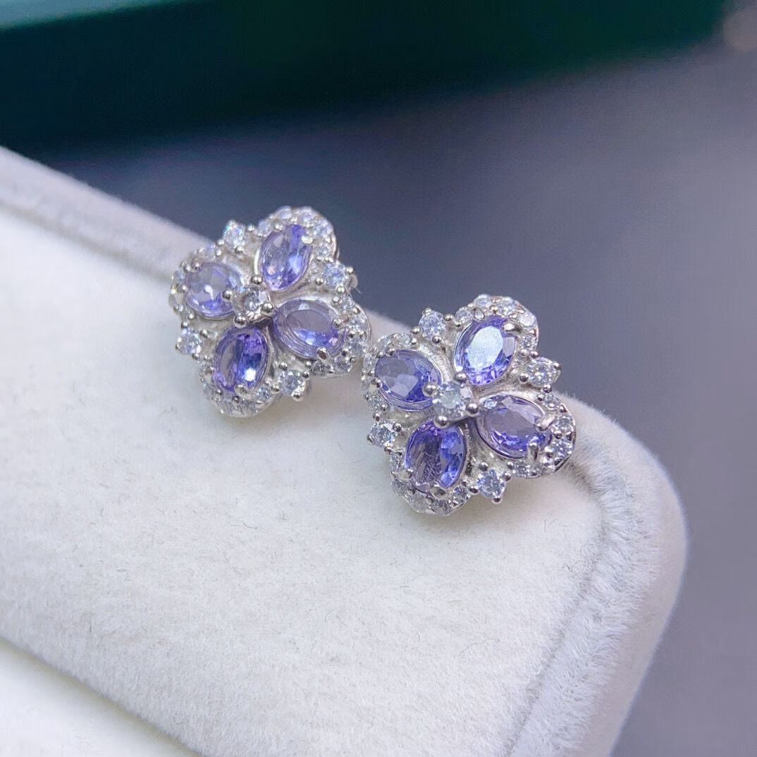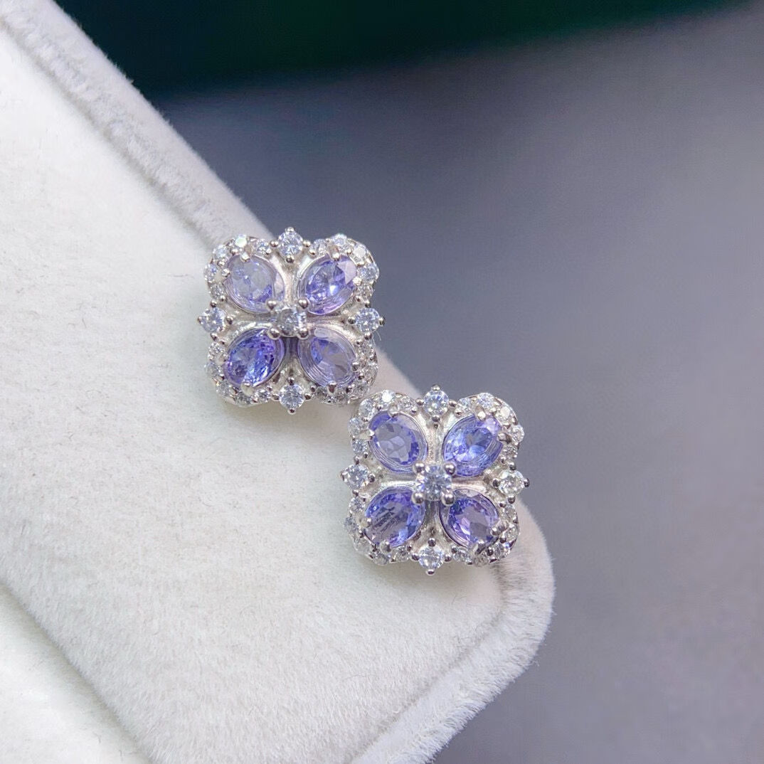 Shilian Japanese and Korean jewelry micro-encrusted natural tanzanite color four-leaf flower small earrings for women's daily versatile silver needles with white gold base