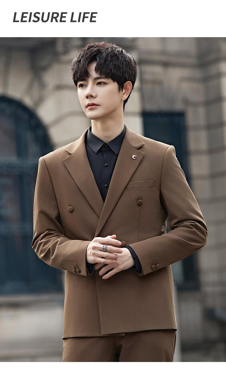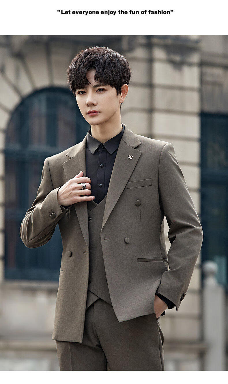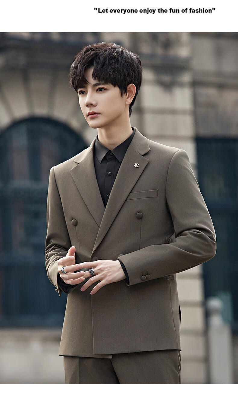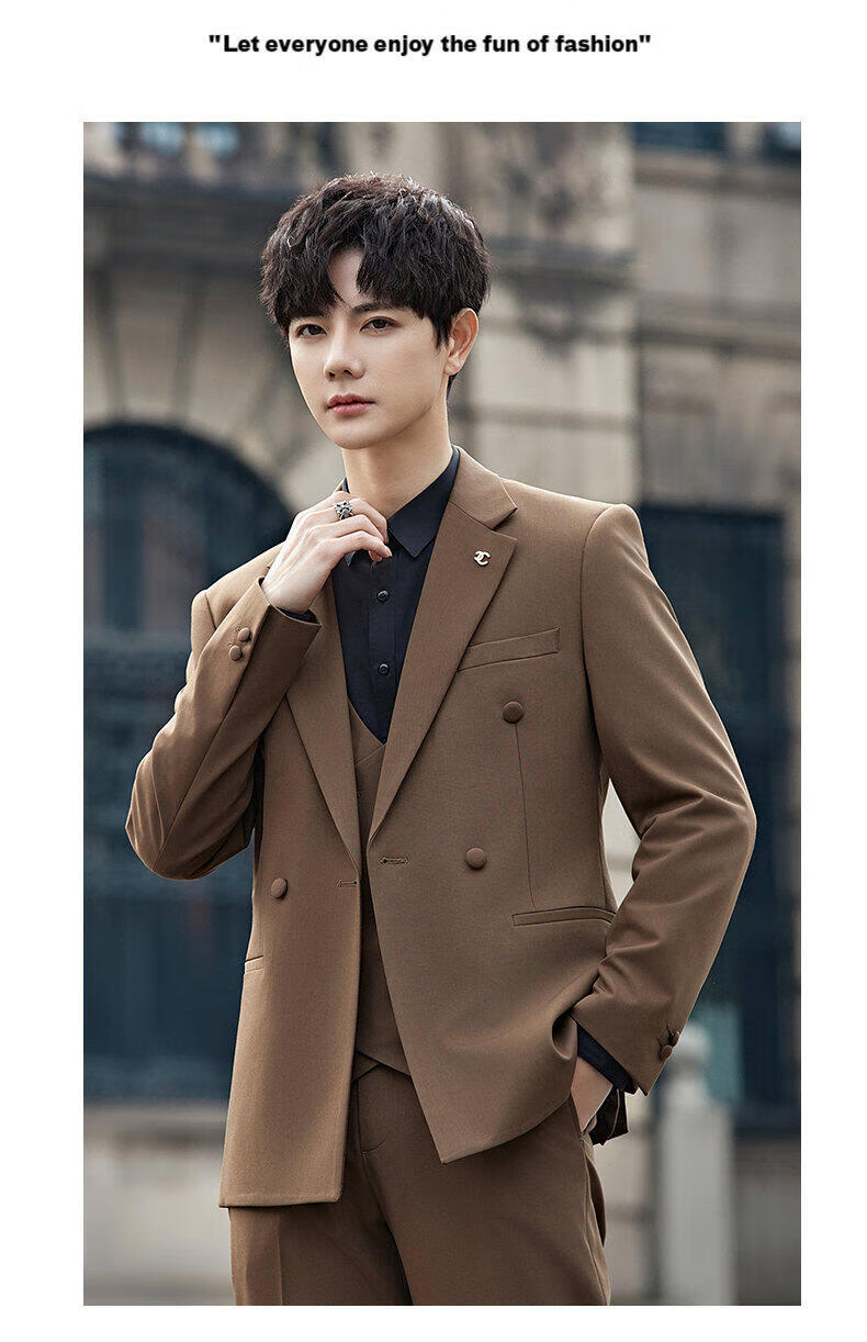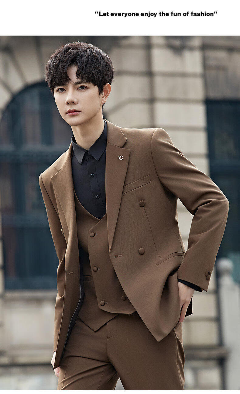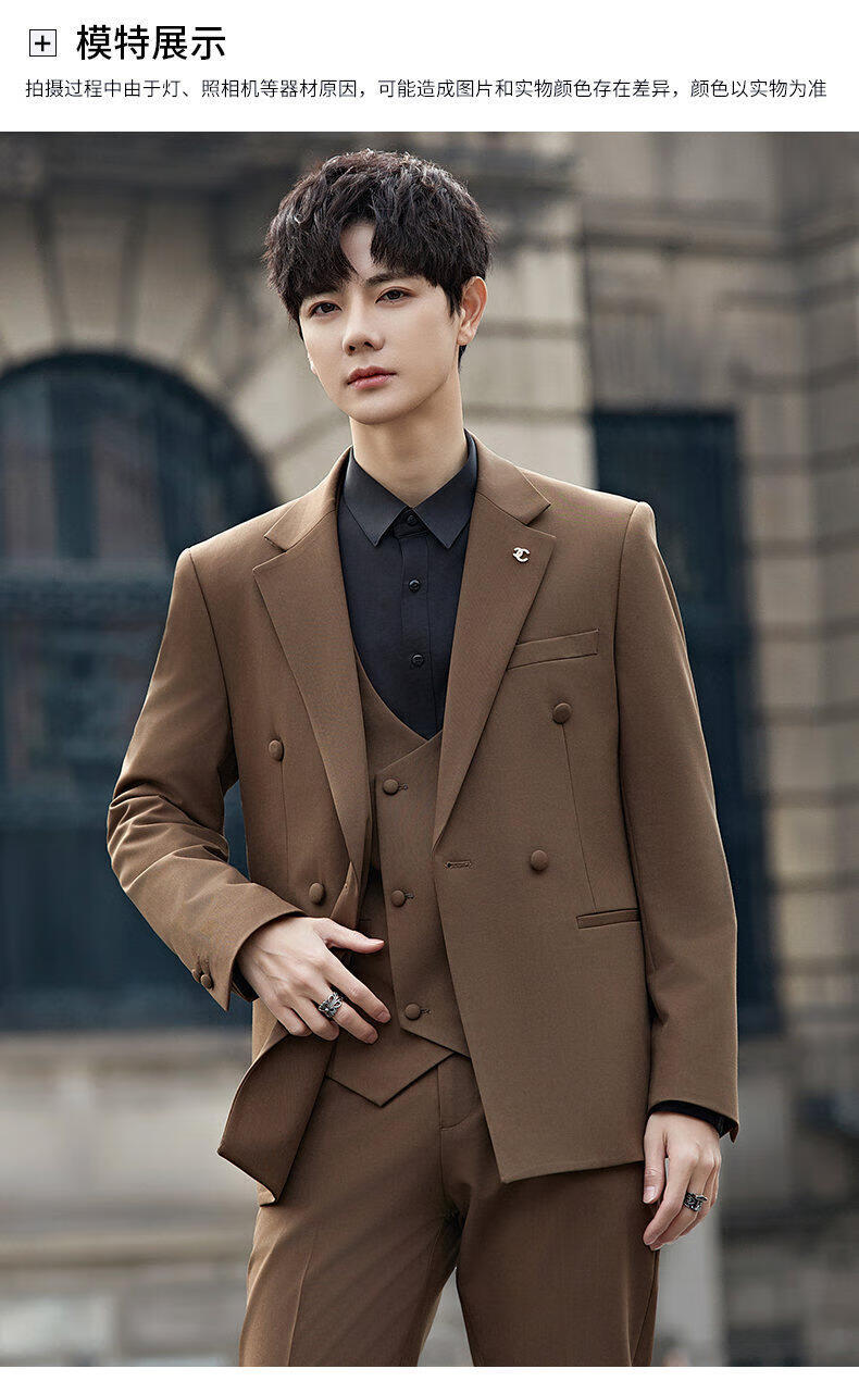 ROMON Groom's Suit Men's Suit Wedding Dress British Double-breasted Suit Korean Style Slim Business Casual Formal Wear Fashion Brown Suit+Trousers XL