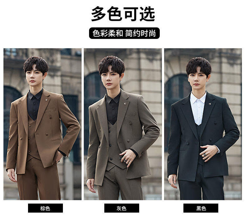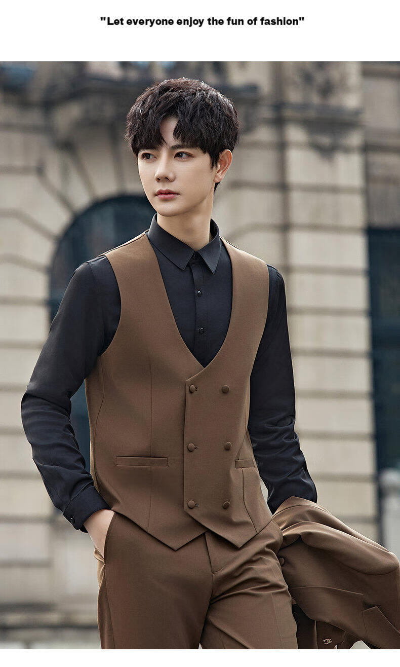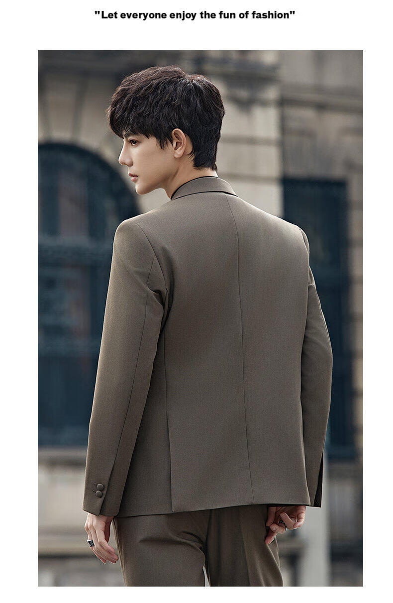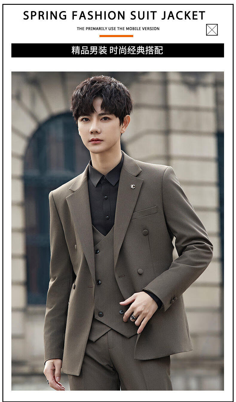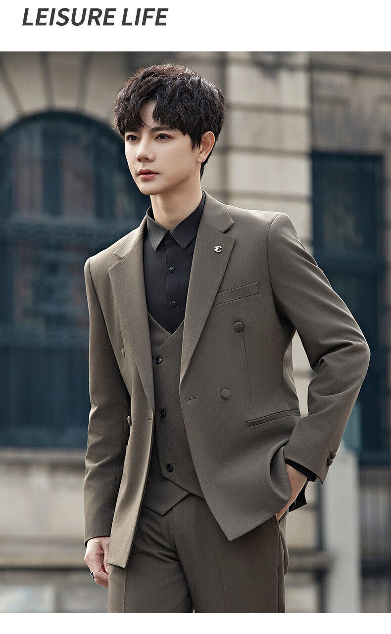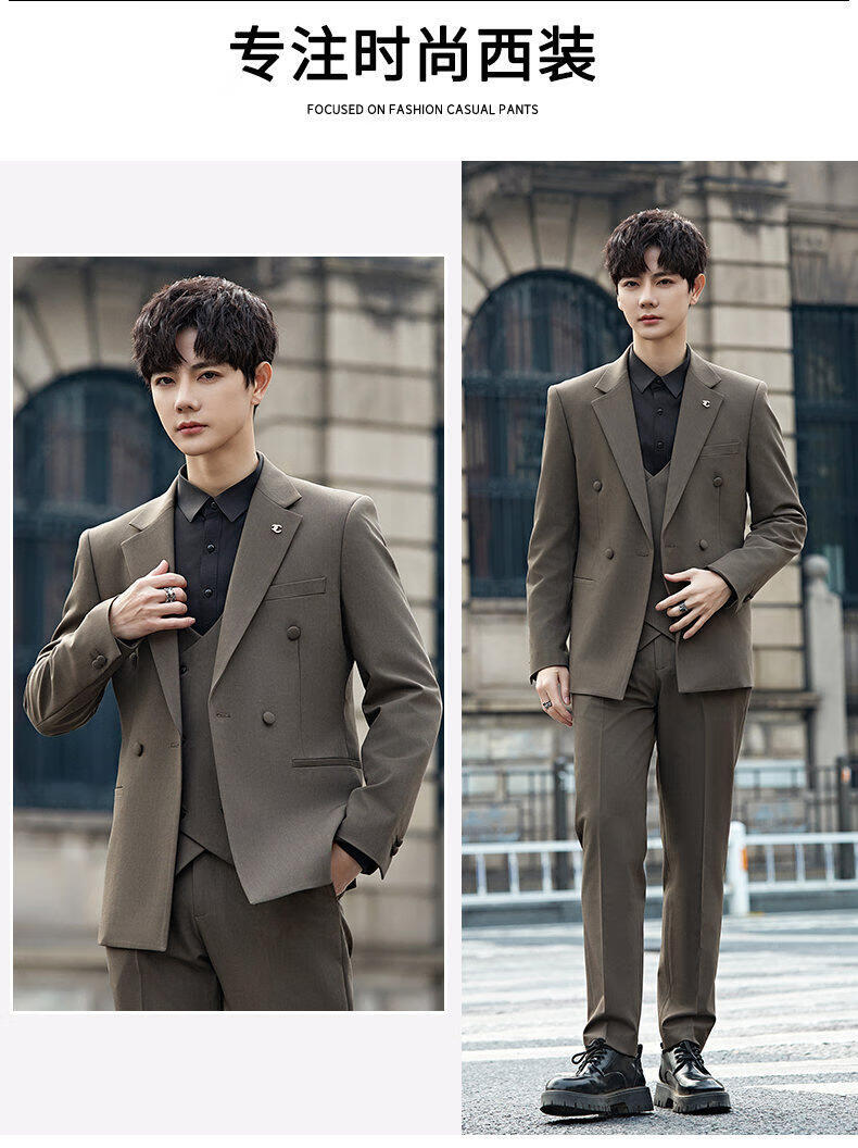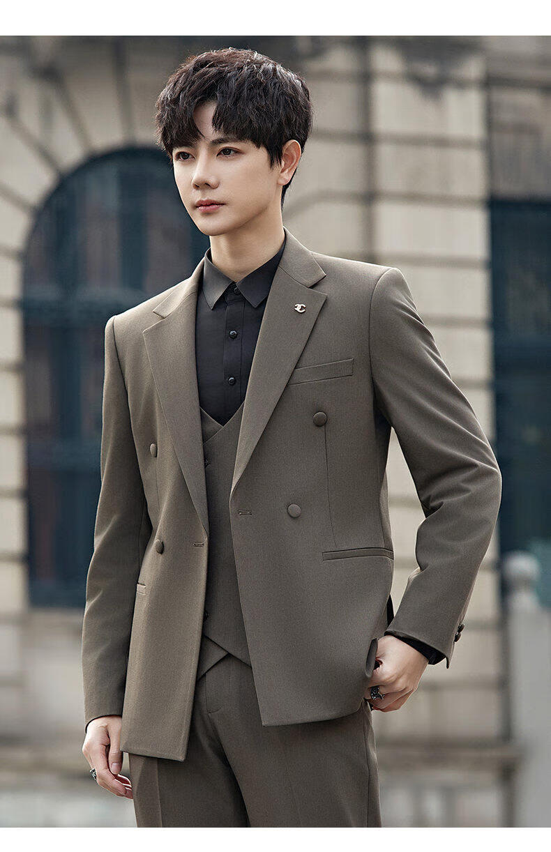 ROMON Groom's Suit Men's Suit Wedding Dress British Double-breasted Suit Korean Style Slim Business Casual Formal Wear Fashion Brown Suit+Trousers XL