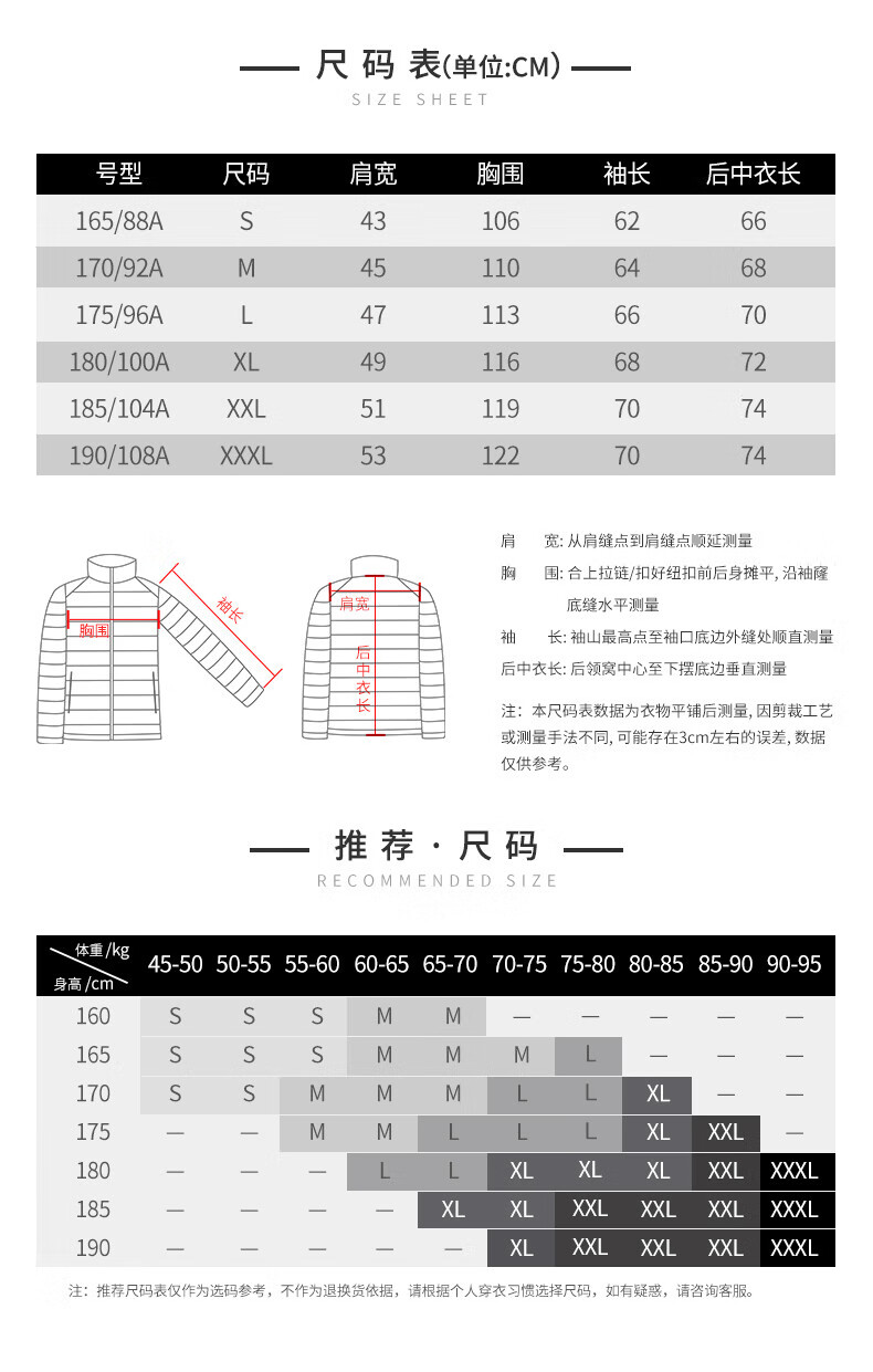 China (cm) 165 / 88-90 170 / 96-98 175 / 108-110 180 / 118-122 185 / 126-130