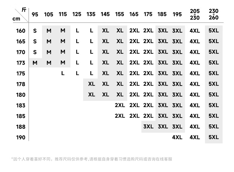 China (cm) 160-165/84-86 165-170 / 88-90 167-172 / 92-96 168-173 / 98-102 170-176 / 106-110
