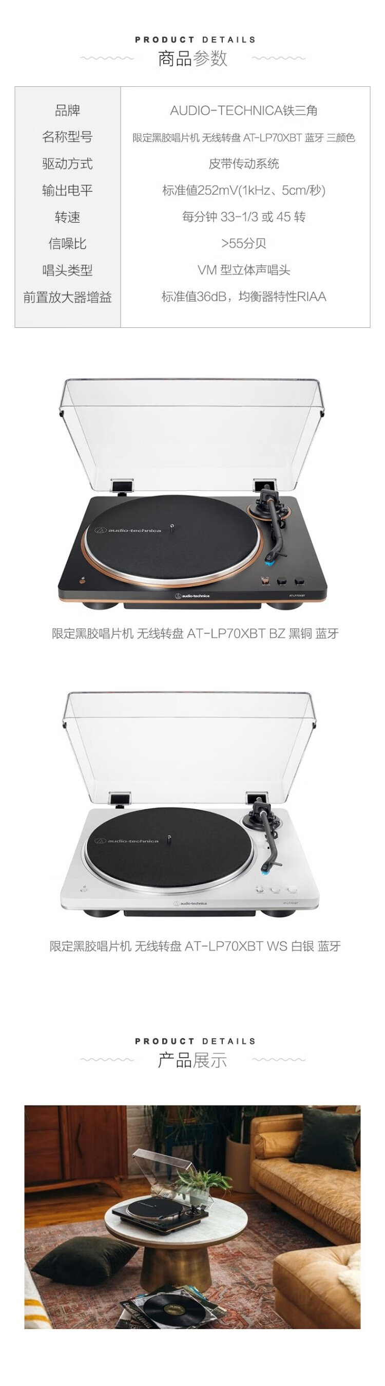 Audio-Technica Bonded Straight Automatic Belt Driven Turntable Vinyl Record Player Retro Bluetooth Record Player LP70XBT WS White Wireless Bluetooth