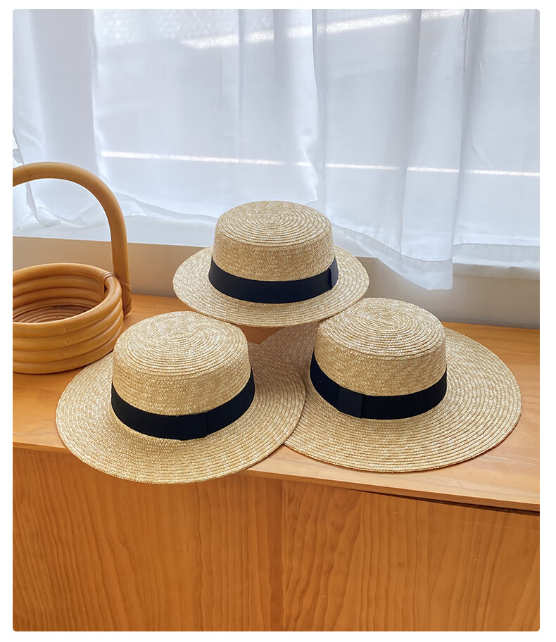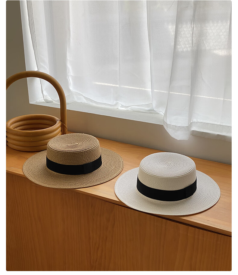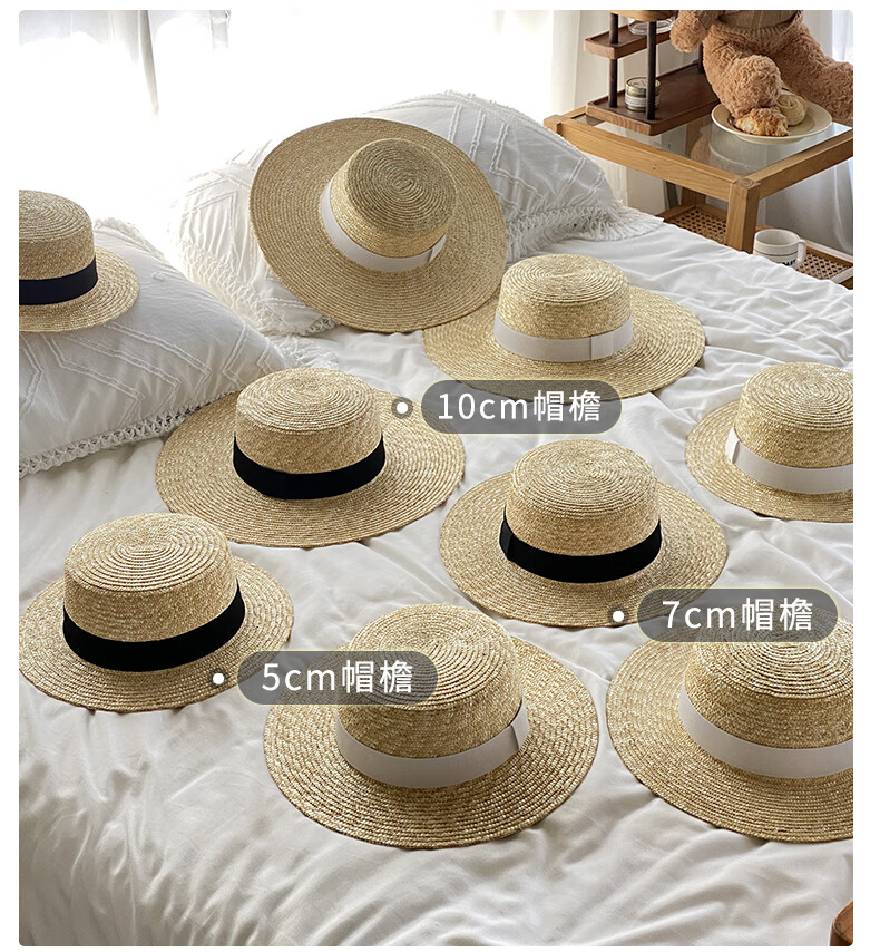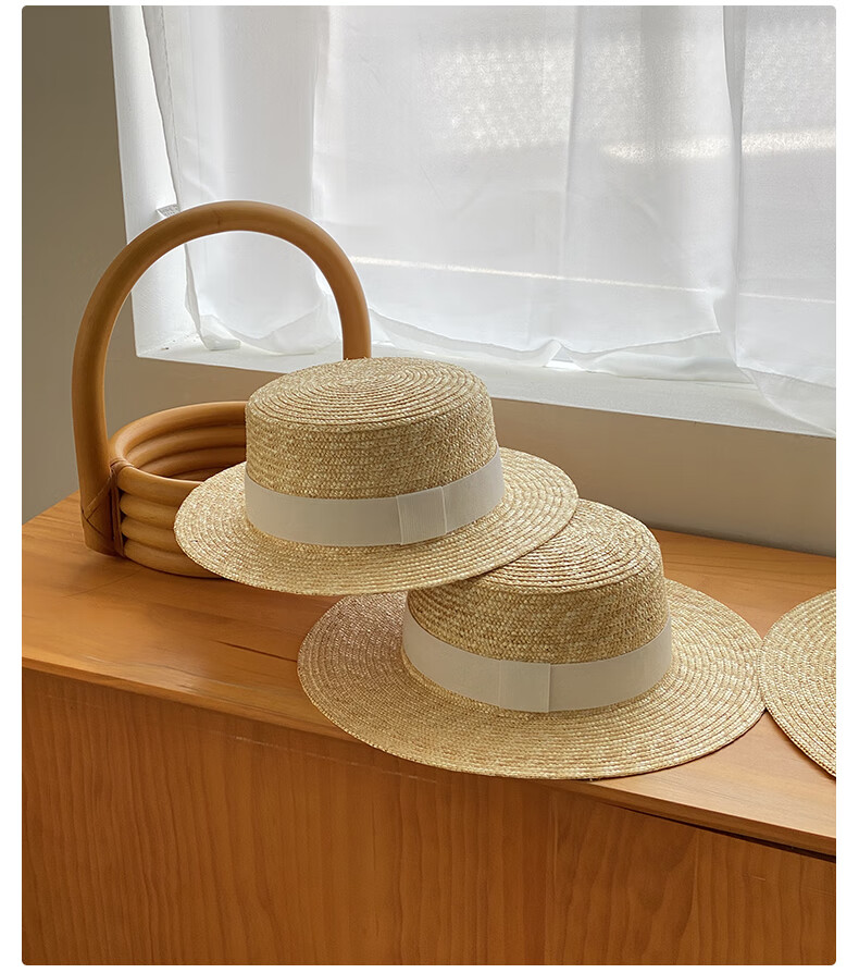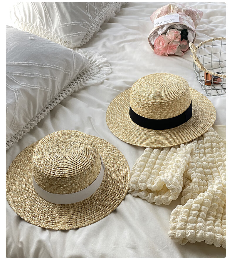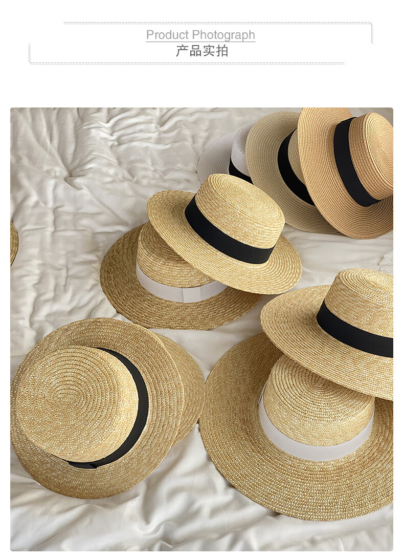 Nanbomaru French flat-top straw hat for women, summer sun protection, seaside vacation beach hat, new flat-brimmed straw woven hat, white, adjustable (5560cm)