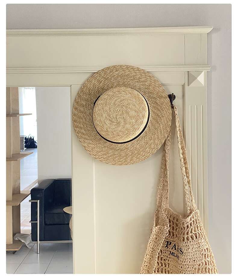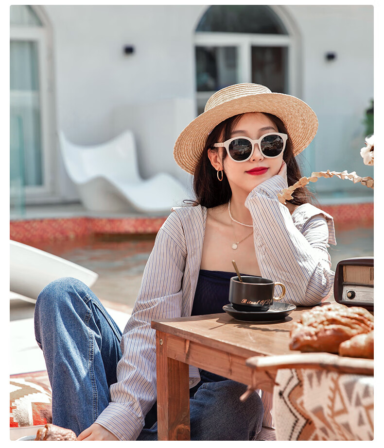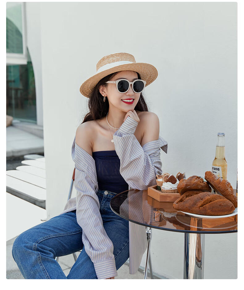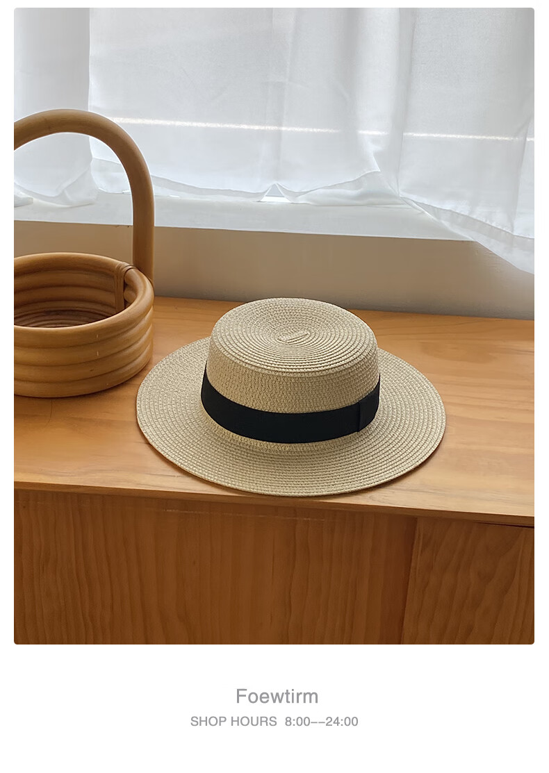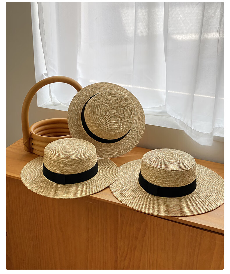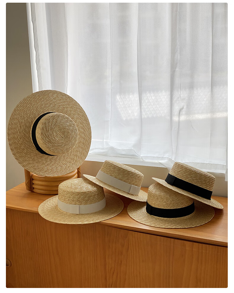 Nanbomaru French flat-top straw hat for women, summer sun protection, seaside vacation beach hat, new flat-brimmed straw woven hat, white, adjustable (5560cm)