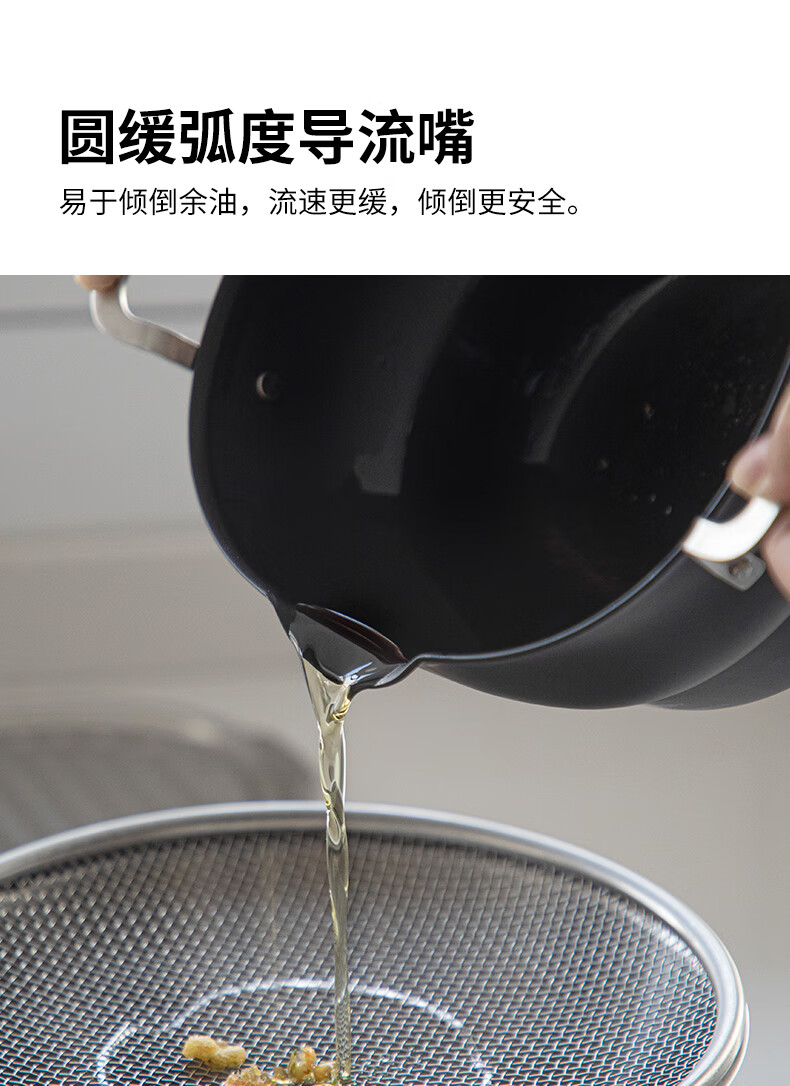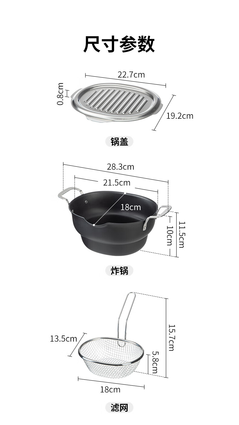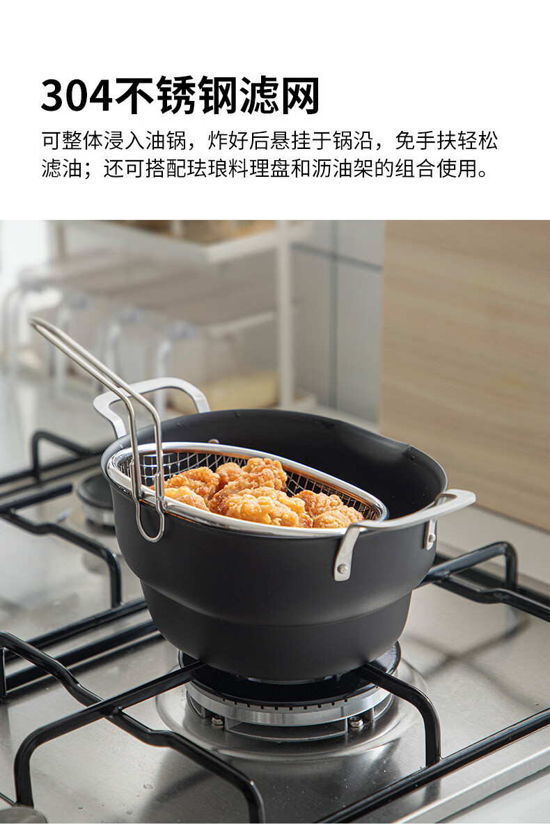 Shuangshan Oval Fryer Smothered Iron Fryer with Cover Deep Fryer Oil-Saving Anti-stick Tempura Small Fryer Anti-splash Oil Three-piece Set Smothered Iron Fryer + Lid + Strainer 21.5cm
