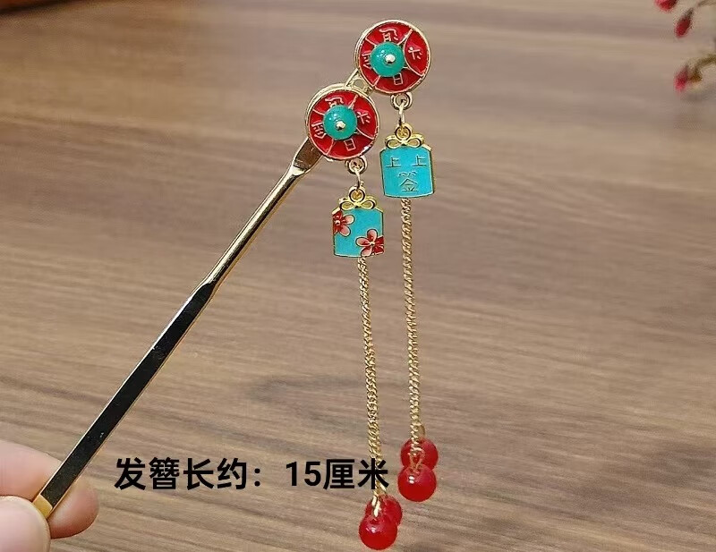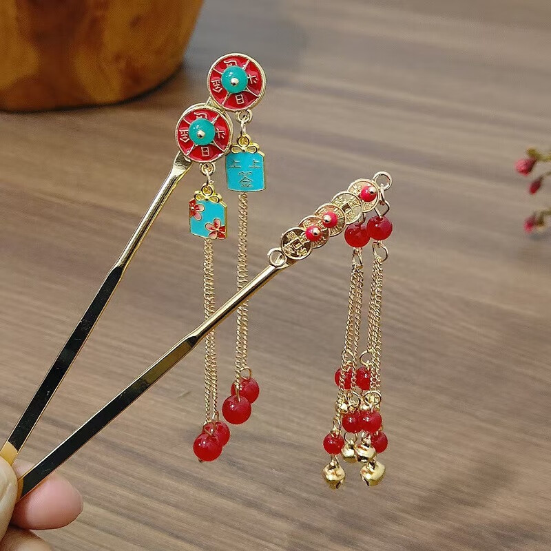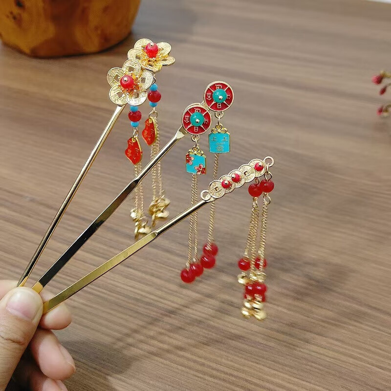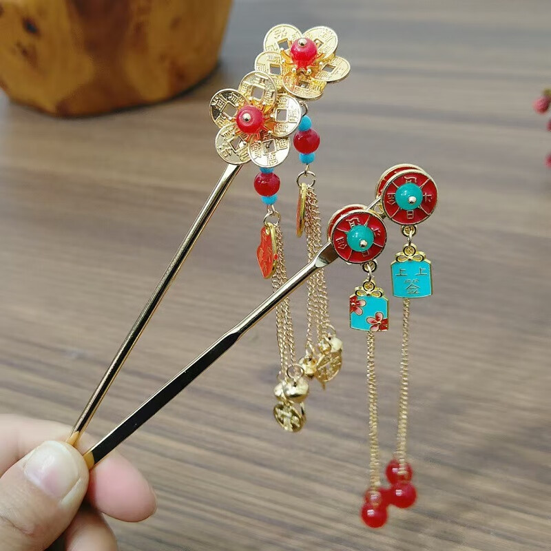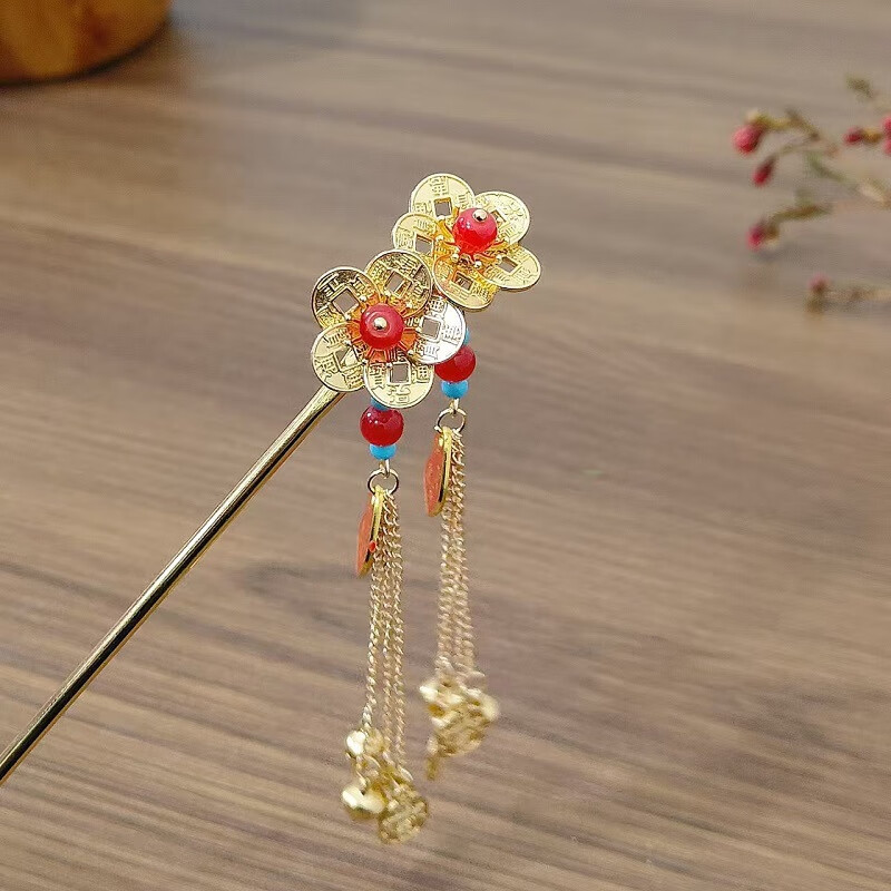 MOYAN Ancient Style Little God of Wealth Copper Coin Ri Jin Dou Blonde Hairpin Rich Flower Tassel Hairpin Hanfu Step Shaker Hairpin Hairpin Headgear X822 Rich Flower-hairpin