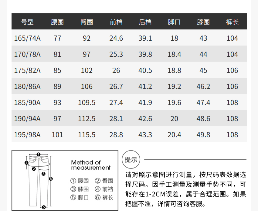 Outseam (cm) 99 cm 101.5 cm 104 cm 106.5 cm 109 cm