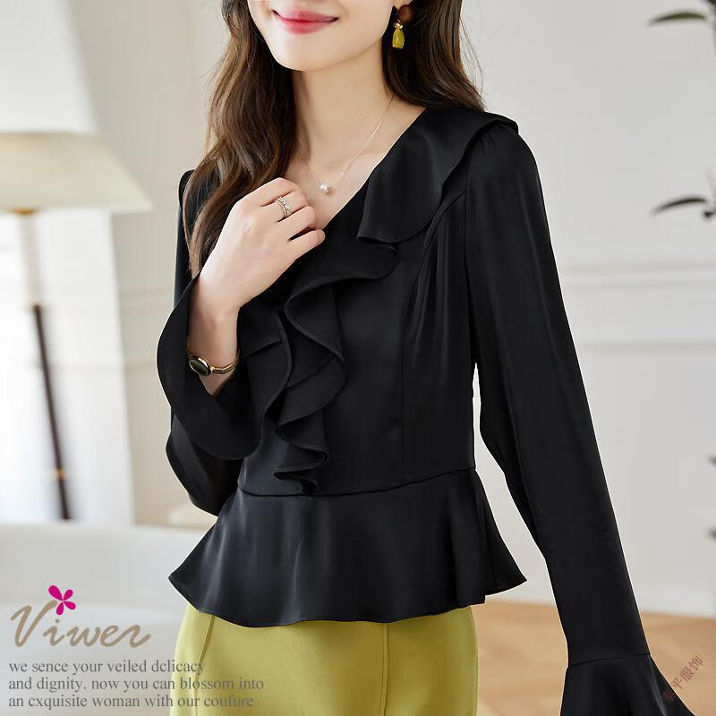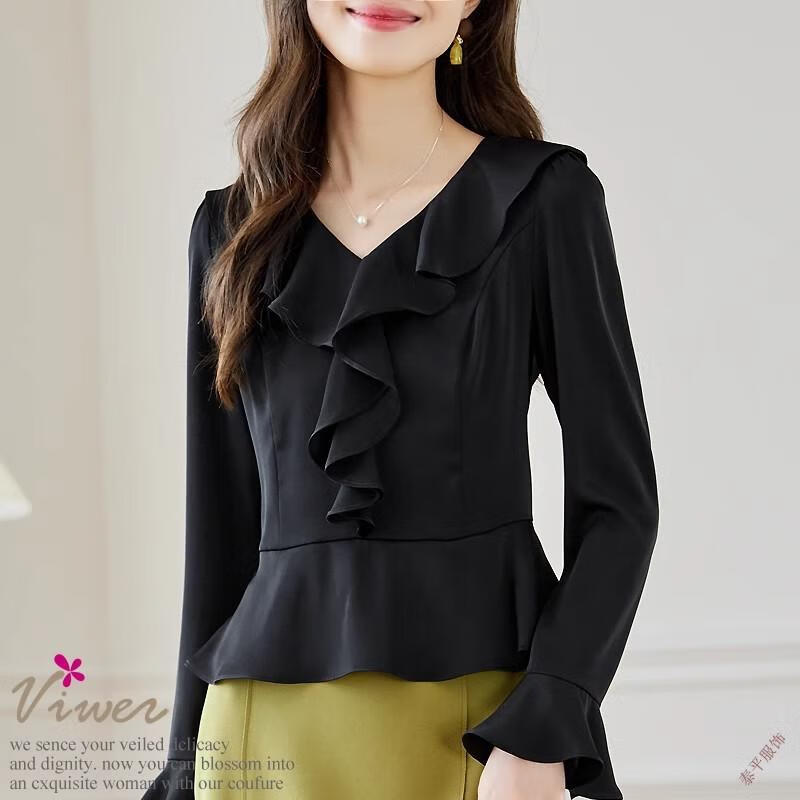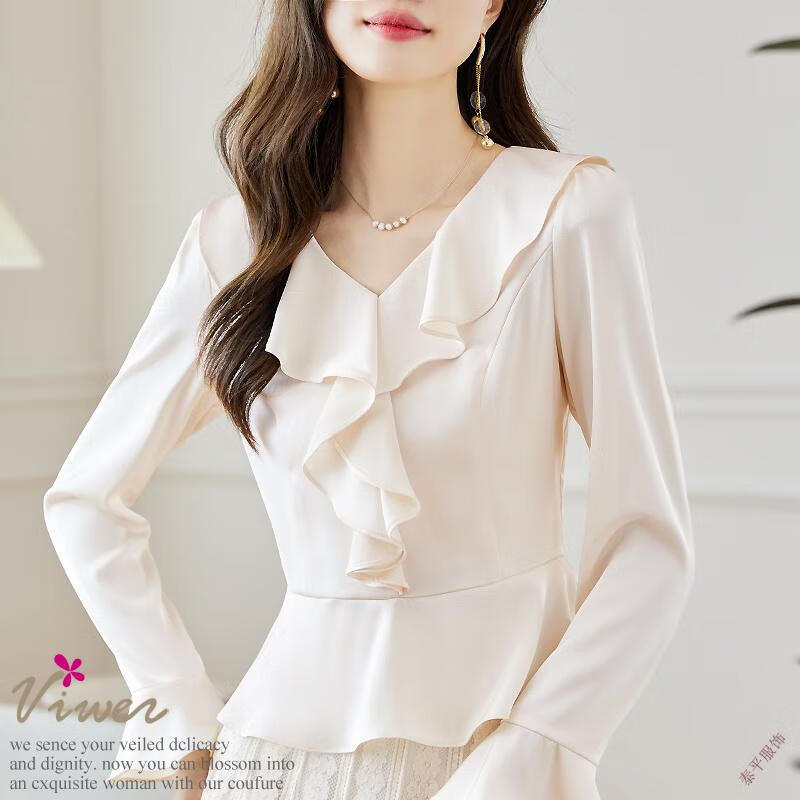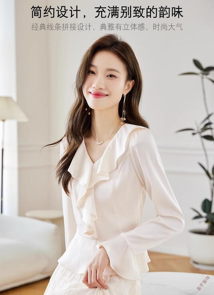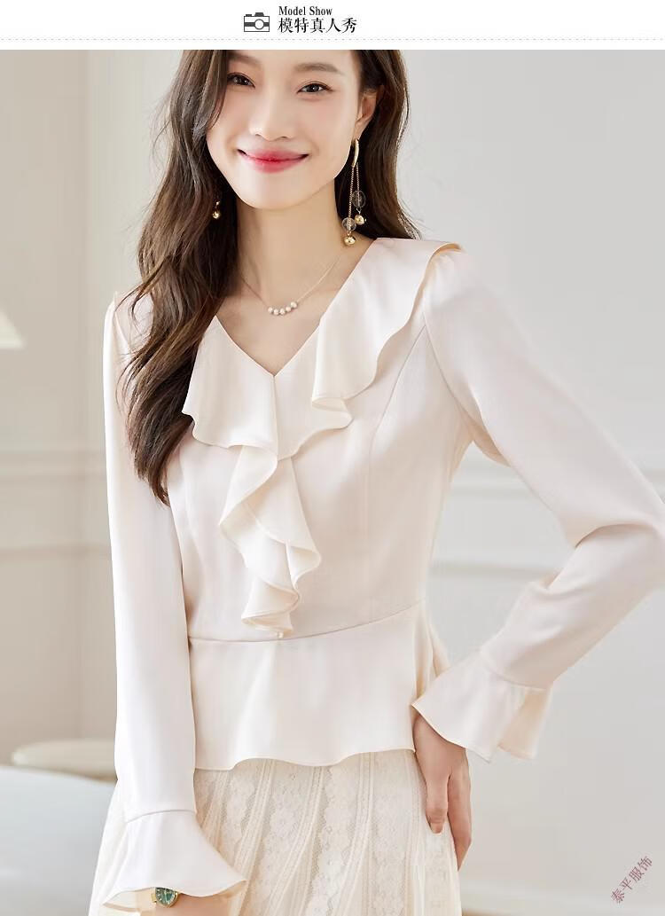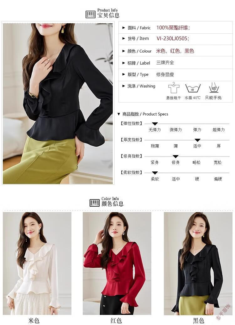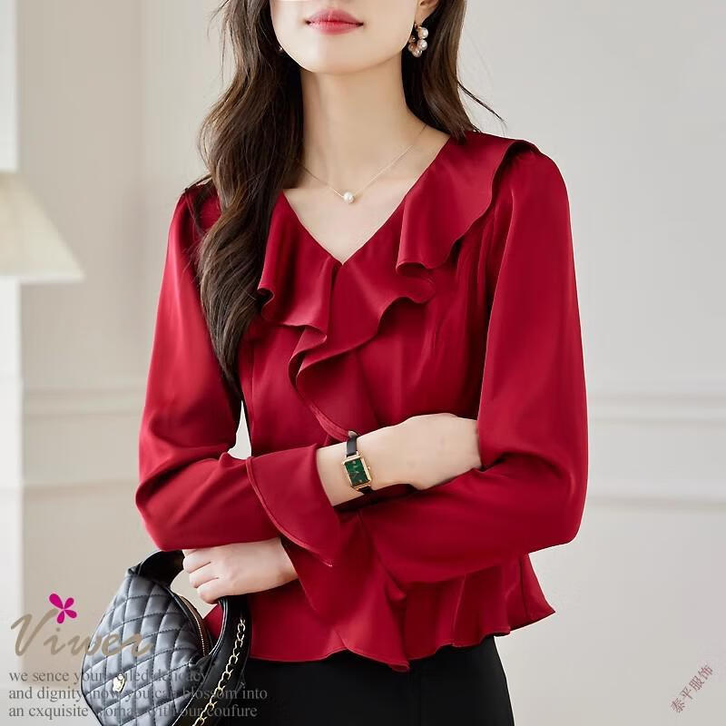 Pierre Cardin ruffled chiffon shirt women's long-sleeved spring and autumn new v-neck waist top short shirt belly-covering shirt red M