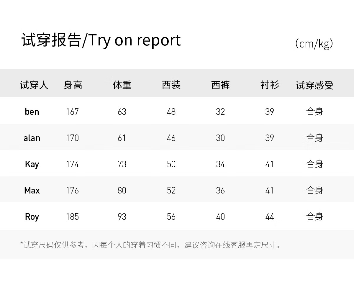 China (cm) 160-165/84-86 165-170 / 88-90 167-172 / 92-96 168-173 / 98-102 170-176 / 106-110