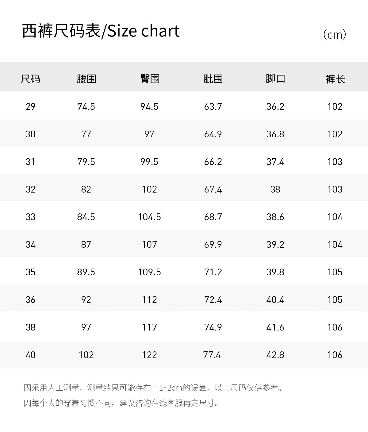 Outseam (cm) 99 cm 101.5 cm 104 cm 106.5 cm 109 cm
