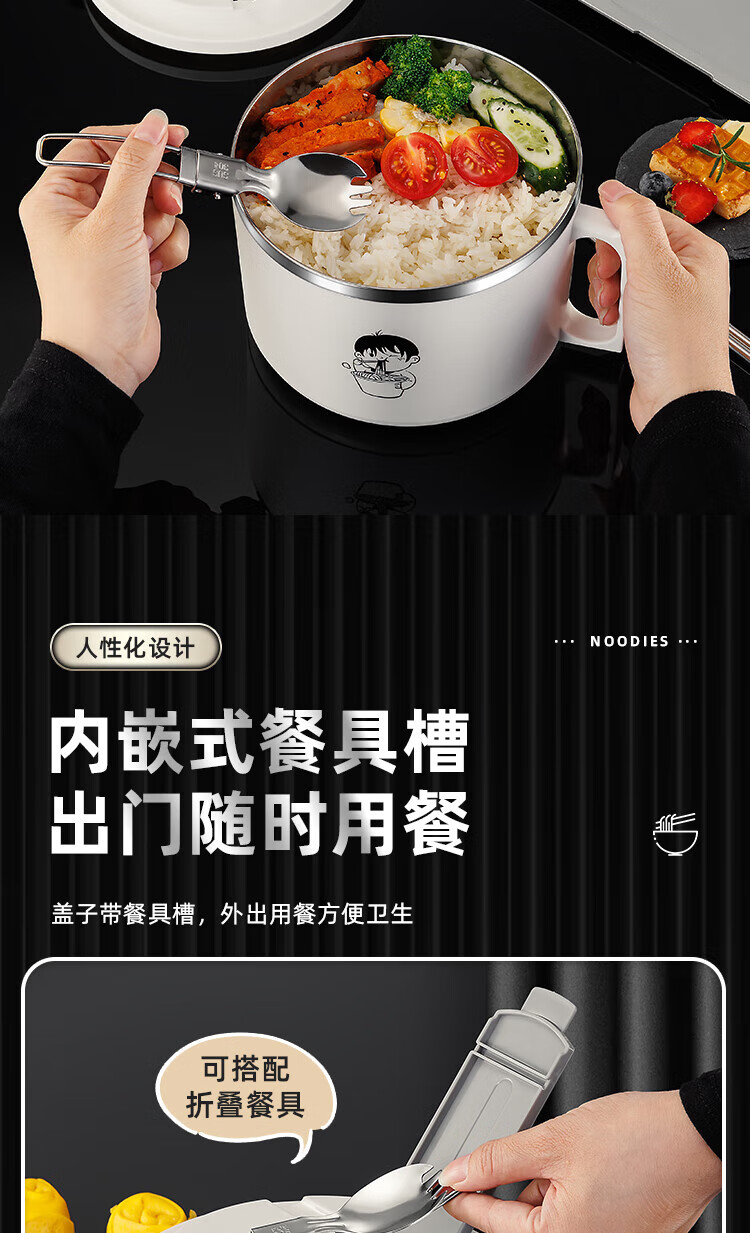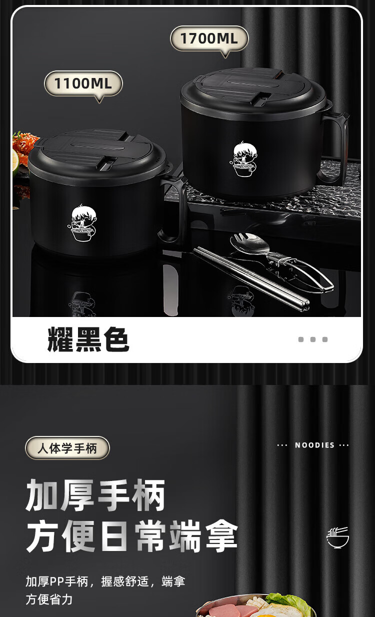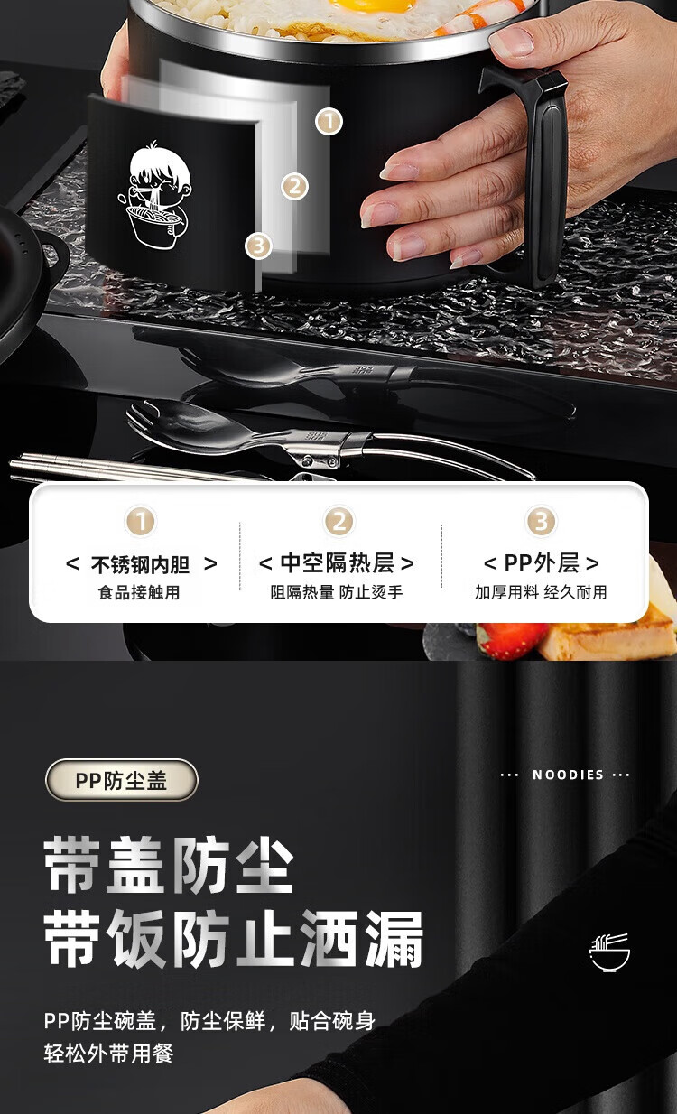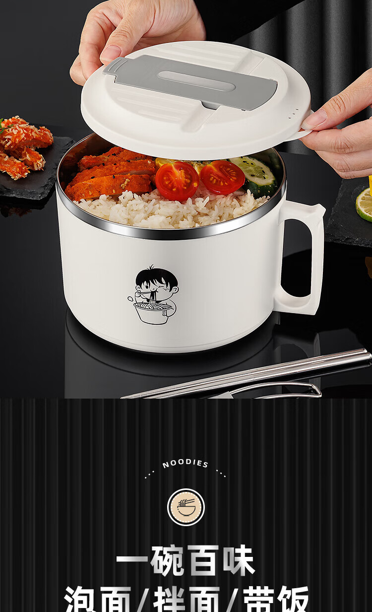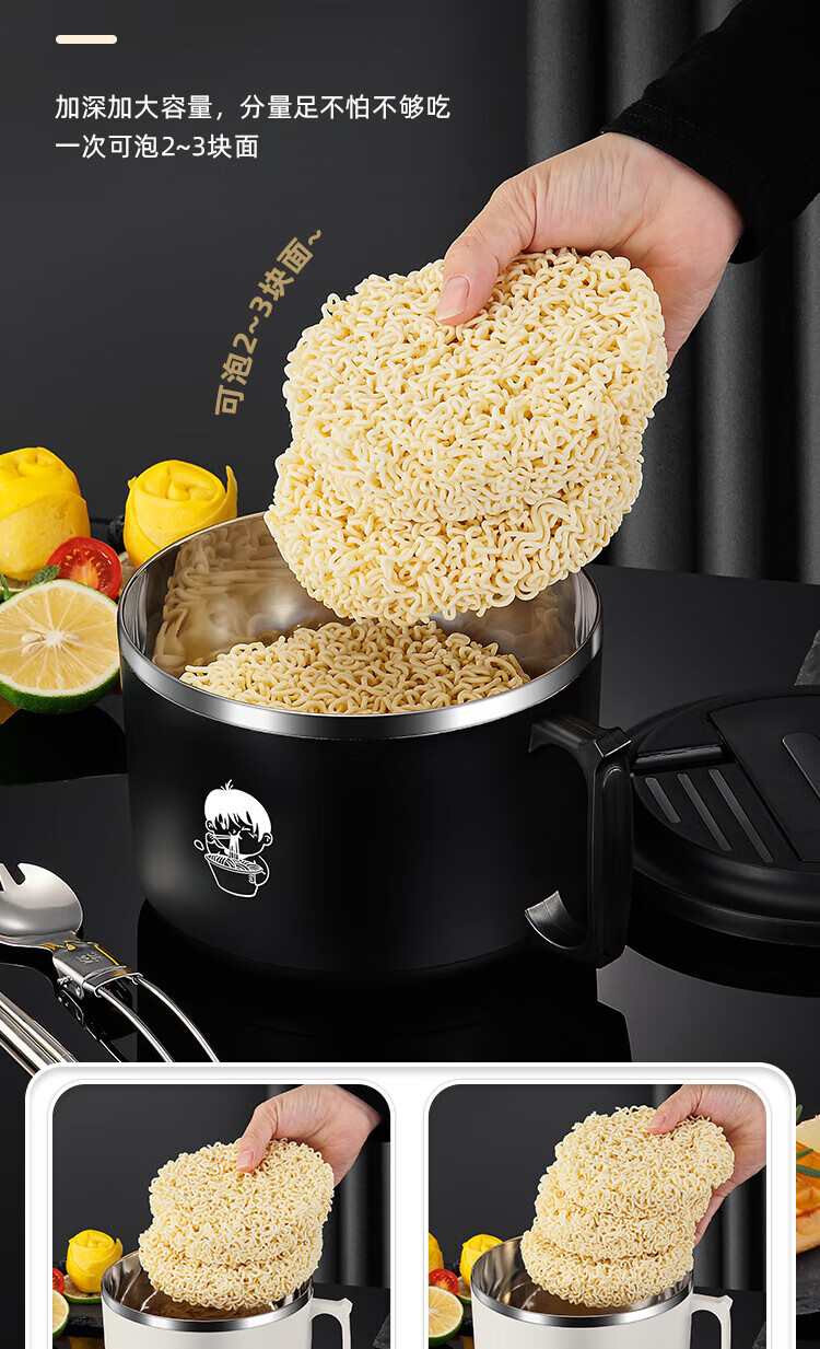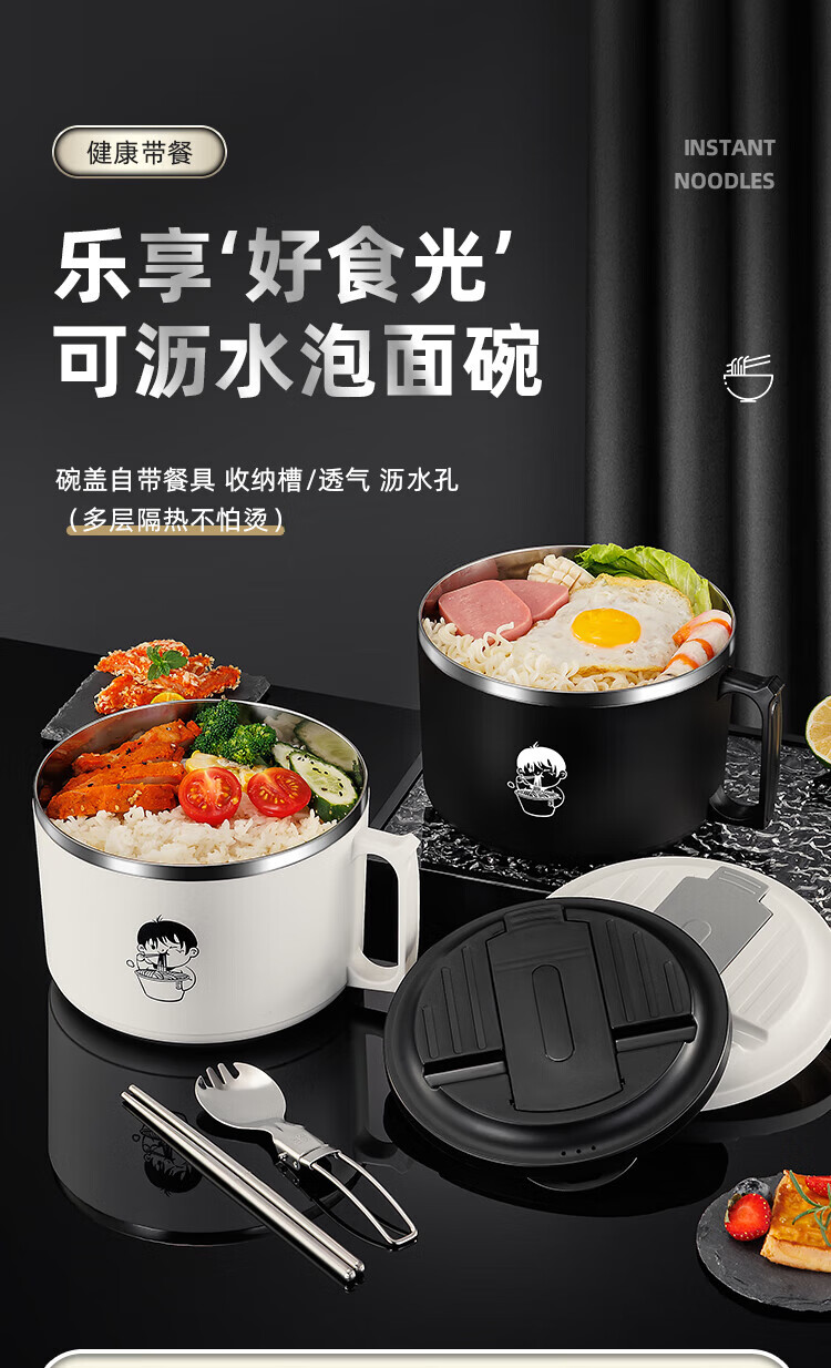 食品泡面碗宿舍学生带盖不锈钢泡方便面可沥水汤盆食堂打饭专用 17cm【曜黑色】带盖泡面碗+餐具