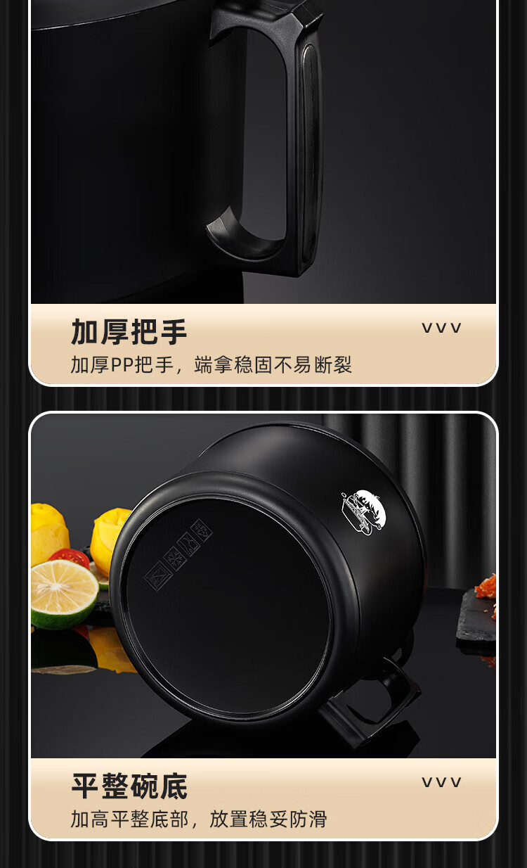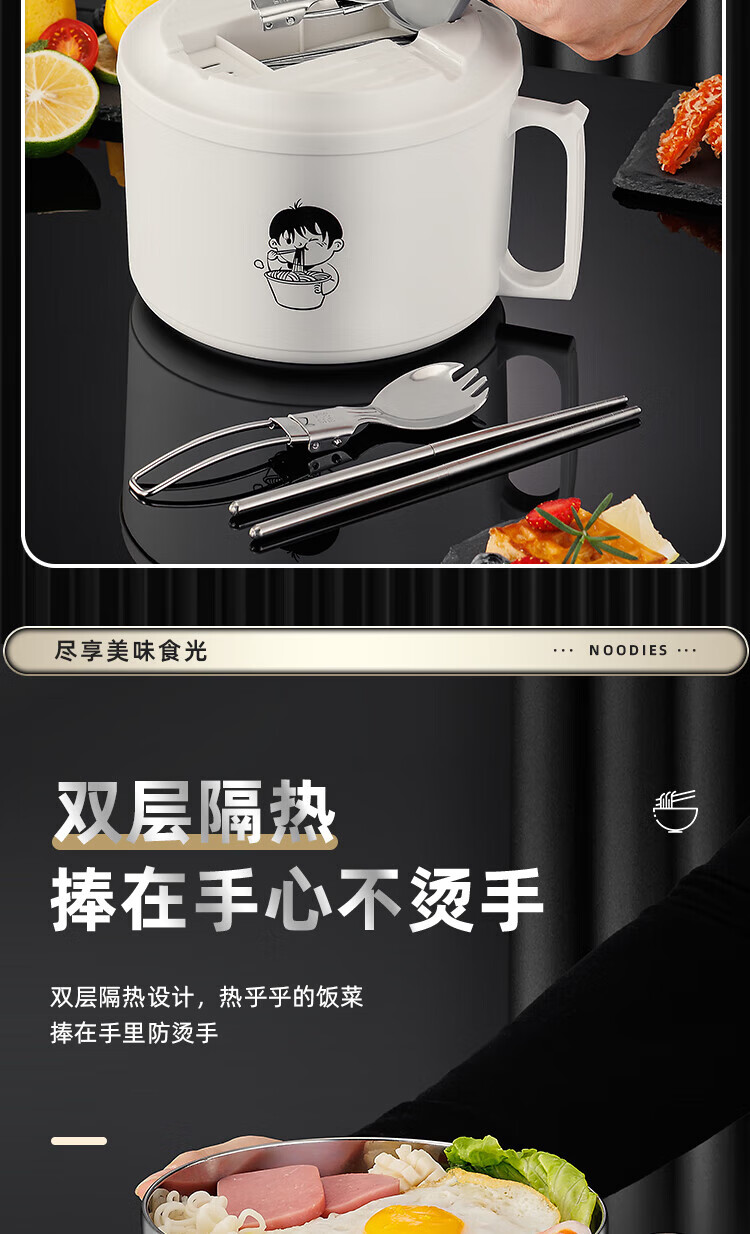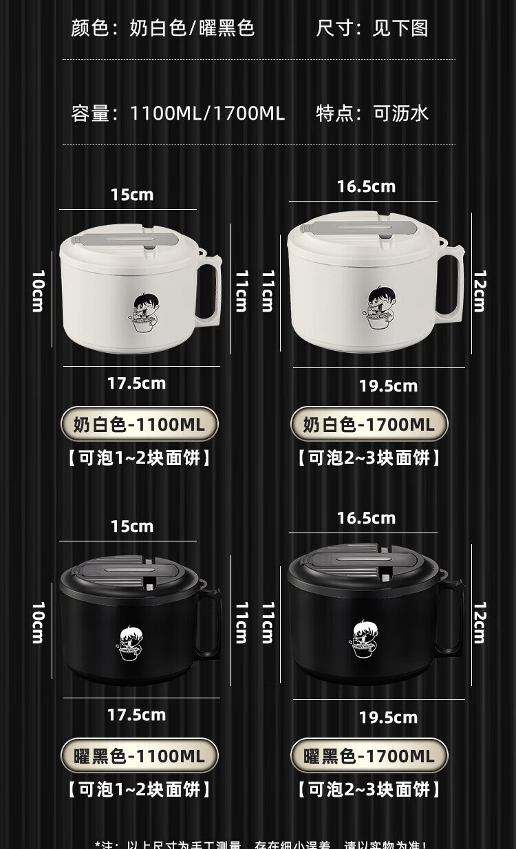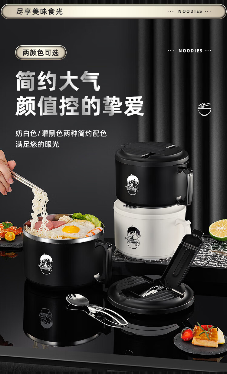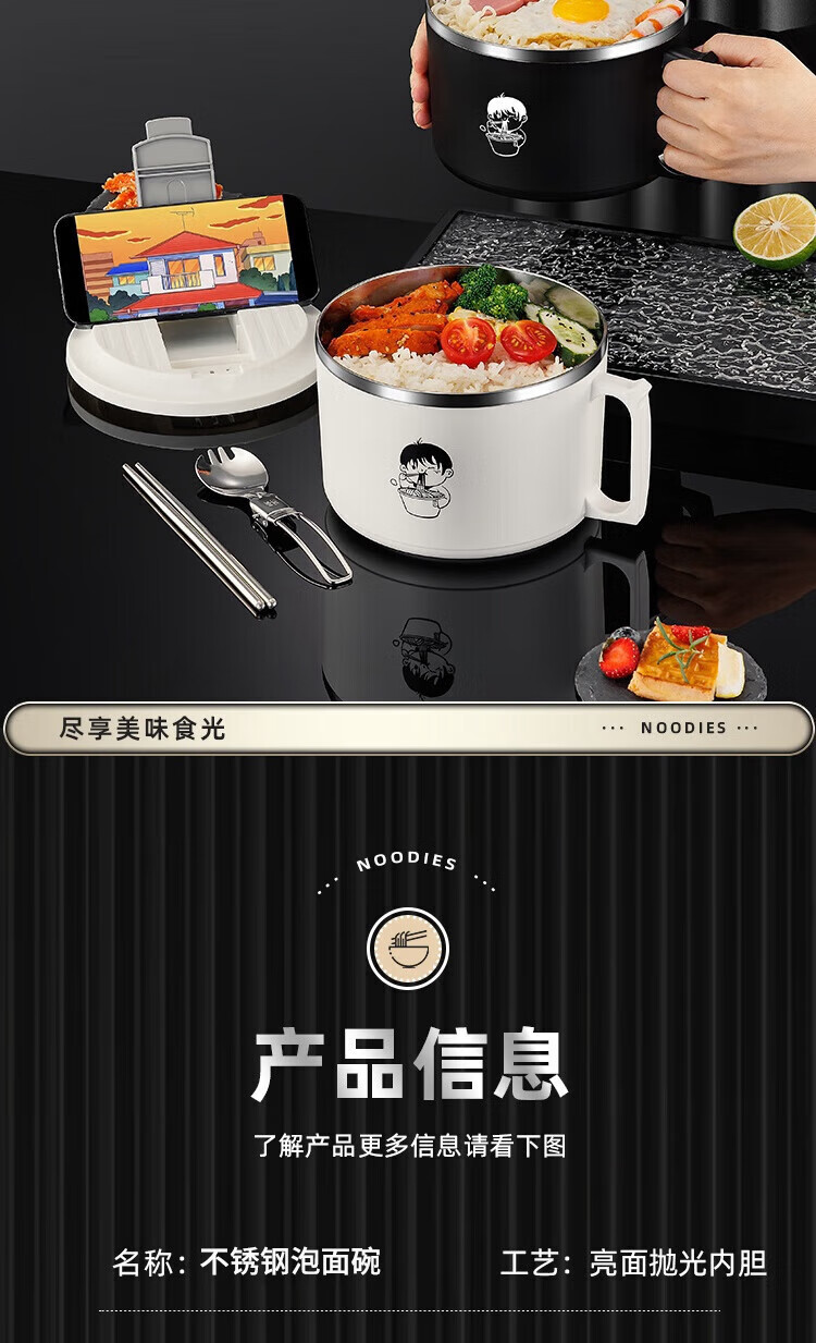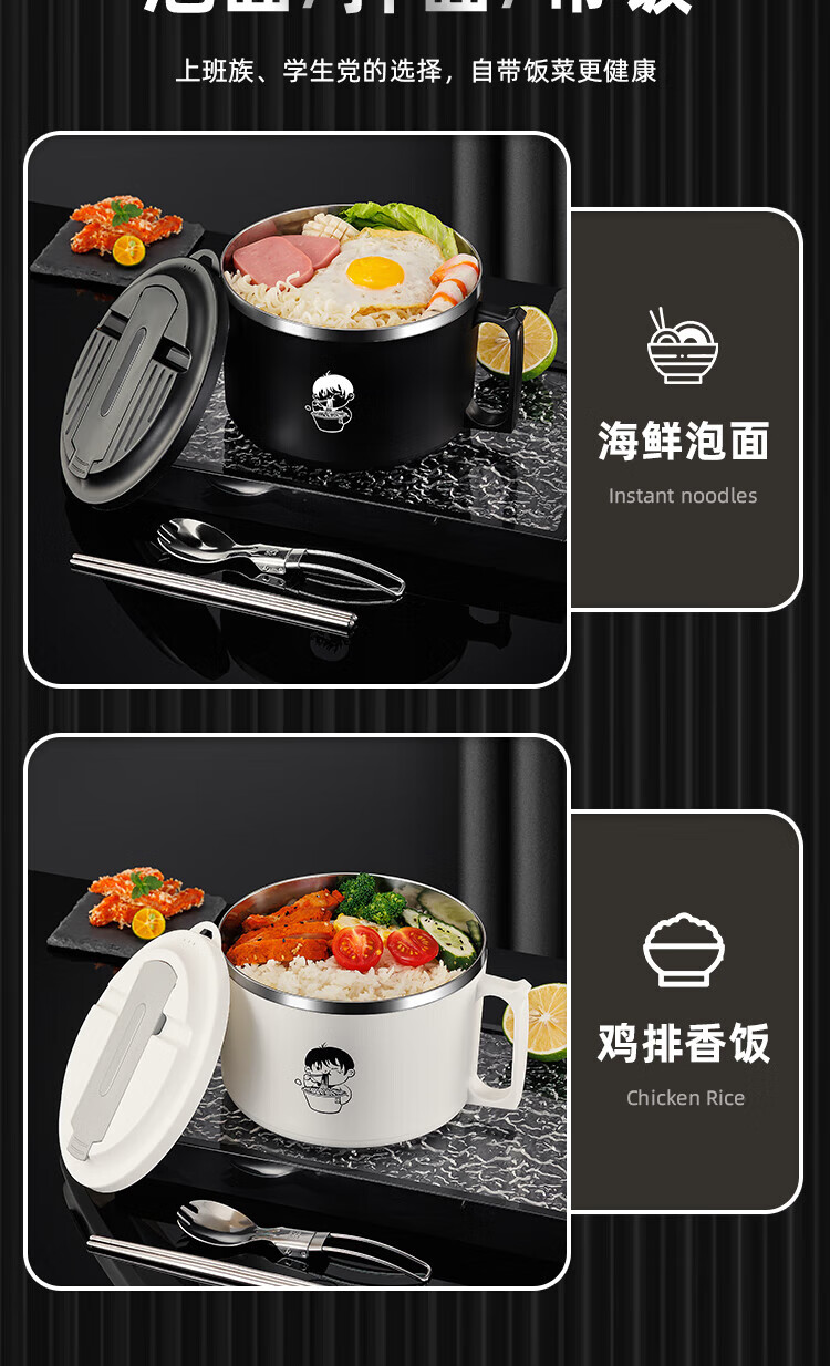 食品泡面碗宿舍学生带盖不锈钢泡方便面可沥水汤盆食堂打饭专用 17cm【曜黑色】带盖泡面碗+餐具