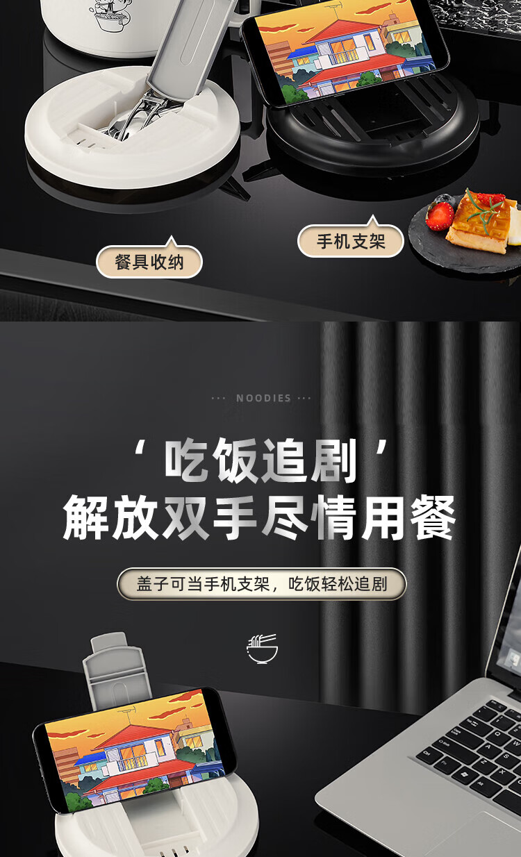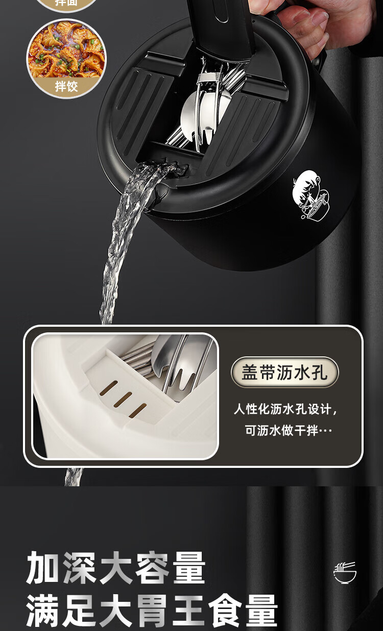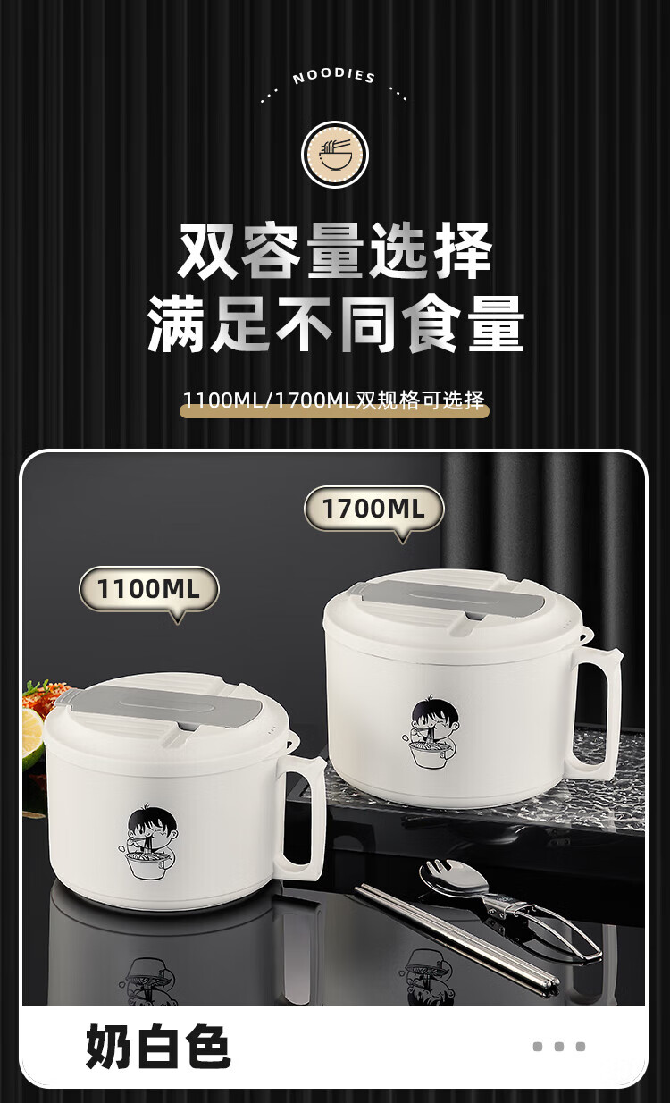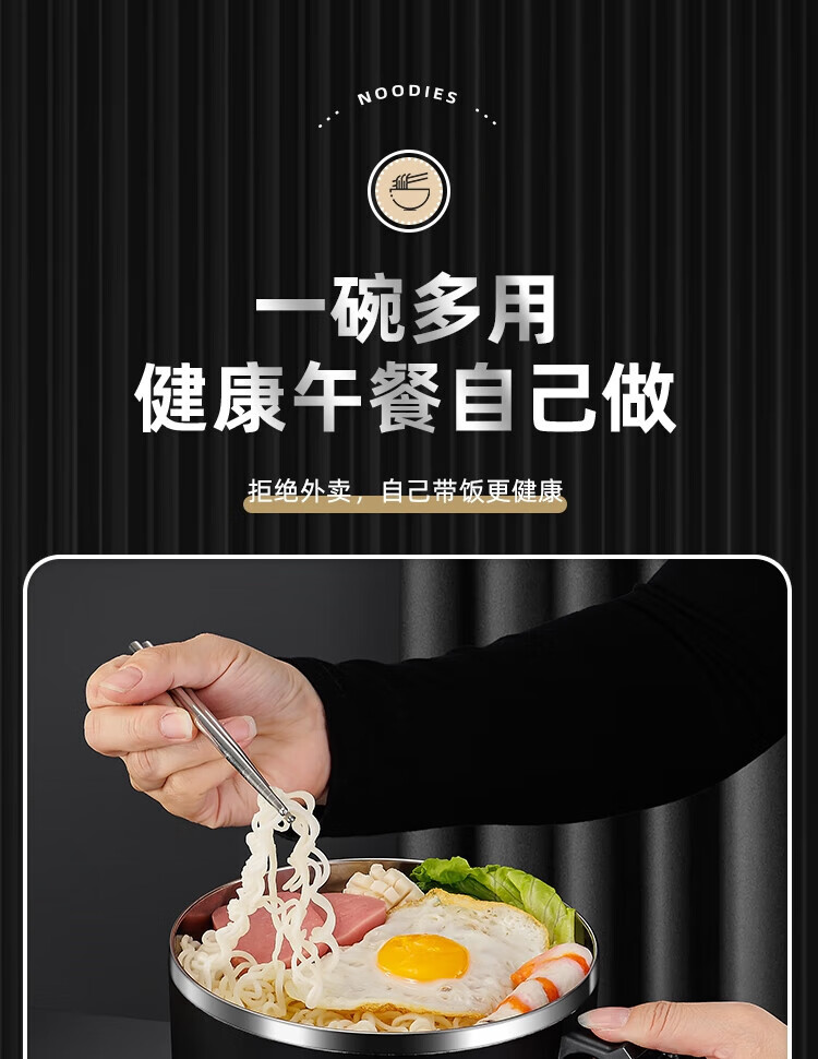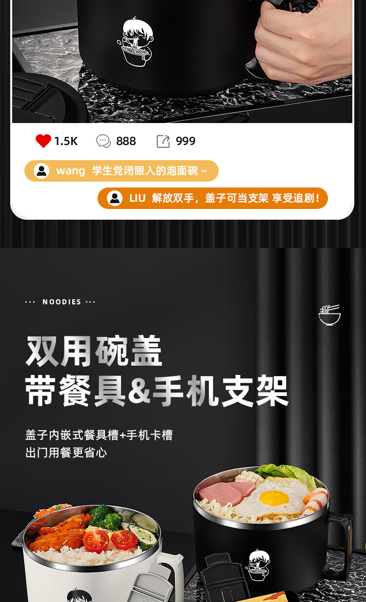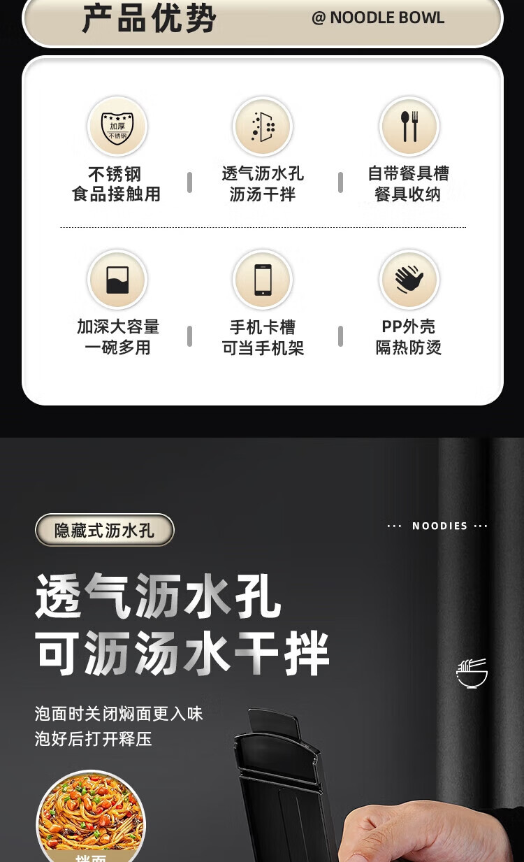 食品泡面碗宿舍学生带盖不锈钢泡方便面可沥水汤盆食堂打饭专用 17cm【曜黑色】带盖泡面碗+餐具