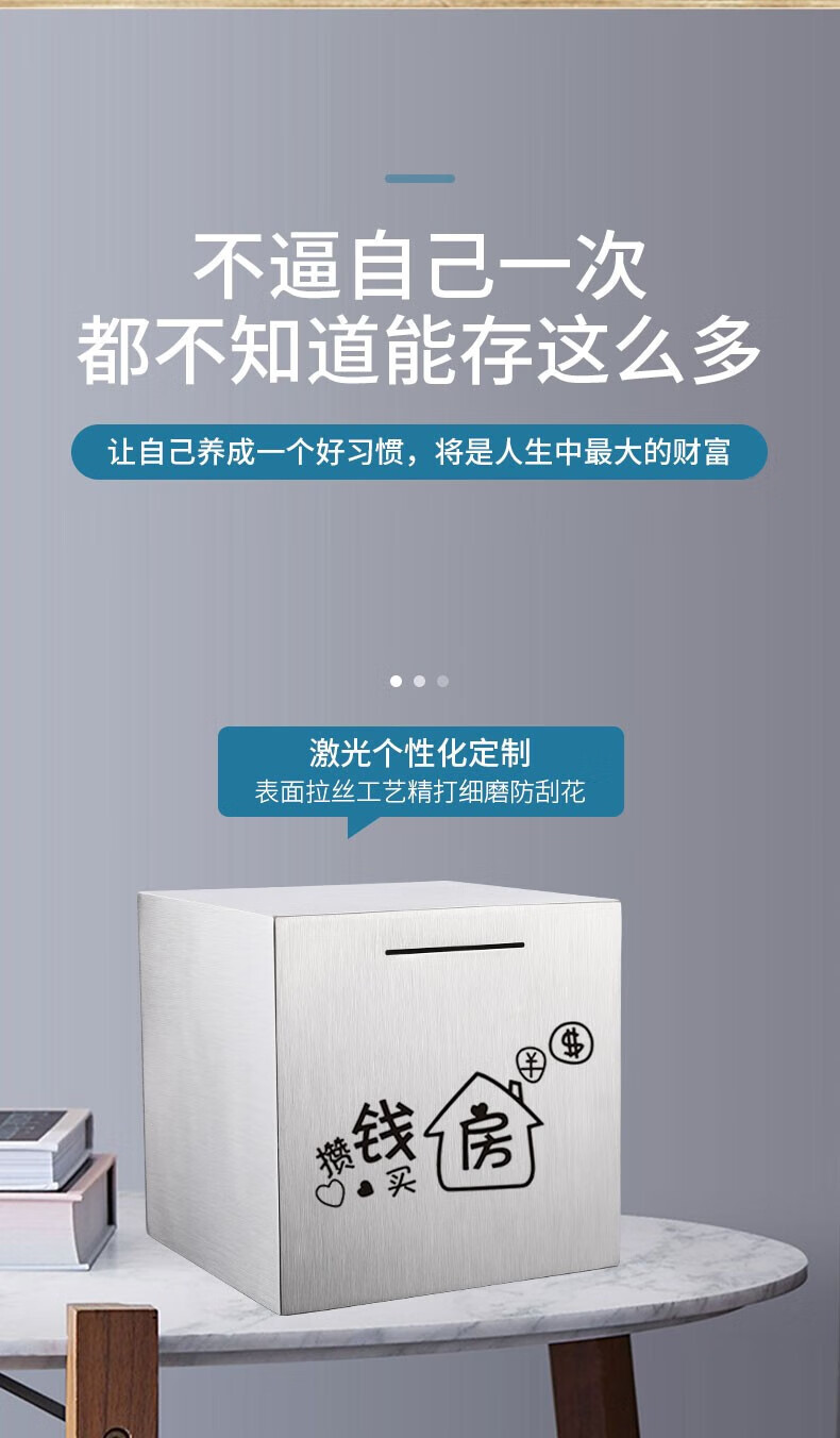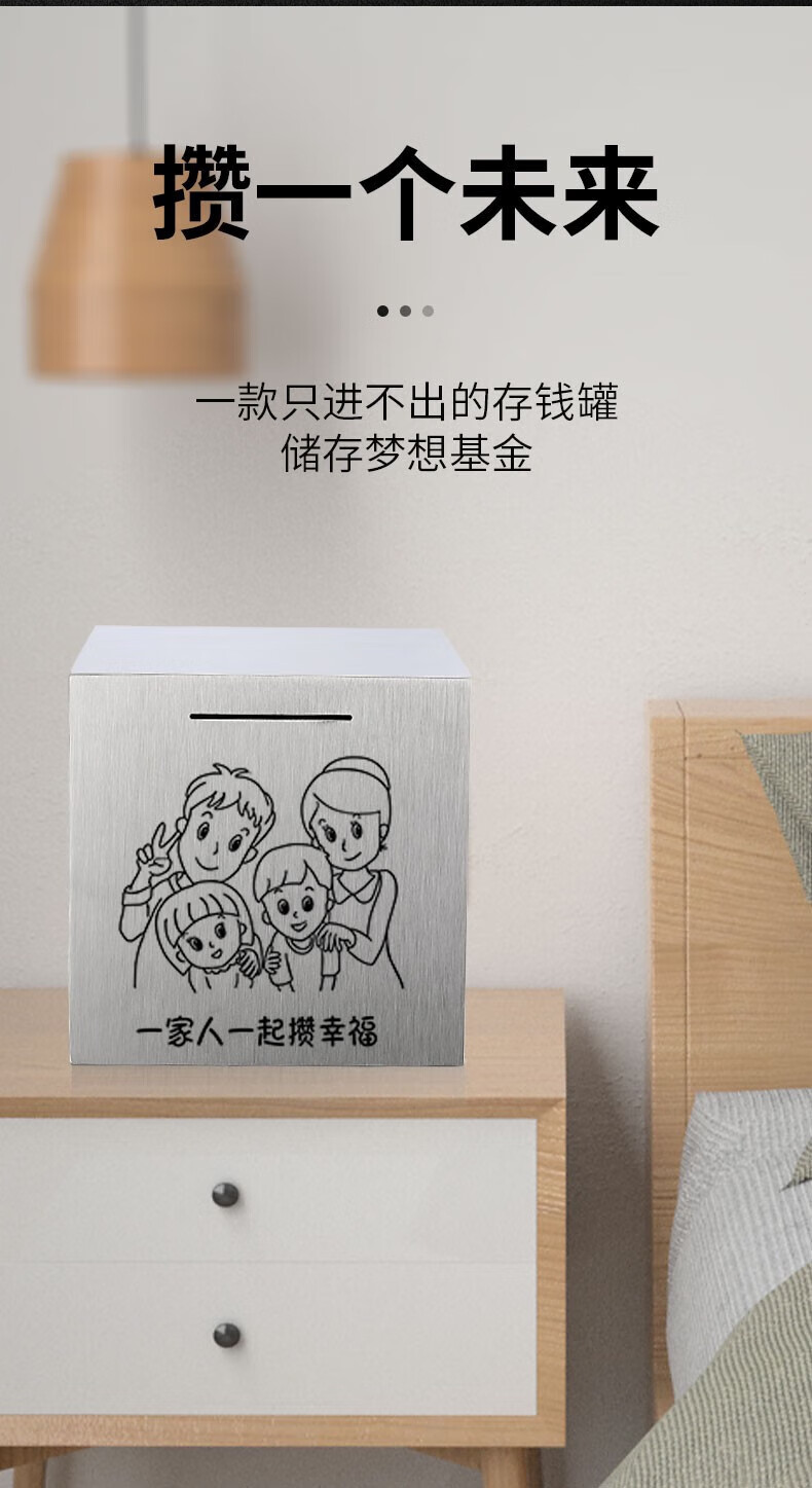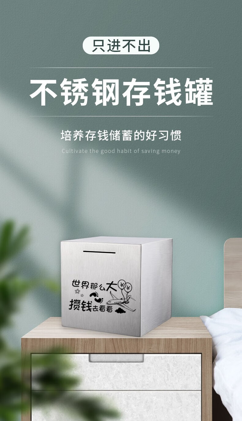 Stainless steel piggy bank can only be put in and out. Large capacity piggy bank for adults. Piggy bank for children and boys. Not a gift. I only want to save money. Small size 12*12cm. Can save 50,000.