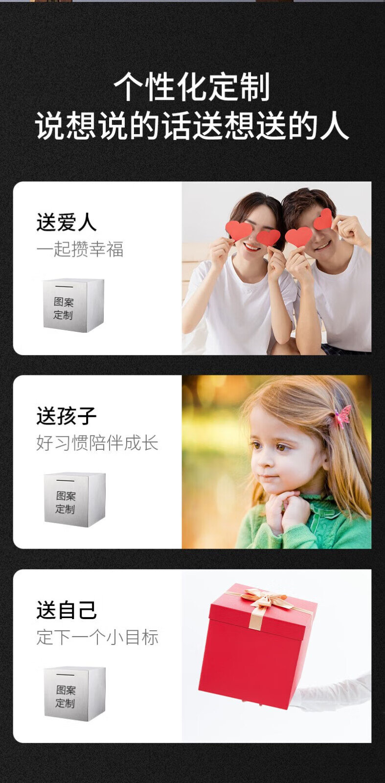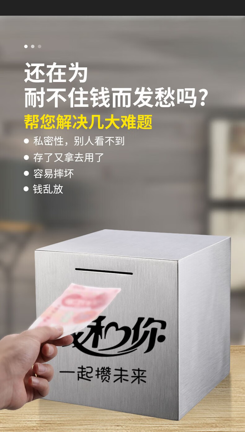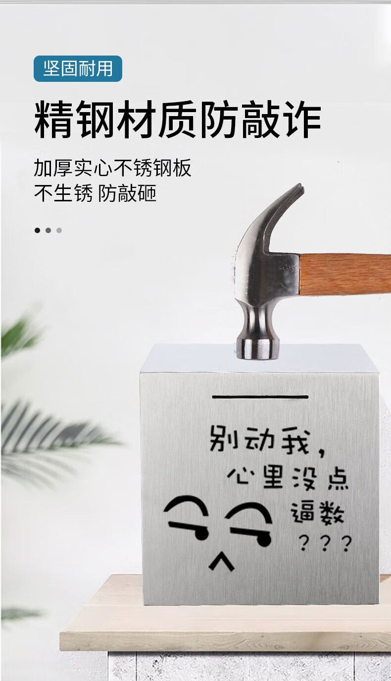 Stainless steel piggy bank can only be put in and out. Large capacity piggy bank for adults. Piggy bank for children and boys. Not a gift. I only want to save money. Small size 12*12cm. Can save 50,000.