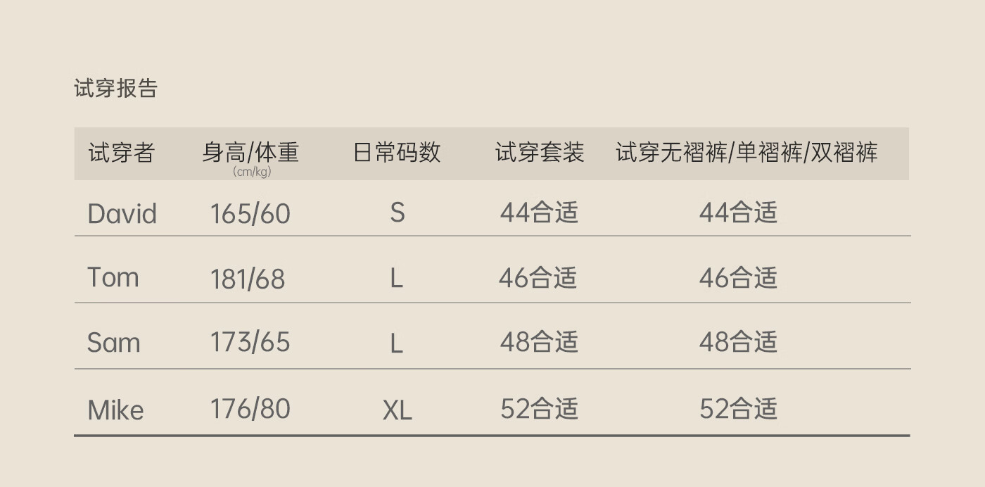 China (cm) 165 / 88-90 170 / 96-98 175 / 108-110 180 / 118-122 185 / 126-130