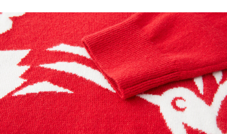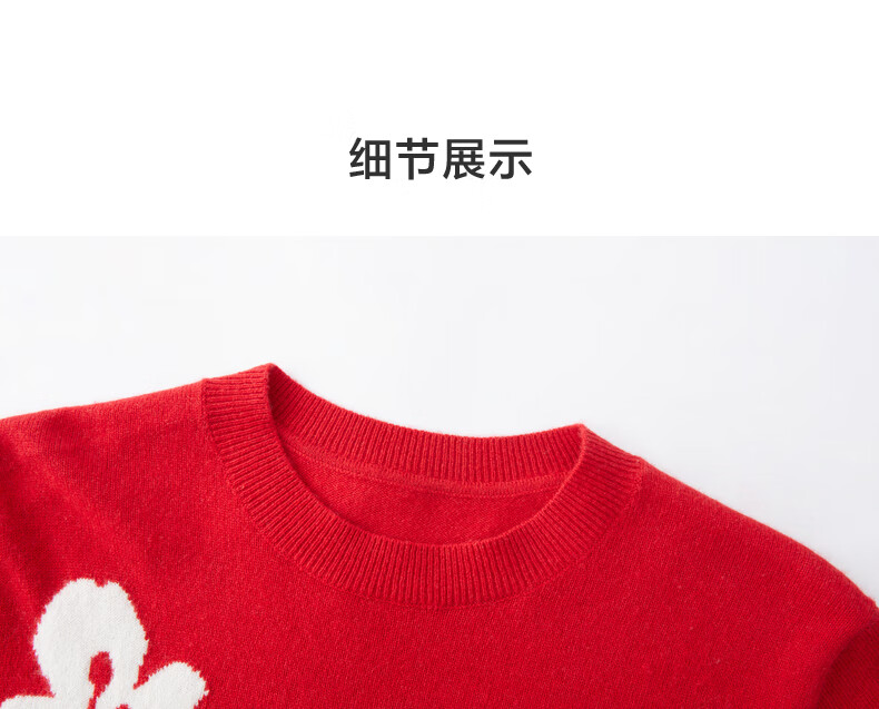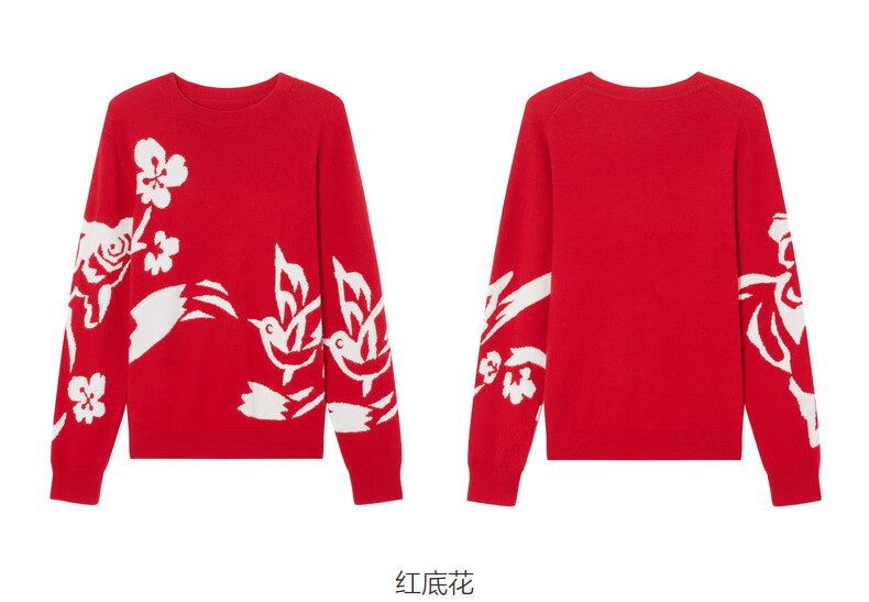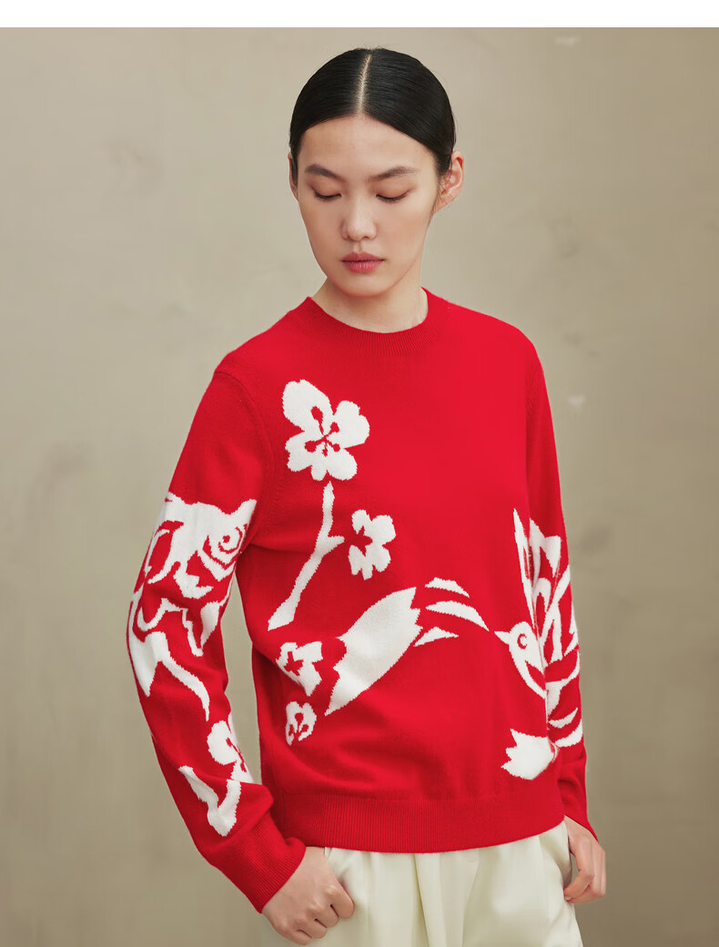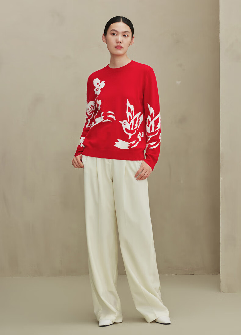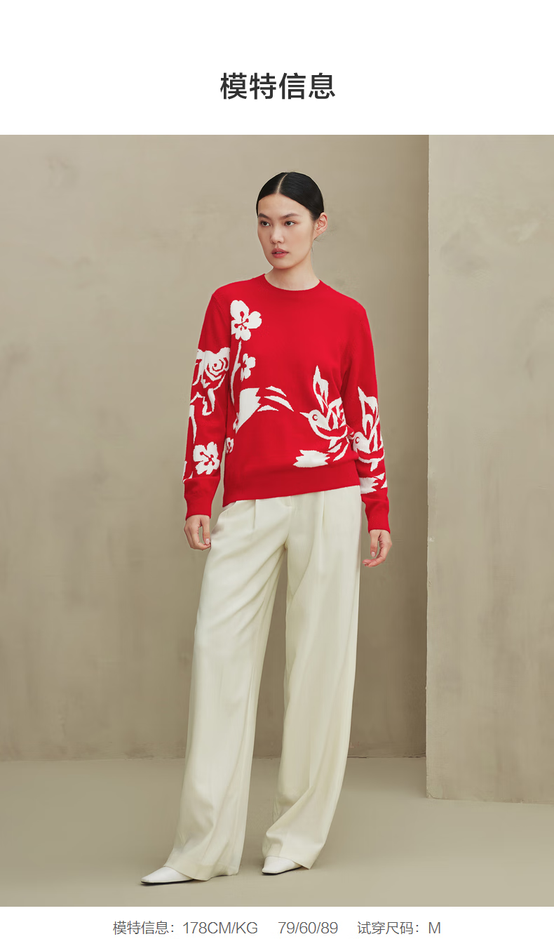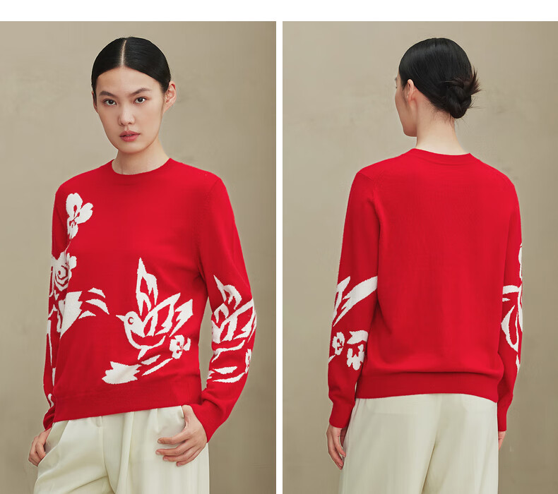 Ordos 1980 Autumn and Winter Pure Cashmere Round Neck ADF Intarsia Front Shoulder Red Women's Comfortable Cashmere Sweater Red Bottom Flower L 165/88A