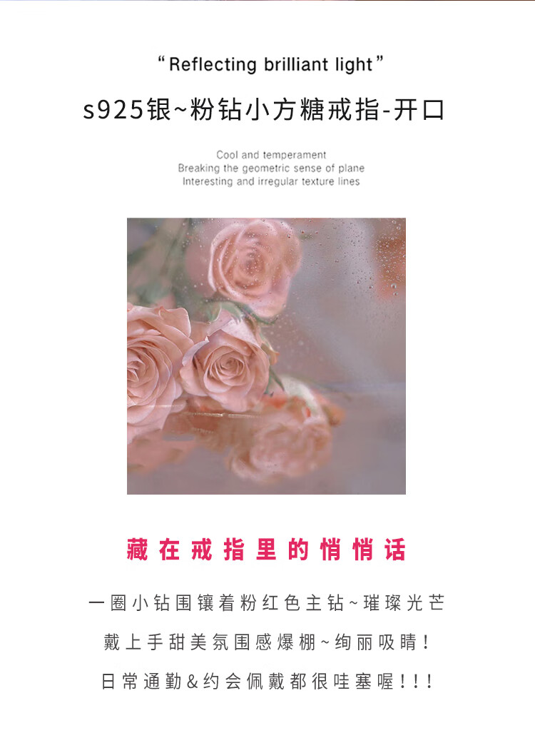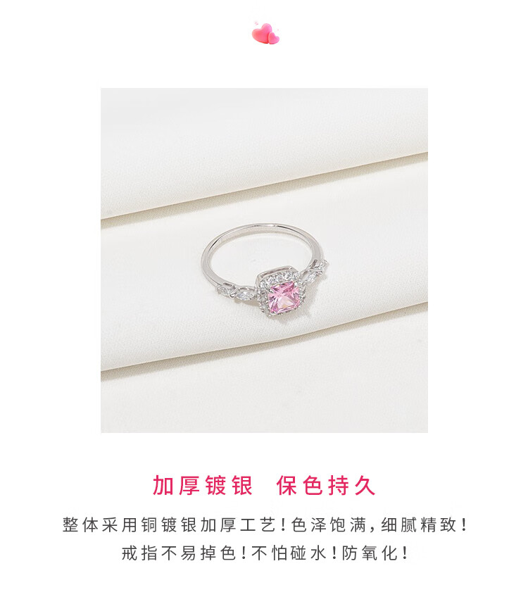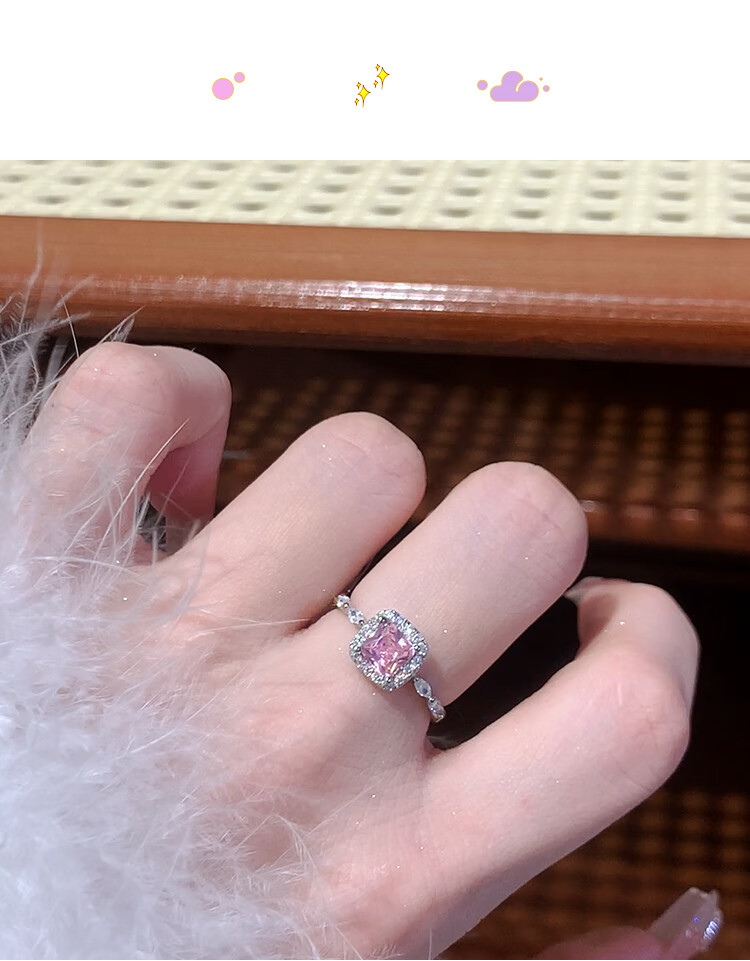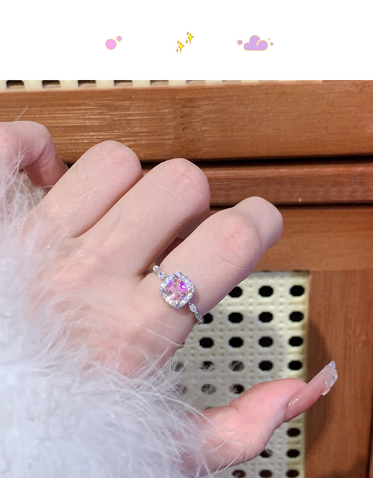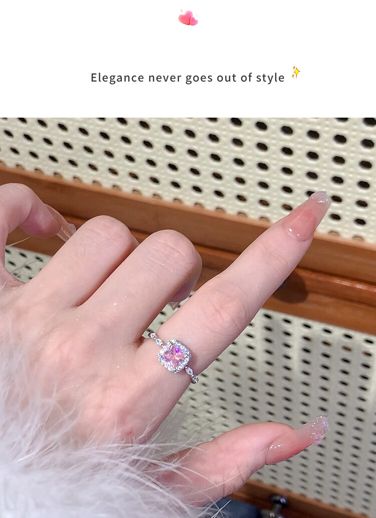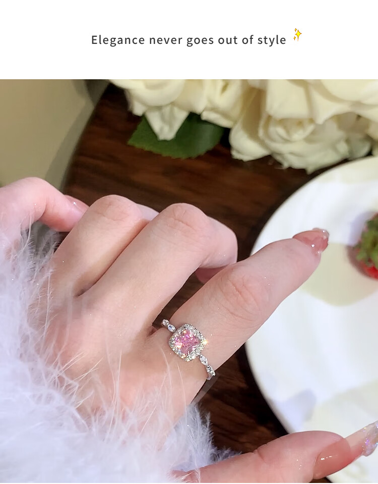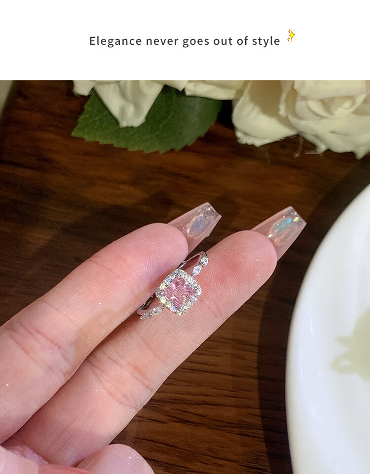 Hua Youxin Persimmon s925 silver ring female pink diamond small sugar cube ring female niche design high-end plain ring ring open index finger ring pink diamond small sugar cube ring
