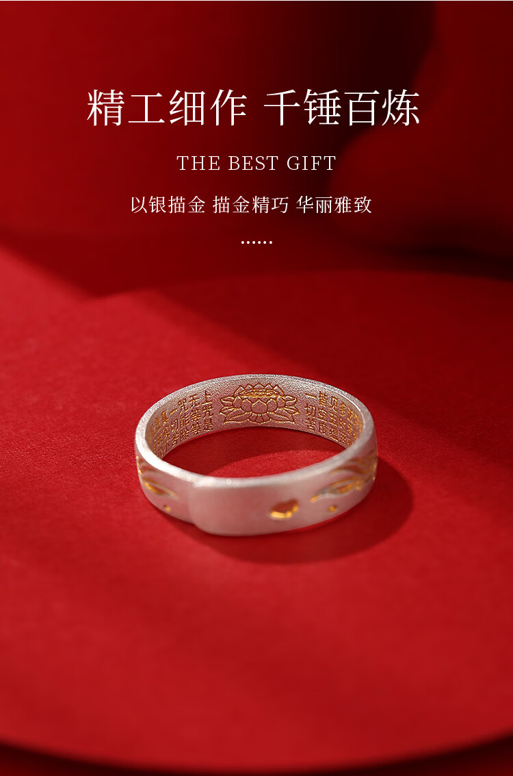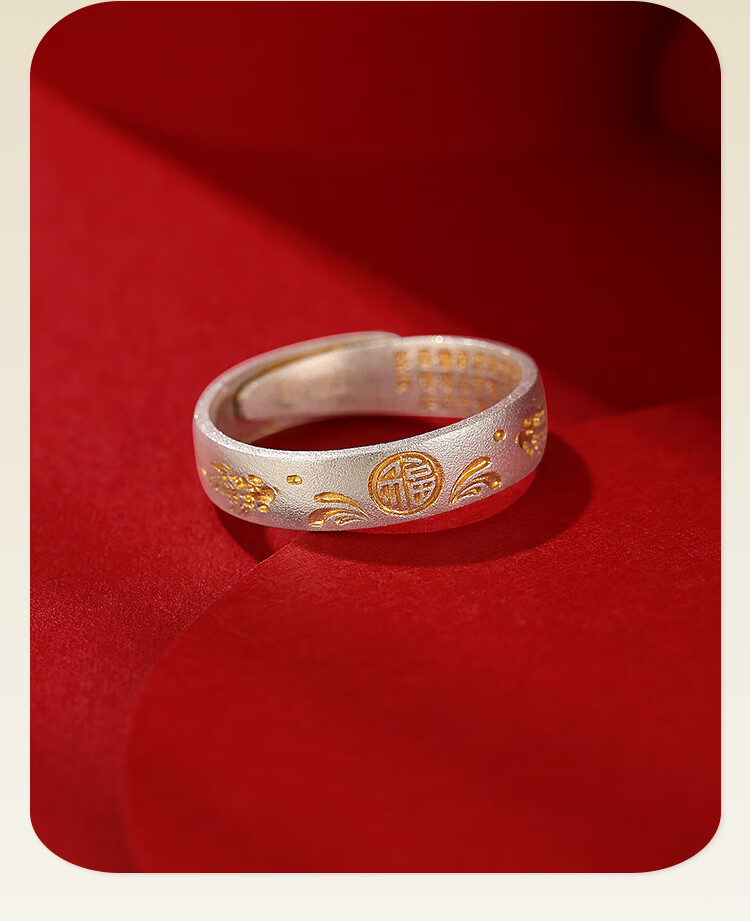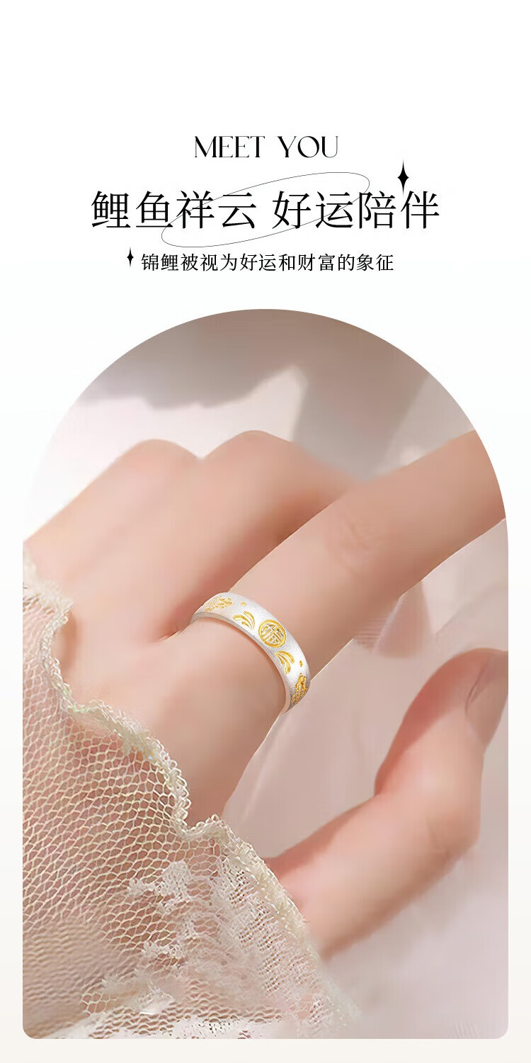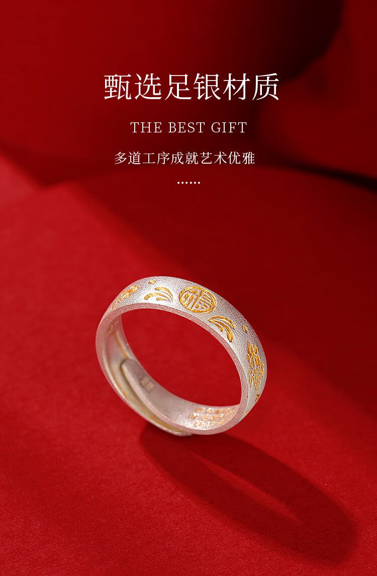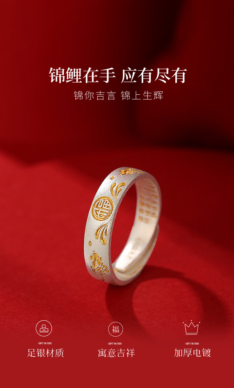 Lao Fengxiang's Auspicious Words Pure Silver Ring for Women, Couple Ring, Practical Living Birthday and Anniversary Gift for Girlfriend and Wife, Lucky Words Koi Single Ring, Free Brand Gift Box