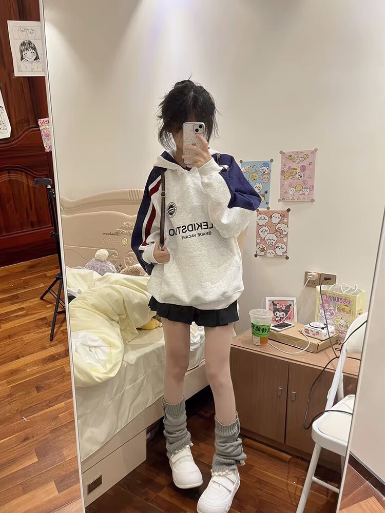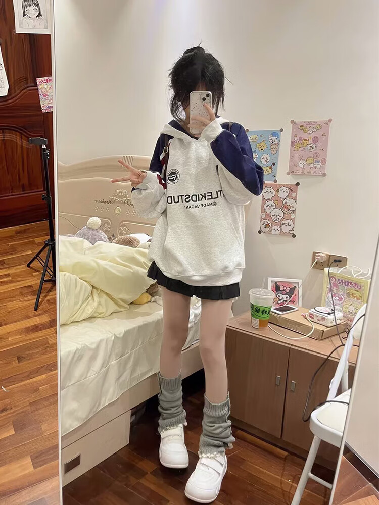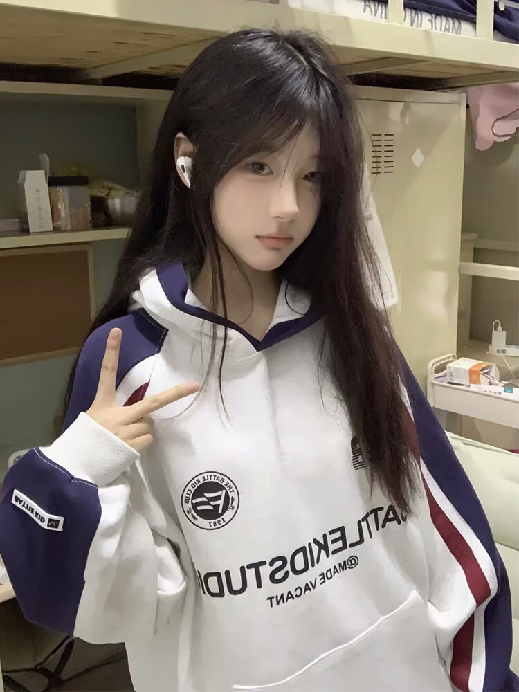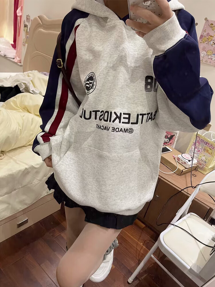 Cotton American heavy plug-in hooded color-blocked sweatshirt for women in autumn and winter new loose Korean style top hoodie plus velvet white gray 3240 plus velvet high quality 30 M 80-105Jin Jin is equal to 0.5 kg