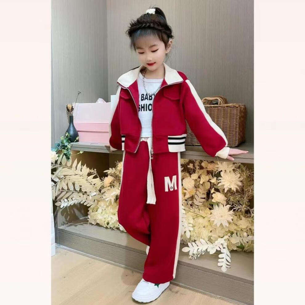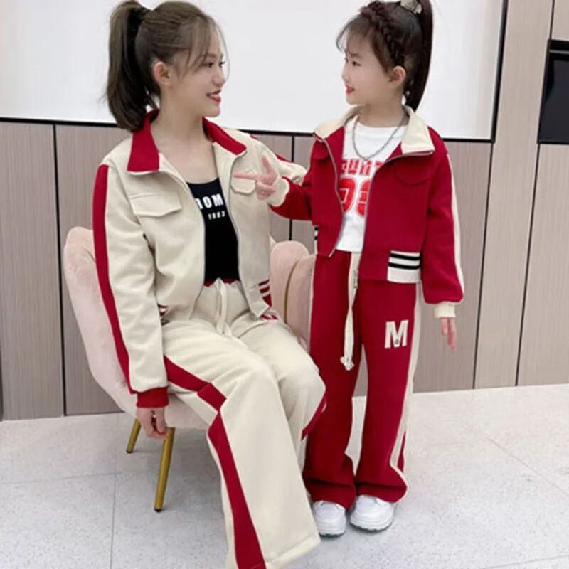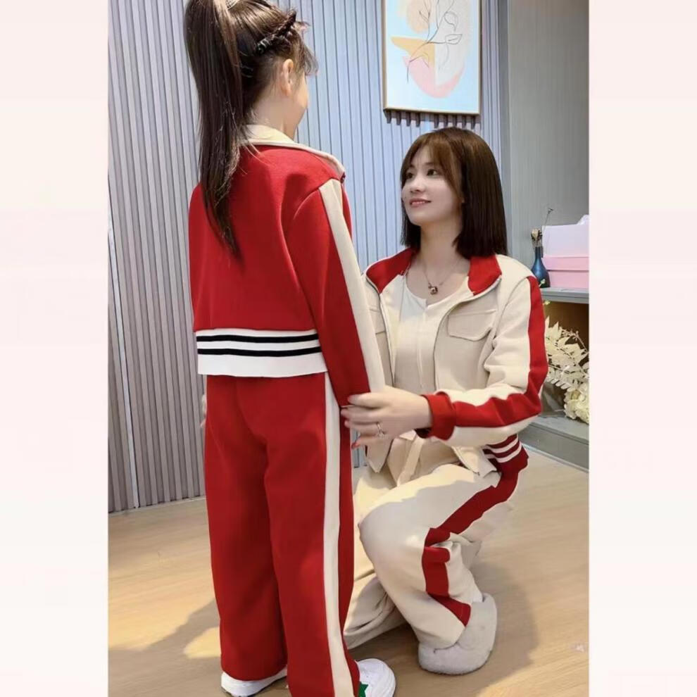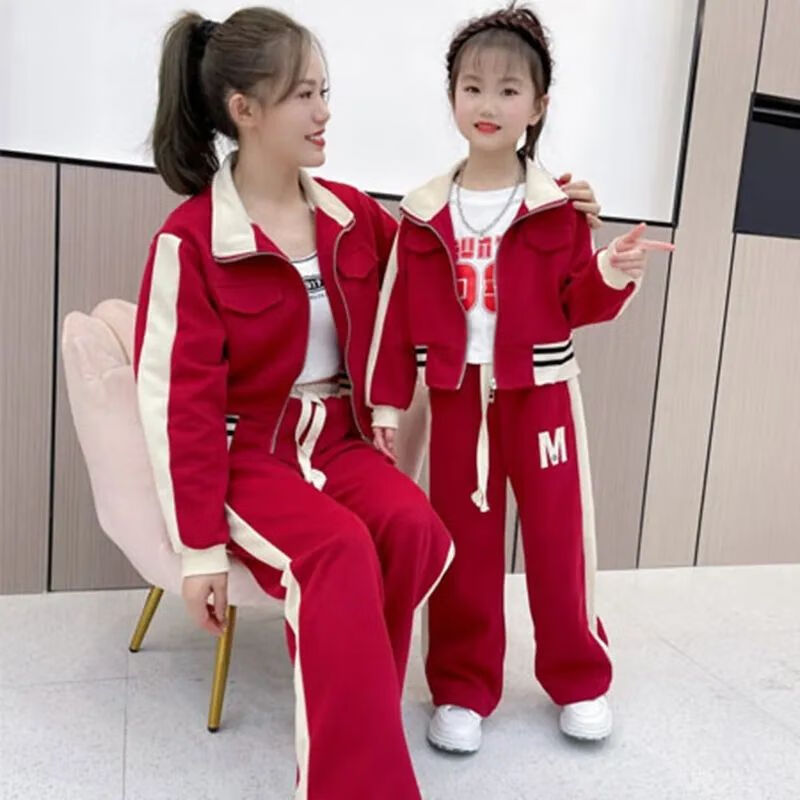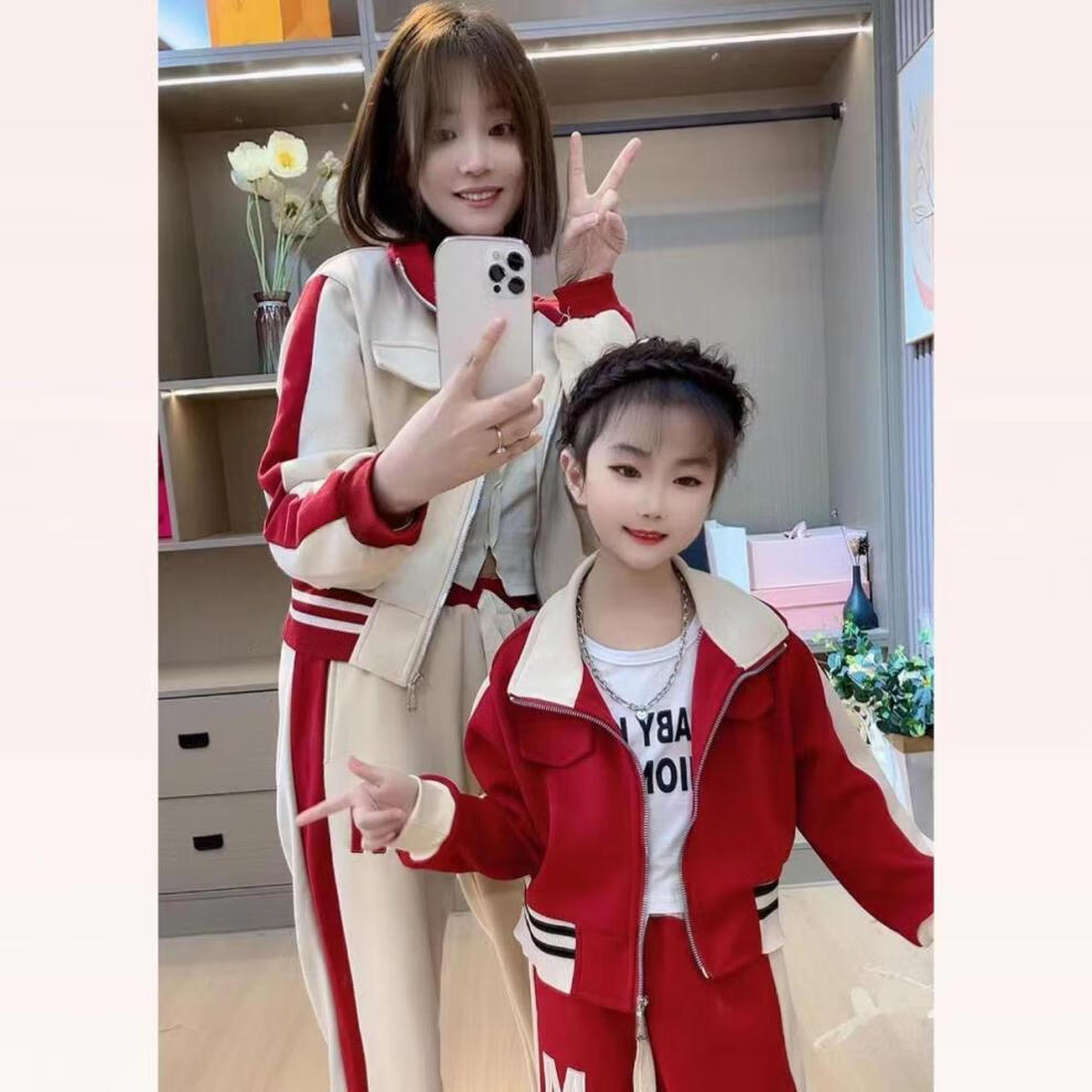 G.duck fried street parent-child wear 2025 new trendy spring and autumn style sports suit two-piece set different mother and daughter sweatshirt jacket red splicing suit 130 cm recommended 110~125 height