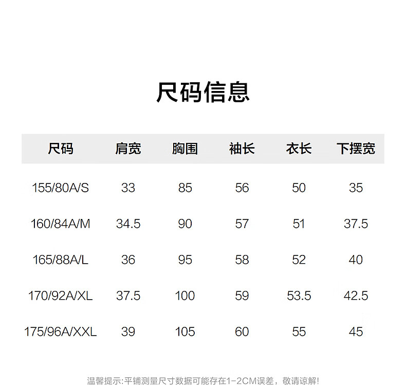 China (cm) 160-165/84-86 165-170 / 88-90 167-172 / 92-96 168-173 / 98-102 170-176 / 106-110