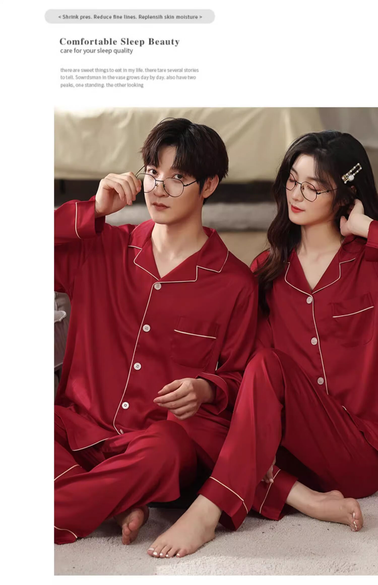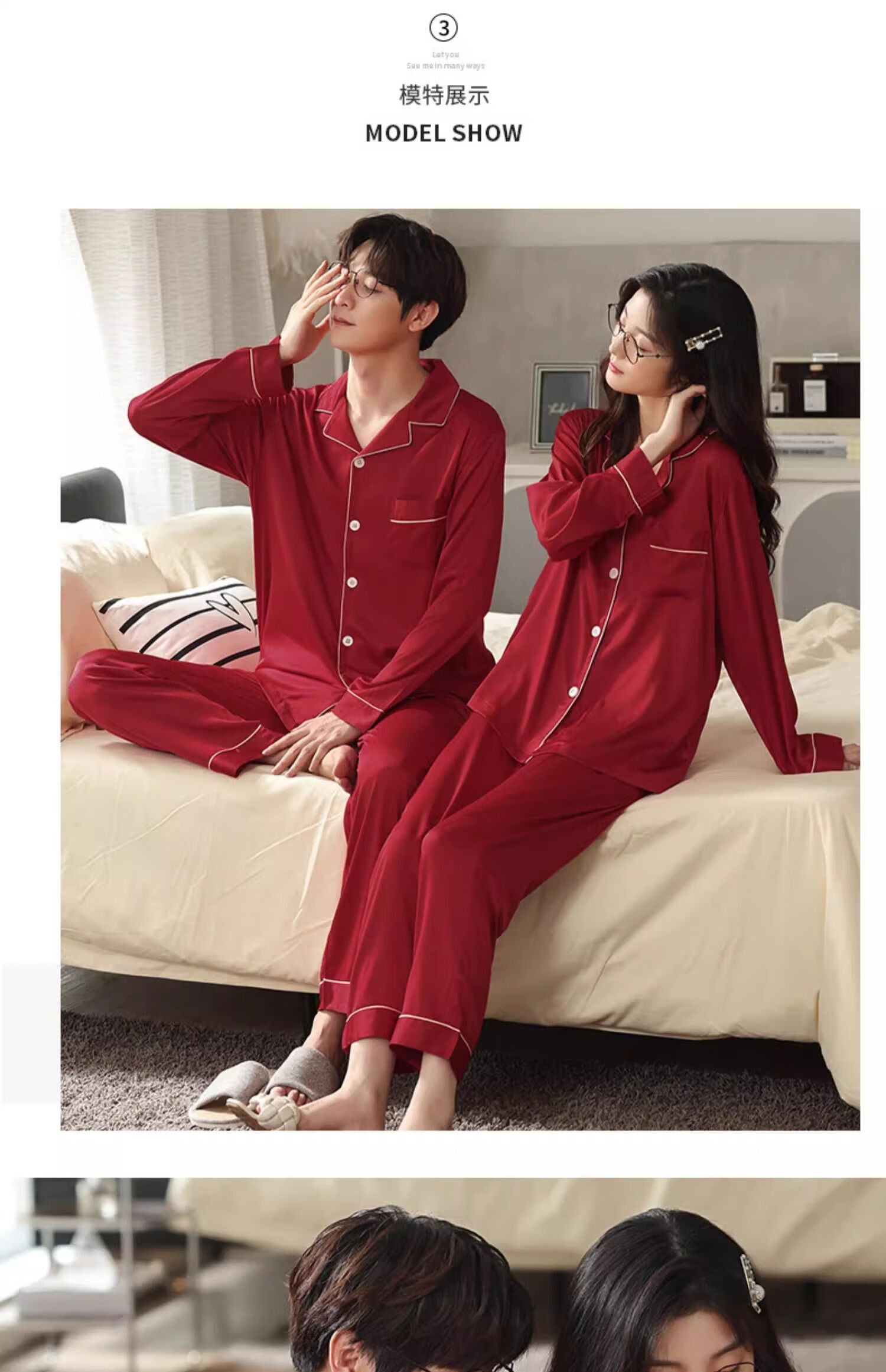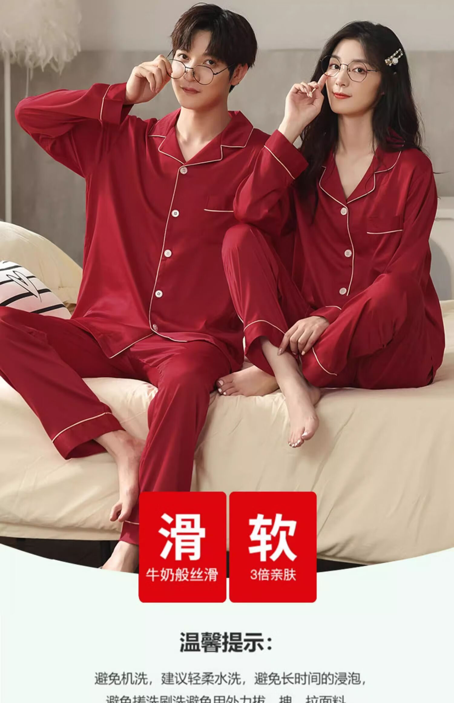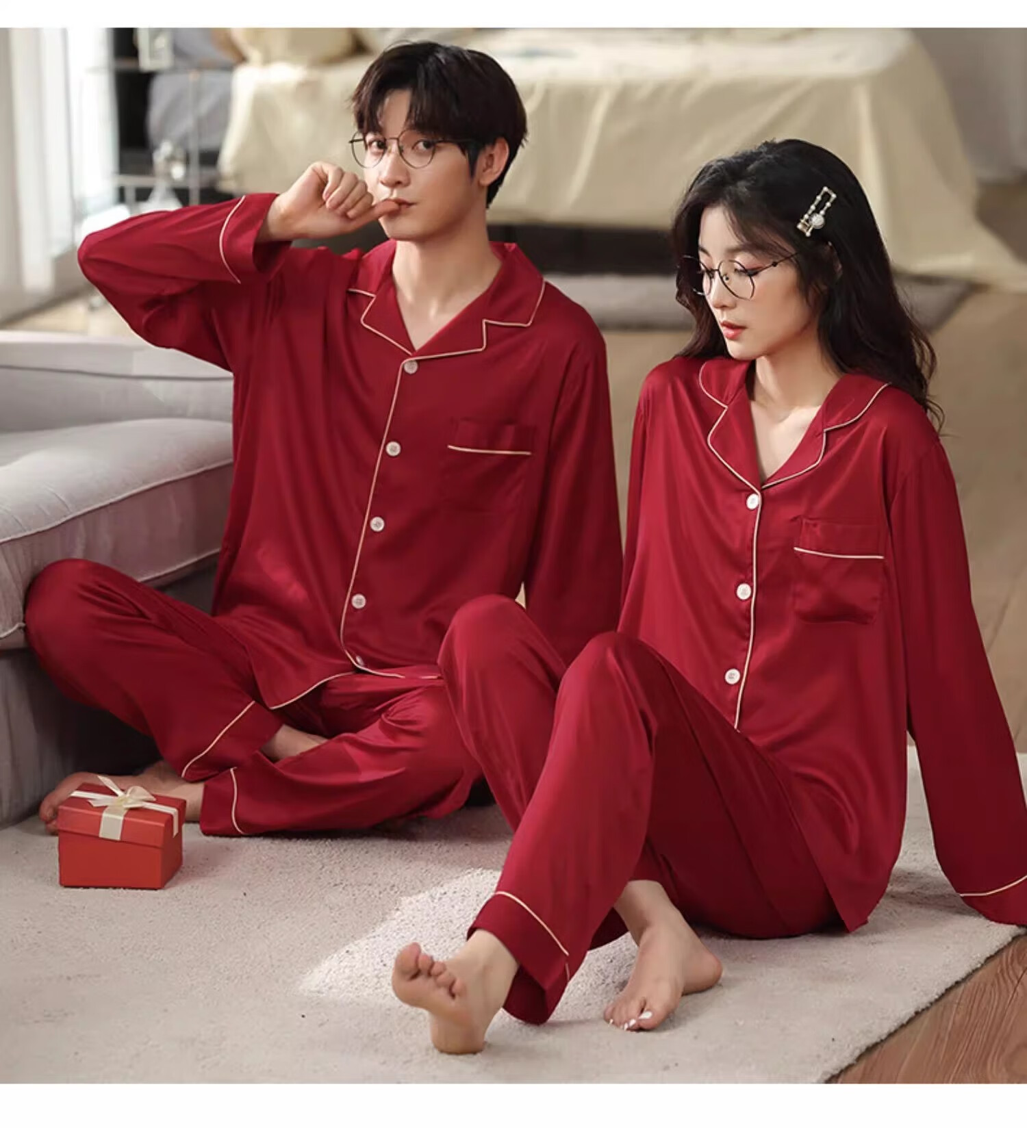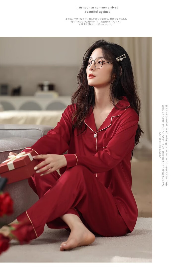LangSha pajamas couple set for one man and one woman, spring and autumn red ice silk long-sleeved New Year's wedding, natal year newlywed home set, two sets for couple, burgundy + burgundy 2XL, price for two sets, recommended 115-130 Jin Jin equals 0.5 kg