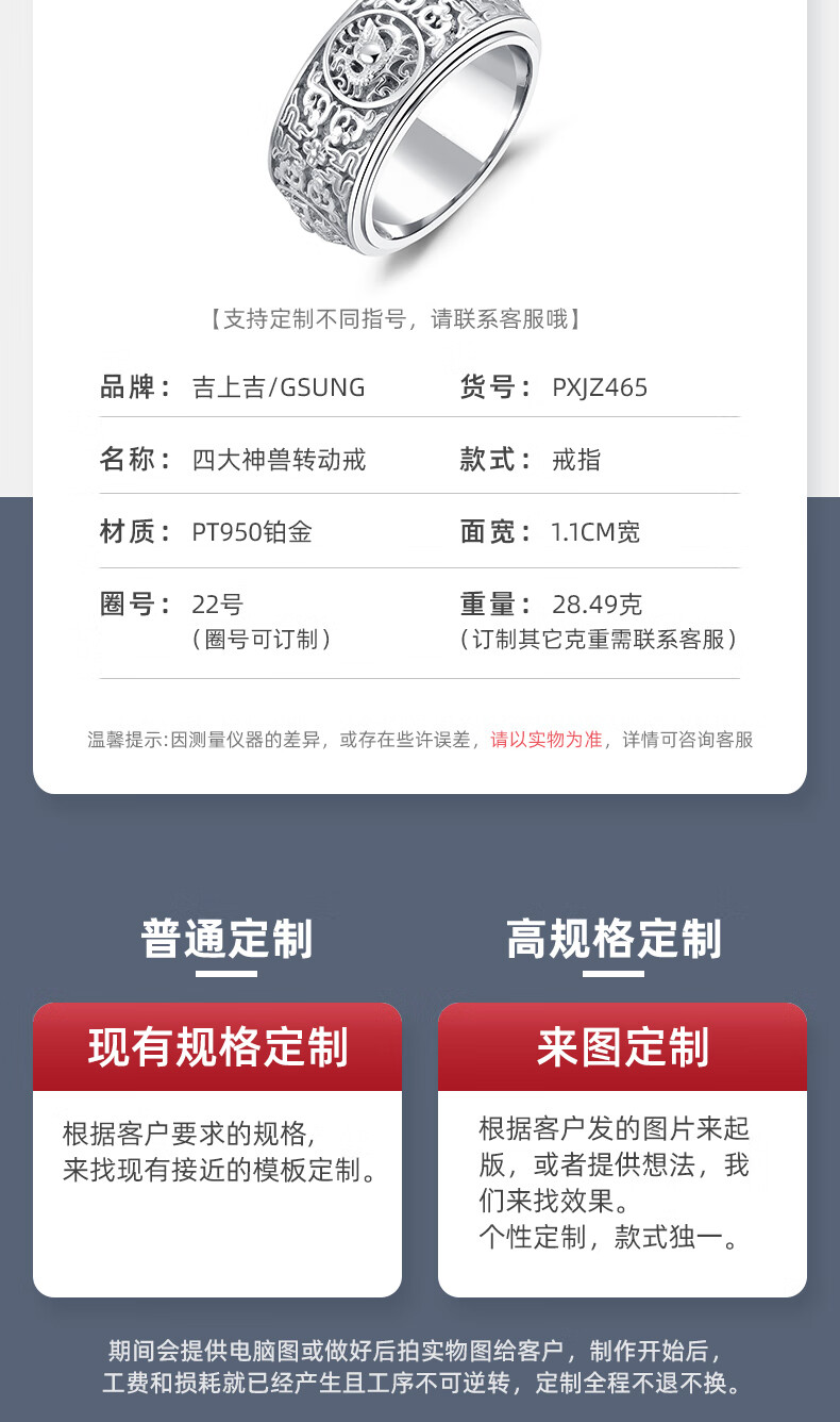 GsunG rotating platinum ring PT950 retro domineering ring four mythical beasts rotating men's wide-faced pure platinum ring. Priced by gram, please contact customer service before bidding.