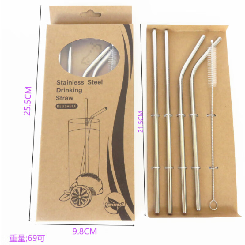 Lanshengjia four-pack household 304 stainless steel straws, food-grade cold drink straws, environmentally friendly and recyclable when going out, 304 stainless steel straws without box, 2 straight + 2 curved + 1 brush