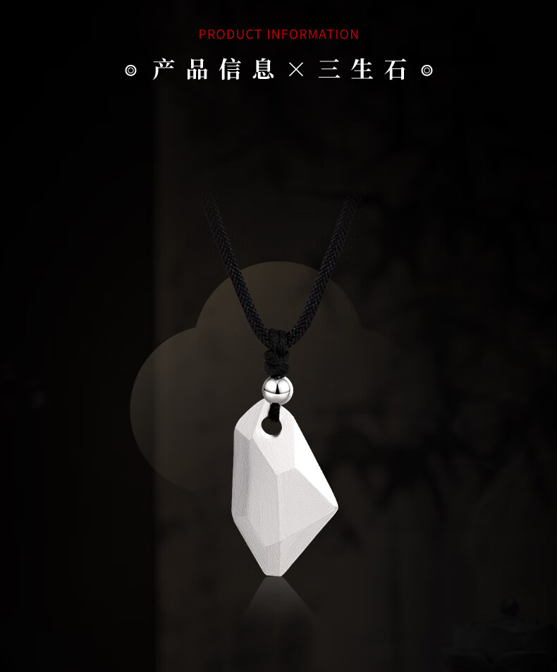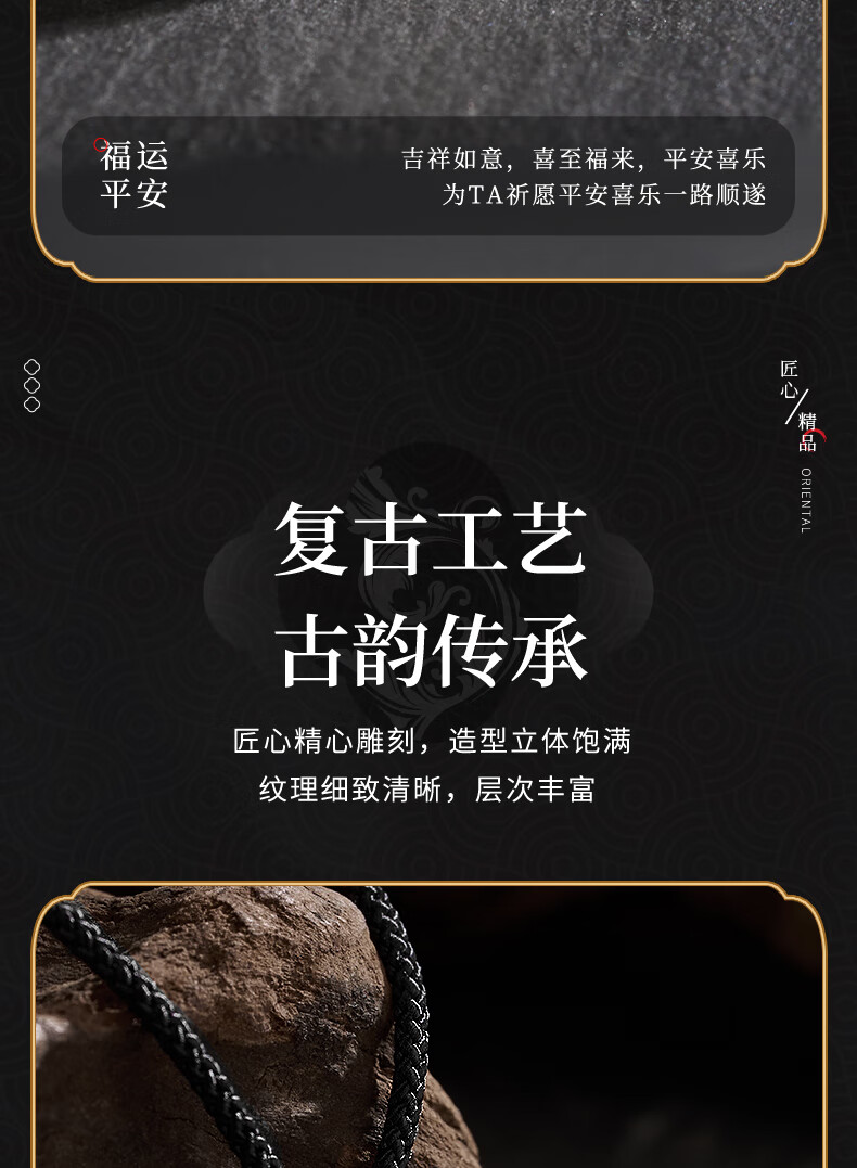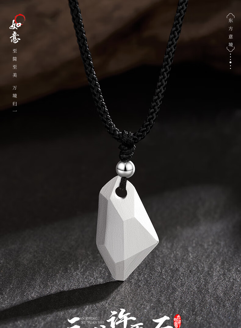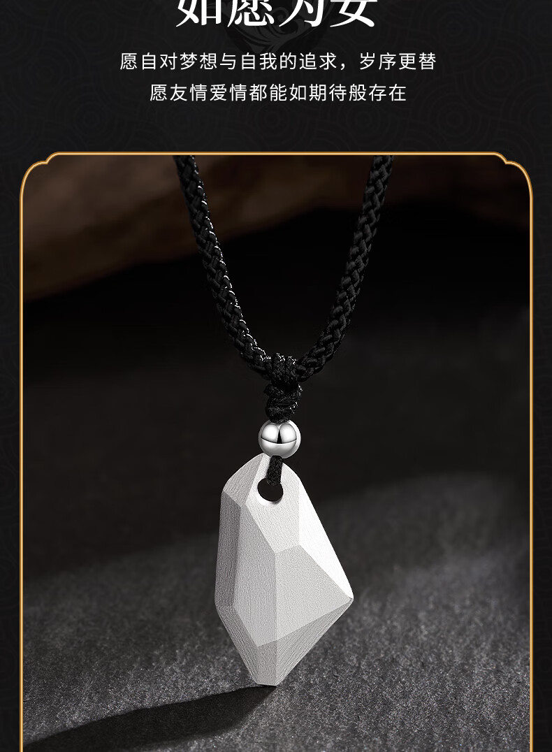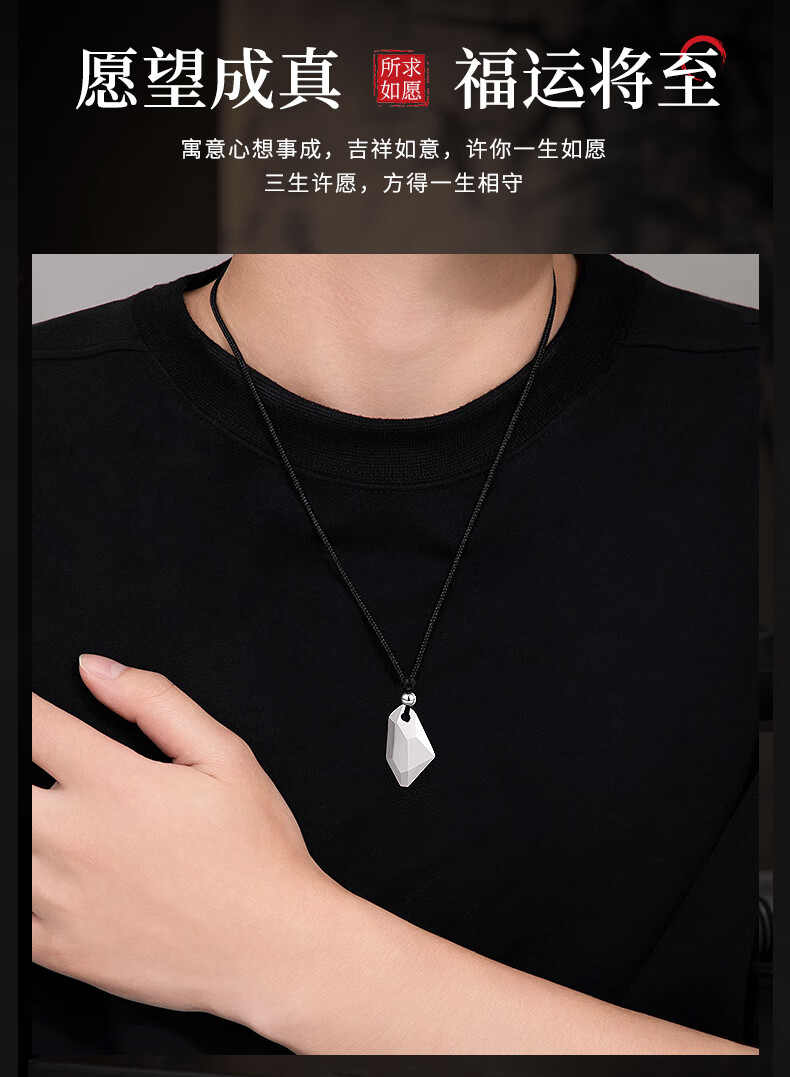 Lao Fengxiang Three Lives Stone Pure Silver Necklace Men's Wishing Stone Pendant Wedding Anniversary Birthday Gift for Boyfriend and Husband Pure Silver Three Lives Stone Braided Rope Necklace - Black